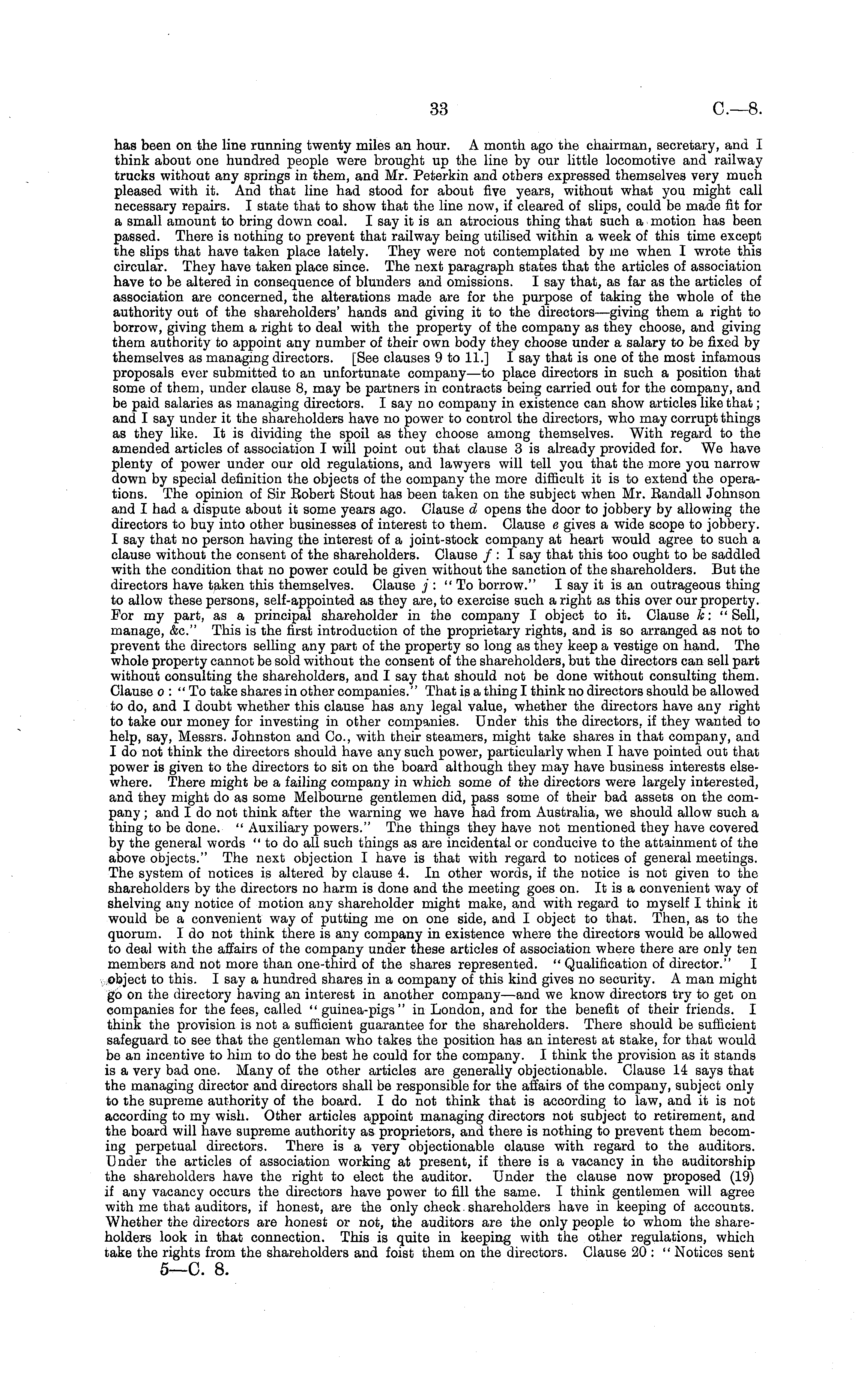 has been on the line running twenty miles an hour. A month ago the chairman, secretary, and I think about one hundred people were brought up the line by our little locomotive and railway trucks without any springs in them, and Mr. Peterkin and others expressed themselves very much pleased with it. And that line had stood for about five years, without what you might call necessary repairs. I state that to show that the line now, if cleared of slips, could be made fit for a small amount to bring down coal. I say it is an atrocious thing that such a motion has been passed. There is nothing to prevent that railway being utilised within a week of this time except the slips that have taken place lately. They were not contemplated by me when I wrote this circular. They have taken place since. The next paragraph states that the articles of association have to be altered in consequence of blunders and omissions. I say that, as far as the articles of association are concerned, the alterations made are for the purpose of taking the whole of the authority out of the shareholders' hands and giving it to the directors—giving them a right to borrow, giving them a right to deal with the property of the company as they choose, and giving them authority to appoint any number of their own body they choose under a salary to be fixed by themselves as managing directors. [See clauses 9to 11.] I say that is one of the most infamous proposals ever submitted to an unfortunate company—to place directors in such a position that some of them, under clause 8, may be partners in contracts being carried out for the company, and be paid salaries as managing directors. I say no company in existence can show articles like that; and I say under it the shareholders have no power to control the directors, who may corrupt things as they like. It is dividing the spoil as they choose among themselves. With regard to the amended articles of association I will point out that clause 3is already provided for. We have plenty of power under our old regulations, and lawyers will tell you that the more you narrow down by special definition the objects of the company the more difficult it is to extend the operations. The opinion of Sir Robert Stout has been taken on the subject when Mr. Randall Johnson and I had a dispute about it some years ago. Clause d opens the door to jobbery by allowing the directors to buy into other businesses of interest to them. Clause c gives a wide scope to jobbery. I say that no person having the interest of a joint-stock company at heart would agree to such a clause without the consent of the shareholders. Clause / : I say that this too ought to be saddled with the condition that no power could be given without the sanction of the shareholders. But the directors have taken this themselves. Clause j : "To borrow." I say it is an outrageous thing to allow these persons, self-appointed as they are, to exercise such aright as this over our property. For my part, as a principal shareholder in the company I object to it. Clause k: "Sell, manage, &c." This is the first introduction of the proprietary rights, and is so arranged as not to prevent the directors selling any part of the property so long as they keep a vestige on hand. The whole property cannot be sold without the consent of the shareholders, but the directors can sell part without consulting the shareholders, and I say that should not be done without consulting them. Clause o : "To take shares in other companies." That is a thing I think no directors should be allowed to do, and I doubt whether this clause has any legal value, whether the directors have any right to take our money for investing in other companies. Under this the directors, if they wanted to help, say, Messrs. Johnston and Co., with their steamers, might take shares in that company, and I do not think the directors should have any such power, particularly when I have pointed out that power is given to the directors to sit on the board although they may have business interests elsewhere. There might be a failing company in which some of the directors were largely interested, and they might do as some Melbourne gentlemen did, pass some of their bad assets on the company ; and I do not think after the warning we have had from Australia, we should allow such a thing to be done. " Auxiliary powers." The things they have not mentioned they have covered by the general words "to do all such things as are incidental or conducive to the attainment of the above objects." The next objection I have is that with regard to notices of general meetings. The system of notices is altered by clause 4. In other words, if the notice is not given to the shareholders by the directors no harm is done and the meeting goes on. It is a convenient way of shelving any notice of motion any shareholder might make, and with regard to myself I think it would be a convenient way of putting me on one side, and I object to that. Then, as to the quorum. Ido not think there is any company in existence where the directors would be allowed to deal with the affairs of the company under these articles of association where there are only ten members and not more than one-third of the shares represented. " Qualification of director." I object to this. I say a hundred shares in a company of this kind gives no security. A man might go on the directory having an interest in another company—and we know directors try to get on companies for the fees, called "guinea-pigs" in London, and for the benefit of their friends. I think the provision is not a sufficient guarantee for the shareholders. There should be sufficient safeguard to see that the gentleman who takes the position has an interest at stake, for that would be an incentive to him to do the best he could for the company. I think the provision as it stands is a very bad one. Many of the other articles are generally objectionable. Clause 14 says that the managing director