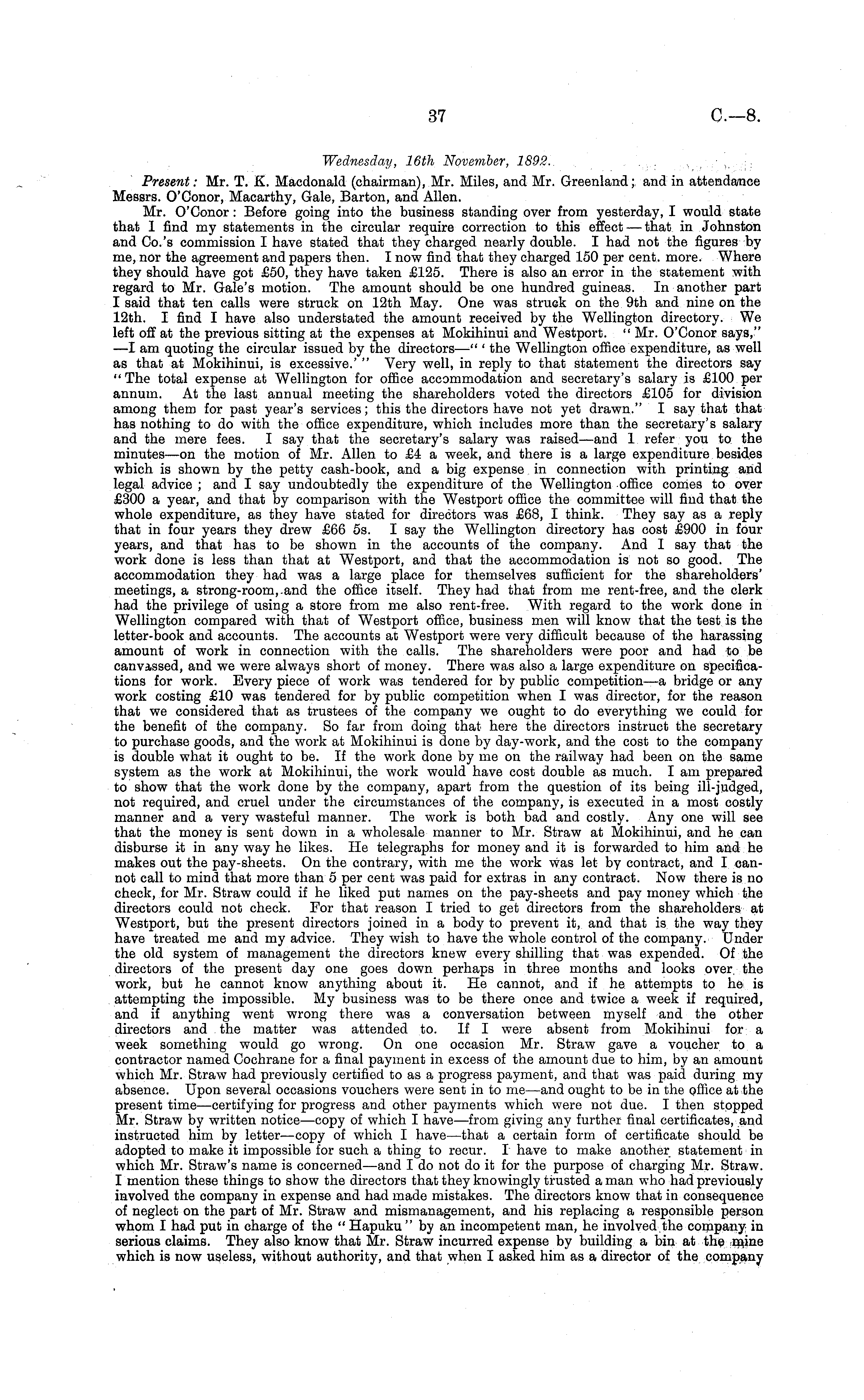 Wednesday, 16th November, 1892.. Present: Mr. T. K. Macdonald (chairman), Mr. Miles, and Mr. Greenland; and in attendance Messrs. O'Conor, Macarthy, Gale, Barton, and Allen. Mr. O'Conor: Before going into the business standing over from yesterday, I would state that 1 find my statements in the circular require correction to this effect — that in Johnston and Co.'s commission I have stated that they charged nearly double. I had not the figures by me, nor the agreement and papers then. I now find that they charged 150 per cent. more. Where they should have got £50, they have taken £125. There is also an error in the statement with regard to Mr. Gale's motion. The amount should be one hundred guineas. In another part I said that ten calls were struck on 12th May. One was struck on the 9th and nine on the 12th. I find I have also understated the amount received by the Wellington directory. We left off at the previous sitting at the expenses at Mokihinui and Westport. " Mr. O'Conor says," —I am quoting the circular issued by the directors—" ' the Wellington office expenditure, as well as that at Mokihinui, is excessive.' " Very well, in reply to that statement the directors say " The total expense at Wellington for office accommodation and secretary's salary is £100 per annum. At the last annual meeting the shareholders voted the directors £105 for division among them for past year's services; this the directors have not yet drawn." I say that that has nothing to do with the office expenditure, which includes more than the secretary's salary and the mere fees. I say that the secretary's salary was raised—and 1 refer you to the minutes—on the motion of Mr. Allen to £4 a week, and there is a large expenditure besides which is shown by the petty cash-book, and a big expense in connection with printing and legal advice ; and I say undoubtedly the expenditure of the Wellington office comes to over £300 a year, and that by comparison with the Westport office the committee will find that the whole expenditure, as they have stated for directors was £68, I think. They say as a reply that in four years they drew £66 ss. I say the Wellington directory has cost £900 in four years, and that has to be shown in the accounts of the company. And I say that the work done is less than that at Westport, and that the accommodation is not so good. The accommodation they had was a large place for themselves sufficient for the shareholders' meetings, a strong-room,.and the office itself. They had that from me rent-free, and the clerk had the privilege of using a store from me also rent-free. With regard to the work done in Wellington compared with that of Westport office, business men will know that the test is the letter-book and accounts. The accounts at Westport were very difficult because of the harassing amount of work in connection with the calls. The shareholders were poor and had to be canvassed, and we were always short of money. There was also a large expenditure on specifications for work. Every piece of work was tendered for by public competition—a bridge or any work costing £10 was tendered for by public competition when I was director, for the reason that we considered that as trustees of the company we ought to do everything we could for the benefit of the company. So far from doing that here the directors instruct the secretary to purchase goods, and the work at Mokihinui is done by day-work, and the cost to the company is double what it ought to be. If the work done by me on the railway had been on the same system as the work at Mokihinui, the work would have cost double as much. lam prepared to show that the work done by the company, apart from the question of its being ill-judged, not required, and cruel under the circumstances of the company, is executed in a most costly manner and a very wasteful manner. The work is both bad and costly. Any one will see that the money is sent down in a wholesale manner to Mr. Straw at Mokihinui, and he can disburse it in any way he likes. He telegraphs for money and it is forwarded to him and he makes out the pay-sheets. On the contrary, with me the work was let by contract, and I cannot call to mind that more than 5 per cent was paid for extras in any contract. Now there is no check, for Mr. Straw could if he liked put names on the pay-sheets and pay money which the directors could not check. For that reason I tried to get directors from the shareholders at Westport, but the present directors joined in a body to prevent it, and that is the way they have treated me and my advice. They wish to have the whole control of the company. Under the old system of management the directors knew every shilling that was expended. Of the directors of the present day one goes down perhaps in three months and looks over, the work, but he cannot know anything about it. He cannot, and if he attempts to he is attempting the impossible. My business was to be there once and twice a week if required, and if anything went wrong there was a conversation between myself and the other directors and the matter was attended to. If I were absent from Mokihinui for a week something would go wrong. On one occasion Mr. Straw gave a voucher to a contractor named Cochrane for a final payment in excess of the amount due to him, by an amount which Mr. Straw had previously certified to as a progress payment, and that was paid during my absence. Upon several occasions vouchers were sent in to me —and ought to be in the office at the present time—certifying for progress and other payments which were not due. I then stopped Mr. Straw by written notice —copy of which I hay giving any further final certificates, and instructed him by letter —copy of which I hay a certain form of certificate should be adopted to make it impossible for such a thing to recur. I" have to make another statement in which Mr. Straw's name is concerned—and I do not do it for the purpose of chargin