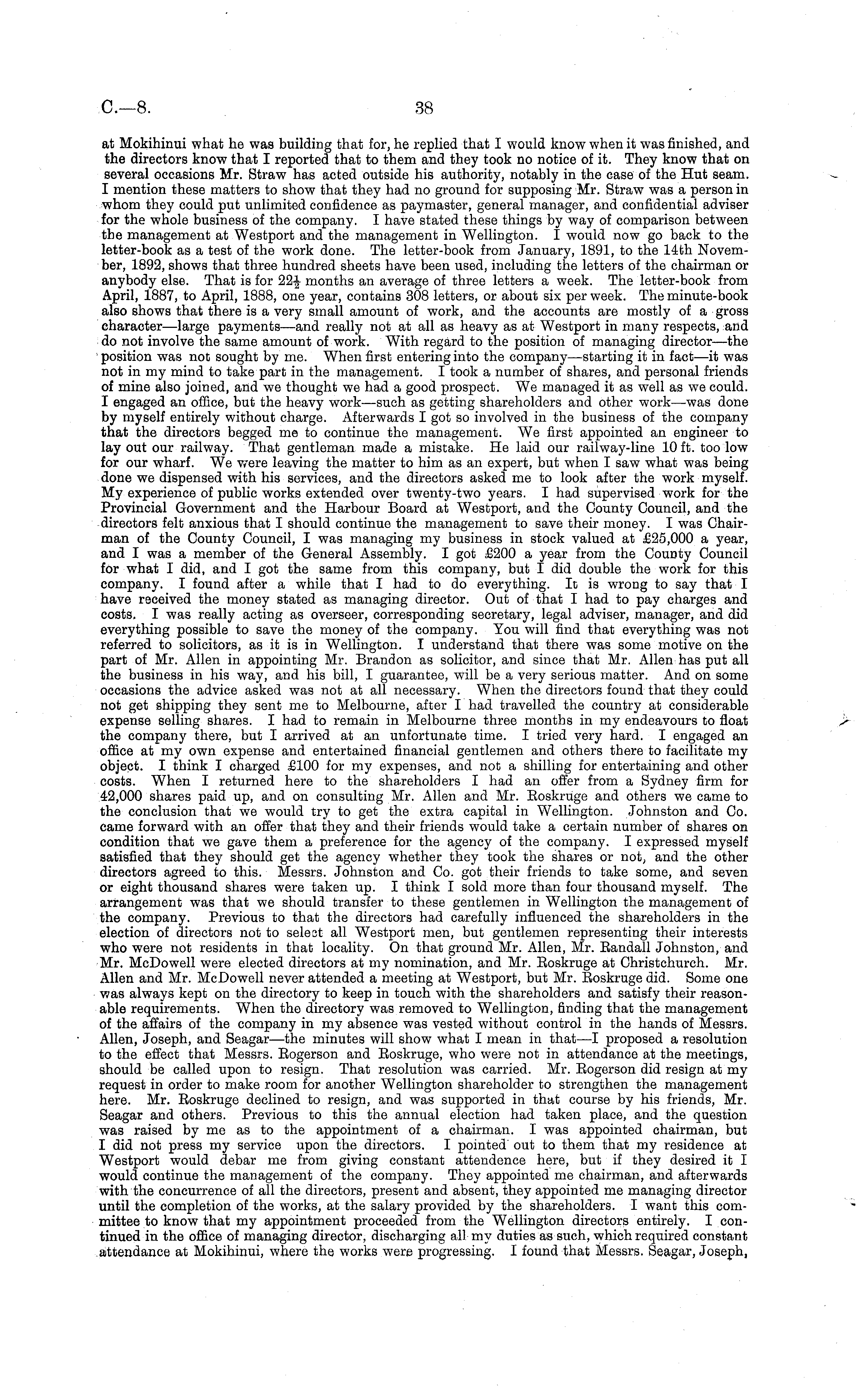 at Mokihinui what he was building that for, he replied that I would know when it was finished, and the directors know that I reported that to them and they took no notice of it. They know that on several occasions Mr. Straw has acted outside his authority, notably in the case of the Hut seam. I mention these matters to show that they had no ground for supposing Mr. Straw was a person in whom they could put unlimited confidence as paymaster, general manager, and confidential adviser for the whole business of the company. I have stated these things by way of comparison between the management at Westport and the management in Wellington. I would now go back to the letter-book as a test of the work done. The letter-book from January, 1891, to the 14th November, 1892, shows that three hundred sheets have been used, including the letters of the chairman or anybody else. That is for 22-| months an average of three letters a week. The letter-book from April, 1887, to April, 1888, one year, contains 308 letters, or about six per week. The minute-book also shows that there is a very small amount of work, and the accounts are mostly of a gross character—large payments—and really not at all as heavy as at Westport in many respects, and do not involve the same amount of work. With regard to the position of managing director—the 1 position was not sought by me. When first entering into the company —starting it in fact—it was not in my mind to take part in the management. I took a number of shares, and personal friends of mine also joined, and we thought we had a good prospect. We managed it as well as we could. I engaged an office, but the heavy work—such as getting shareholders and other work—was done by myself entirely without charge. Afterwards I got so involved in the business of the company that the directors begged me to continue the management. We first appointed an engineer to lay out our railway. That gentleman made a mistake. He laid our railway-line 10 ft. too low for our wharf. We were leaving the matter to him as an expert, but when I saw what was being done we dispensed with his services, and the directors asked me to look after the work myself. My experience of public works extended over twenty-two years. I had supervised work for the Provincial Government and the Harbour Board at Westport, and the County Council, and the directors felt anxious that I should continue the management to save their money. I was Chairman of the County Council, I was managing my business in stock valued at £25,000 a year, and I was a member of the General Assembly. I got £200 a year from the County Council for what I did, and I got the same from this company, but I did double the work for this company. I found after a while that I had to do everything. It is wrong to say that I have received the money stated as managing director. Out of that I had to pay charges and costs. I was really acting as overseer, corresponding secretary, legal adviser, manager, and did everything possible to save the money of the company. You will find that everything was not referred to solicitors, as it is in Wellington. I understand that there was some motive on the part of Mr. Allen in appointing Mr. Brandon as solicitor, and since that Mr. Allen has put all the business in his way, and his bill, I guarantee, will be a very serious matter. And on some occasions the advice asked was not at all necessary. When the directors found that they could not get shipping they sent me to Melbourne, after I had travelled the country at considerable expense selling shares. I had to remain in Melbourne three months in my endeavours to float the company there, but I arrived at an unfortunate time. I tried very hard. I engaged an office at my own expense and entertained financial gentlemen and others there to facilitate my object. I think I charged £100 for my expenses, and not a shilling for entertaining and other costs. When I returned here to the shareholders I had an offer from a Sydney firm for 42,000 shares paid up, and on consulting Mr. Allen and Mr. Eoskruge and others we came to the conclusion that we would try to get the extra capital in Wellington. Johnston and Co. came forward with an offer that they and their friends would take a certain number of shares on condition that we gave them a preference for the agency of the company. I expressed myself satisfied that they should get the agency whether they took the shares or not, and the other directors agreed to this. Messrs. Johnston and Co. got their friends to take some, and seven or eight thousand shares were taken up. I think I sold more than four thousand myself. The arrangement was that we should transfer to these gentlemen in Wellington the management of the company. Previous to that the directors had carefully influenced the shareholders in the election of directors not to select all Westport men, but gentlemen representing their interests who were not residents in that locality. On that ground Mr. Allen, Mr. Eandall Johnston, and Mr. McDowell were elected directors at my nomination, and Mr. Roskruge at Christchurch. Mr. Allen and Mr. McDowell never attended a meeting at Westport, but Mr. Roskruge did. Some one was always kept on the directory to keep in touch with the shareholders and satisfy their reasonable requirements. When the directory was removed to Wellington, finding that the management of the affairs of the company in my absence was vested without control in the hands of Messrs. Allen, Joseph, and Seagar—the minutes will show what I mean in that —I proposed a resolution to the effect that Messrs. Rogerson and Roskruge, who were not in attendance at the meetings, should be called upon to resign. That resolution was carried. Mr. Rogerson did resign at my request in order to make room for another Wellington shareholder to strengthen the management here. Mr. Roskruge declined to resign, and was supported in that course by his friends, Mr. Seagar and o