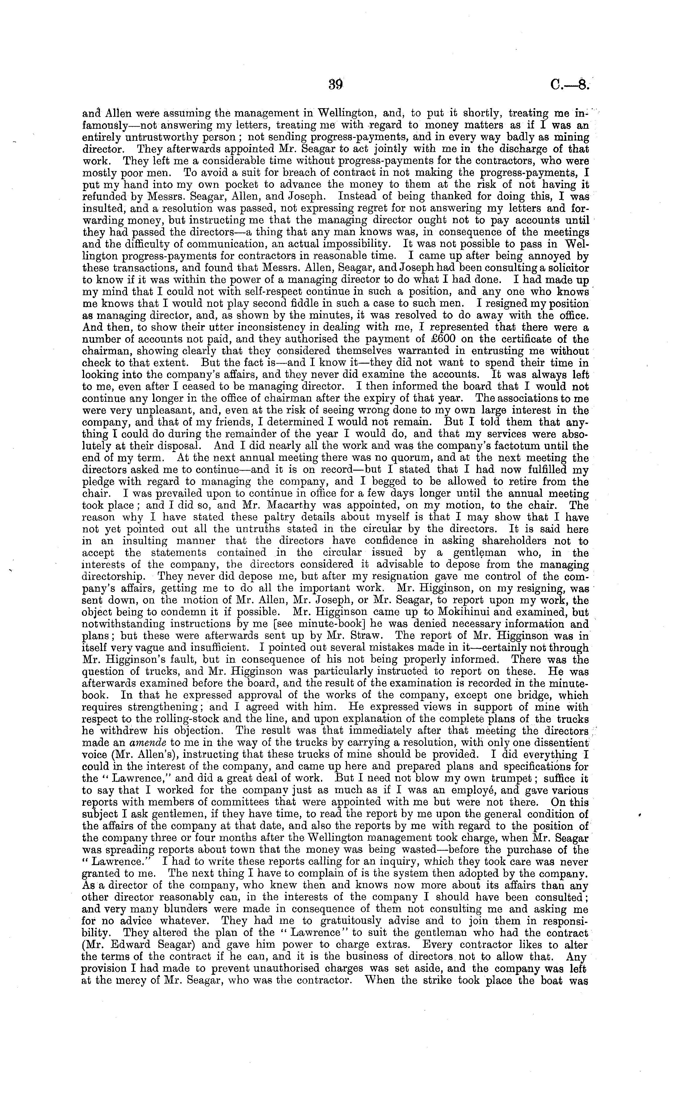 and Allen were assuming the management in Wellington, and, to put it shortly, treating me infamously—not answering my letters, treating me with regard to money matters as if I was an entirely untrustworthy person ; not sending progress-payments, and in every way badly as mining director. They afterwards appointed Mr. Seagar to act jointly with me in the discharge of that work. They left me a considerable time without progress-payments for the contractors, who were mostly poor men. To avoid a suit for breach of contract in not making the progress-payments, I put my hand into my own pocket to advance the money to them at the risk of not having it refunded by Messrs. Seagar, Allen, and Joseph. Instead of being thanked for doing this, I was insulted, and a resolution was passed, not expressing regret for not answering my letters and forwarding money, but instructing me that the managing director ought not to pay accounts until they had passed the directors —a thing that any man knows was, in consequence of the meetings and the difficulty of communication, an actual impossibility. It was not possible to pass in Wellington progress-payments for contractors in reasonable time. I came up after being annoyed by these transactions, and found that Messrs. Allen, Seagar, and Joseph had been consulting a solicitor to know if it was within the power of a managing director to do what I had done. I had made up my mind that I could not with self-respect continue in such a position, and any one who knows me knows that I would not play second fiddle in such a case to such men. I resigned my position as managing director, and, as shown by the minutes, it was resolved to do away with the office. And then, to show their utter inconsistency in dealing with me, I represented that there were a number of accounts not paid, and they authorised the payment of £600 on the certificate of the chairman, showing clearly that they considered themselves warranted in entrusting me without check to that extent. But the fact is—and I know it—they did not want to spend their time in looking into the company's affairs, and they never did examine the accounts. It was always left to me, even after I ceased to be managing director. I then informed the board that I would not continue any longer in the office of chairman after the expiry of that year. The associations to me were very unpleasant, and, even at the risk of seeing wrong done to my own large interest in the company, and that of my friends, I determined I would not remain. But I told them that anything I could do during the remainder of the year I would do, and that my services were absolutely at their disposal. And I did nearly all the work and was the company's factotum until the end of my term. At the next annual meeting there was no quorum, and at the next meeting the directors asked me to continue—and it is on record—but I stated that I had now fulfilled my pledge with regard to managing the company, and I begged to be allowed to retire from the chair. I was prevailed upon to continue in office for a few days longer until the annual meeting took place; and I did so, and Mr. Macarthy was appointed, on my motion, to the chair. The reason why I have stated these paltry details about myself is that I may show that I have not yet pointed out all the untruths stated in the circular by the directors. It is said here in an insulting manner that the directors have confidence in asking shareholders not to accept the statements contained in the circular issued by a gentleman who, in the interests of the company, the directors considered it advisable to depose from the managing directorship. They never did depose me, but after my resignation gave me control of the company's affairs, getting me to do all the important work. Mr. Higginson, on my resigning, was sent down, on the motion of Mr. Allen, Mr. Joseph, or Mr. Seagar, to report upon my work, the object being to condemn it if possible. Mr. Higginson came up to Mokihinui and examined, but notwithstanding instructions by me [see minute-book] he was denied necessary information and plans; but these were afterwards sent up by Mr. Straw. The report of Mr. Higginson was in itself very vague and insufficient. I pointed out several mistakes made in it—certainly not through Mr. Higginson's fault, but in consequence of his not being properly informed. There was the question of trucks, and Mr. Higginson was particularly instructed to report on these. He was afterwards examined before the board, and the result of the examination is recorded in the minutebook. In that he expressed approval of the works of the company, except one bridge, which requires strengthening; and I agreed with him. He expressed views in support of mine with respect to the rolling-stock and the line, and upon explanation of the complete plans of the trucks he withdrew his objection. The result was that immediately after that meeting the directors made an amende to me in the way of the trucks by carrying a resolution, with only one dissentient voice (Mr. Allen's), instructing that these trucks of mine should be provided. I did everything I could in the interest of the company, and came up here and prepared plans and specifications for the " Lawrence," and did a great deal of work. But I need not blow my own trumpet; suffice it to say that I worked for the company just as much as if I was an employe, and gave various reports with members of committees that were appointed with me but were not there. On this subject I ask gentlemen, if they have time, to read the report by me upon the general condition of the affairs of the company at that date, and also the reports by me with regard to the position of the company three or four months after the Wellington management took charge, when Mr. Seagar was spreading reports about town that the money was being wasted —before the purchase of the " Lawrence." I had to write these reports calling for an inquiry, 