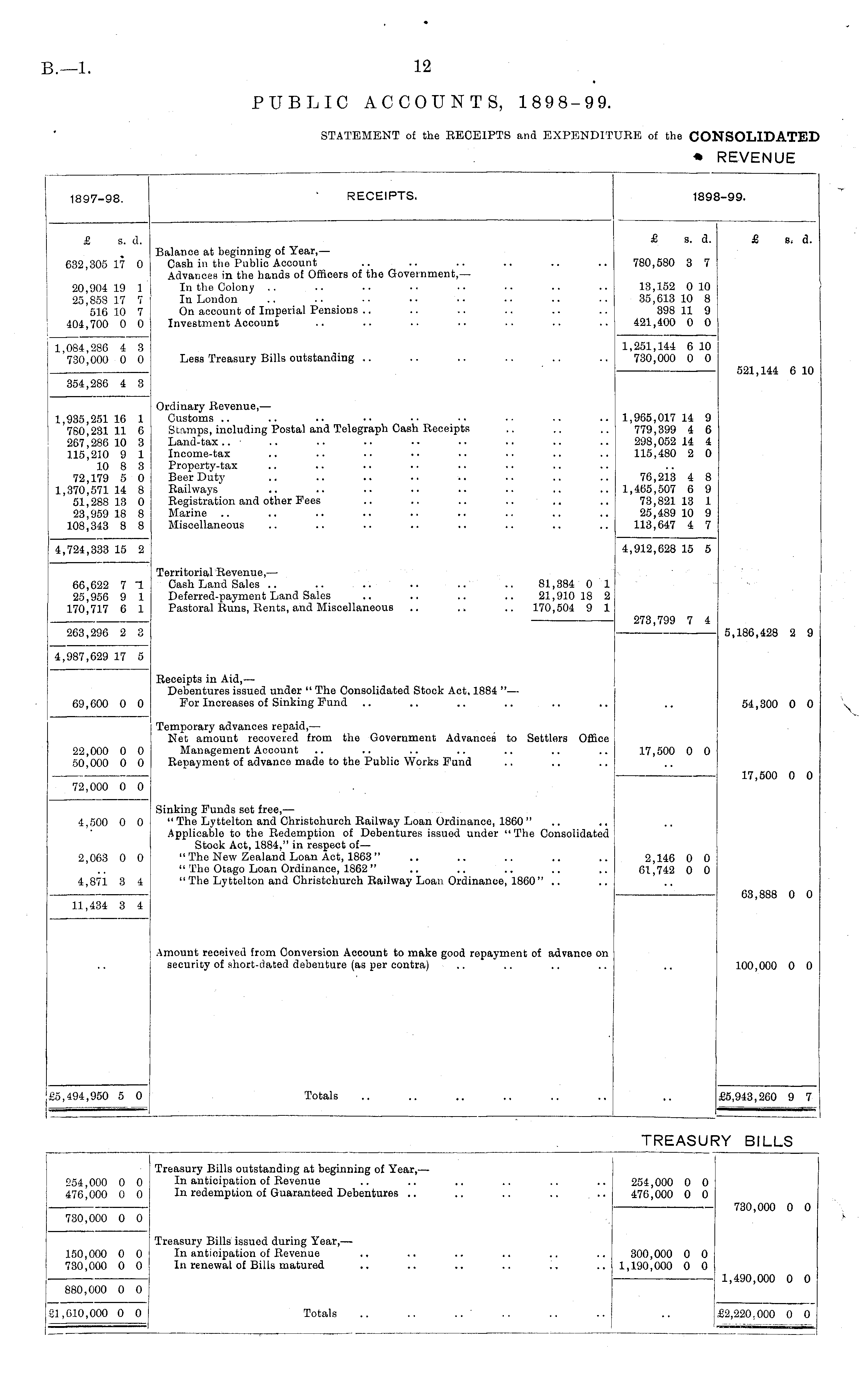 1897-98. 1-99. £ s. d. £ s. d. £ s. d. 632,305 17 0 20,904 19 1 25,858 17 7 516 10 7 404,700 0 0 Balance at beginning of Year, — Cash in the Public Account Advances in the hands of Officers of the Government,— In the Colony In London On account of Imperial Pensions Investment Account 780,580 3 7 13,152 0 10 35,613 10 8 398 11 9 421,400 0 0 1,084,286 4 3 730,000 0 0 Less Treasury Bills outstanding 1,251,144 6 10 730,000 0 0 521,144 6 10 354,286 4 3 Ordinary Revenue, — Customs Scamps, including Postal and Telegraph Cash Receipts Land-tax Income-tax Property-tax Beer Duty Railways Registration and other Fees Marine Miscellaneous 1,935,251 16 1 780,231 11 6 267,286 10 3 115,210 9 1 10 8 3 72,179 5 0 1,370,571 14 8 51,288 13 0 23,959 18 8 108,343 8 8 1,965,017 14 9 779,399 4 6 298,052 14 4 115,480 2 0 76,213 4 8 1,465,507 6 9 73,821 13 1 25,489 10 9 113,647 4 7 4,724,333 15 2 Territorial Revenue, — Cash Land Sales .. .. .. .. .. .. 81,384 0 1 Deferred-payment Land Sales .. .. .. .. 21,910 18 2 Pastoral Runs, Rents, and Miscellaneous .. .. .. 170,504 9 1 4,912,628 15 5 66,622 7 1 25,956 9 1 170,717 6 1 273,799 7 4 263,296 2 3 5,186,428 2 9 4,987,629 17 5 Receipts in Aid, — Debentures issued under " The Consolidated Stock Act, 1884 " — For Increases of Sinking Fund 54,300 0 0 69,600 0 0 Temporary advances repaid,— Net amount recovered from the Government Advances to Settlers Office Management Account Repayment of advance made to the Public Works Fund 17,500 0 0 17,500 0 0 22,000 0 0 50,000 0 0 72,000 0 0 4,500 0 0 2,063 0 0 Sinking Funds set free, —■ " The Lyttelton and Christchurch Railway Loan Ordinance, 1860 " Applicable to the Redemption of Debentures issued under " The Consolidated Stock Act, 1884," in respect of— " The New Zealand Loan Act, 1863 " " The Otago Loan Ordinance, 1862 " " The Lyttelton and Christchurch Railway Loan Ordinance, 1860" 2,146 0 0 61,742 0 0 4,871 3 4 11,434 3 4 63,888 0 0 Amount received from Conversion Account to make good repayment of advance on security of short-dated debenture (as per contra) 100,000 0 0 Totals ,£5,494,950 5 0 £5,943,260 9 7 TREASURY BILLS 254,000 0 0 476,000 0 0 Treasury Bills outstanding at beginning of Year, — In anticipation of Revenue In redemption of Guaranteed Debentures .. 254,000 0 0 476,000 0 0 730,000 0 0 Treasury Bills issued during Year, — In anticipation of Revenue In renewal of Bills matured 730,000 0 0 150,000 0 0 730,000 0 0 300,000 0 0 1,190,000 0 0 1,490,000 0 0 880,000 0 0 Totals SI,010,000 0 0 £2,220,000 0 0
