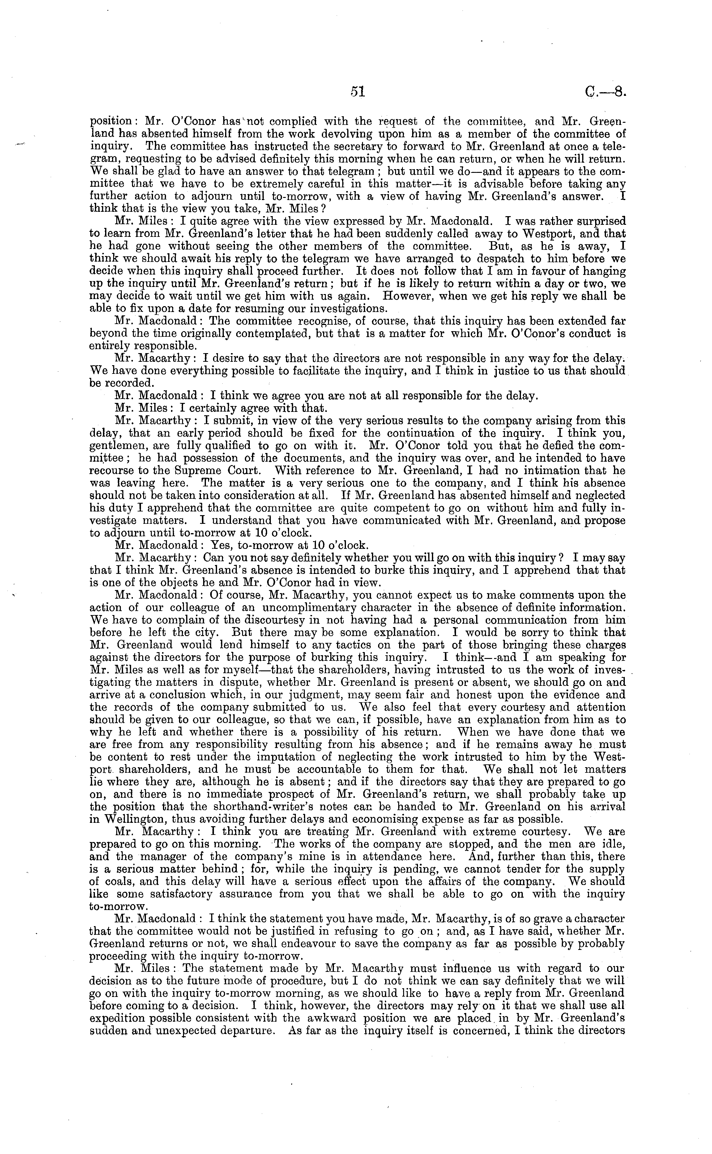 position: Mr. O'Conor hasnot complied with the request of the committee, and Mr. Greenland has absented himself from the work devolving upon him as a member of the committee of inquiry. The committee has instructed the secretary to forward to Mr. Greenland at once a telegram, requesting to be advised definitely this morning when he can return, or when he will return. We shall be glad to have an answer to that telegram ; but until we do—and it appears to the committee that we have to be extremely careful in this matter—it is advisable before taking any further action to adjourn until to-morrow, with a view of having Mr. Greenland's answer. I think that is the view you take, Mr. Miles ? Mr. Miles : I quite agree with the view expressed by Mr. Macdonald. I was rather surprised to learn from Mr. Greenland's letter that he had been suddenly called away to Westport, and that he had gone without seeing the other members of the committee. But, as he is away, I think we should await his reply to the telegram we have arranged to despatch to him before we decide when this inquiry shall proceed further. It does not follow that lam in favour of hanging up the inquiry until Mr. Greenland's return; but if he is likely to return within a day or two, we may decide to wait until we get him with us again. However, when we get his reply we shall be able to fix upon a date for resuming our investigations. Mr. Macdonald : The committee recognise, of course, that this inquiry has been extended far beyond the time originally contemplated, but that is a matter for which Mr. O'Conor's conduct is entirely responsible. Mr. Macarthy: I desire to say that the directors are not responsible in any way for the delay. We have done everything possible to facilitate the inquiry, and I think in justice to us that should be recorded. Mr. Macdonald : I think we agree you are not at all responsible for the delay. Mr. Miles : I certainly agree with that. Mr. Macarthy : I submit, in view of the very serious results to the company arising from this delay, that an early period should be fixed for the continuation of the inquiry. I think you, gentlemen, are fully qualified to go on with it. Mr. O'Conor told you that he defied the committee ; he had possession of the documents, and the inquiry was over, and he intended to have recourse to the Supreme Court. With reference to Mr. Greenland, I had no intimation that he was leaving here. The matter is a very serious one to the company, and I think his absence should not be taken into consideration at all. If Mr. Greenland has absented himself and neglected his duty I apprehend that the committee are quite competent to go on without him and fully investigate matters. I understand that you have communicated with Mr. Greenland, and propose to adjourn until to-morrow at 10 o'clock. Mr. Macdonald: Yes, to-morrow at 10 o'clock. Mr. Macarthy : Can you not say definitely whether you will go on with this inquiry ? I may say that I think Mr. Greenland's absence is intended to burke this inquiry, and I apprehend that that is one of the objects he and Mr. O'Conor had in view. Mr. Macdonald: Of course, Mr. Macarthy, you cannot expect us to make comments upon the action of our colleague of an uncomplimentary character in the absence of definite information. We have to complain of the discourtesy in not having had a personal communication from him before he left the city. But there may be some explanation. I would be sorry to think that Mr. Greenland would lend himself to any tactics on the part of those bringing these charges against the directors for the purpose of burking this inquiry. I think—and lam speaking for Mr. Miles as well as for myself—that the shareholders, having intrusted to us the work of investigating the matters in dispute, whether Mr. Greenland is present or absent, we should go on and arrive at a conclusion which, in our judgment, may seem fair and honest upon the evidence and the records of the company submitted to us. We also feel that every courtesy and attention should be given to our colleague, so that we can, if possible, have an explanation from him as to why he left and whether there is a possibility of his return. When we have done that we are free from any responsibility resulting from his absence; and if he remains away he must be content to rest under the imputation of neglecting the work intrusted to him by the Westport shareholders, and he must be accountable to them for that. We shall not let matters lie where they are, although he is absent; and if the directors say that they are prepared to go on, and there is no immediate prospect of Mr. Greenland's return, we shall probably take up the position that the shorthand-writer's notes can be handed to Mr. Greenland on his arrival in Wellington, thus avoiding further delays and economising expense as far as possible. Mr. Macarthy : I think you are treating Mr. Greenland with extreme courtesy. We are prepared to go on this morning. The works of the company are stopped, and the men are idle, and the manager of the company's mine is in attendance here. And, further than this, there is a serious matter behind ; for, while the inquiry is pending, we cannot tender for the supply of coals, and this delay will have a serious effect upon the affairs of the company. We should like some satisfactory assurance from you that we shall be able to go on with the inquiry to-morrow. Mr. Macdonald : I think the statement you have made, Mr. Macarthy, is of so grave a character that the committee would not be justified in refusing to go on ; and, as I have said, whether Mr. Greenland returns or not, we shall endeavour to save the company as far as possible by probably proceeding with the inquiry to-morrow. Mr. Miles : The statement made by Mr. Macarthy must influence us with regard to our decision as to the future mode of procedure, but I do not think we can say definitely that we will go on with the inquiry to-morrow morning, as w