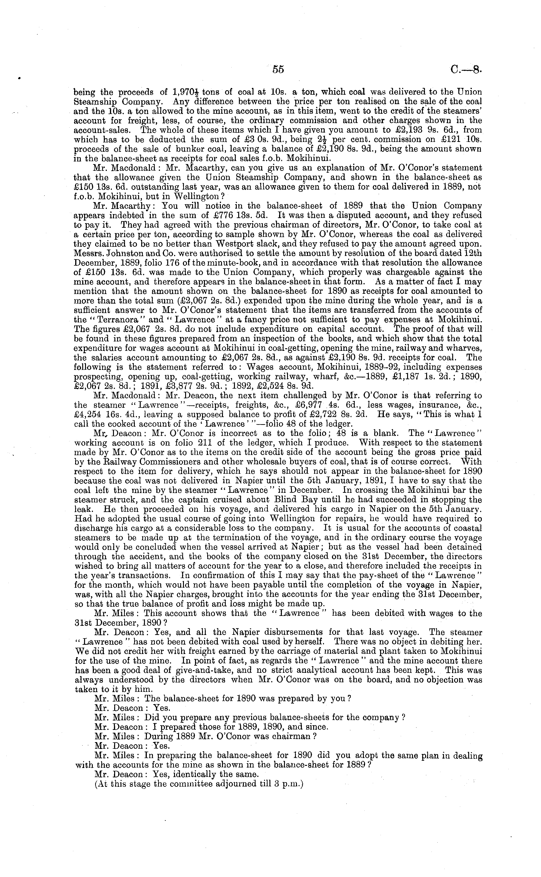 being the proceeds of tons of coal at 10s. a ton, which coal was delivered to the Union Steamship Company. Any difference between the price per ton realised on the sale of the coal and the 10s. a ton allowed to the mine account, as in this item, went to the credit of the steamers' account for freight, less, of course, the ordinary commission and other charges shown in the account-sales. The whole of these items which I have given you amount to £2,193 9s. 6d., from which has to be deducted the sum of £3 Os. 9d., being _\ per cent, commission on £121 10s. proceeds of the sale of bunker coal, leaving a balance of £2,190 Bs. 9d., being the amount shown in the balance-sheet as receipts for coal sales f.o.b. Mokihinui. Mr. Macdonald : Mr. Macarthy, can you give us an explanation of Mr. O'Conor's statement that the allowance given the Union Steamship Company, and shown in the balance-sheet as £150 13s. 6d. outstanding last year, was an allowance given to them for coal delivered in 1889, not f.o.b. Mokihinui, but in Wellington ? Mr. Macarthy: You will notice in the balance-sheet of 1889 that the Union Company appears indebted in the sum of £776 13s. sd. It was then a disputed account, and they refused to pay it. They had agreed with the previous chairman of directors, Mr. O'Conor, to take coal at a certain price per ton, according to sample shown by Mr. O'Conor, whereas the coal as delivered they claimed to be no better than Westport slack, and they refused to pay the amount agreed upon. Messrs. Johnston and Co. were authorised to settle the amount by resolution of the board dated 12th December, 1889, folio 176 of the minute-book, and in accordance with that resolution the allowance of £150 13s. 6d. was made to the Union Company, which properly was chargeable against the mine account, and therefore appears in the balance-sheet in that form. As a matter of fact I may mention that the amount shown on the balance-sheet for 1890 as receipts for coal amounted to more than the total sum (£2,067 2s. Bd.) expended upon the mine during the whole year, and is a sufficient answer to Mr. O'Conor's statement that the items are transferred from the accounts of the "Terranora" and "Lawrence" at a fancy price not sufficient to pay expenses at Mokihinui. The figures £2,067 2s. Bd. do not include expenditure on capital account. The proof of that will be found in these figures prepared from an inspection of the books, and which show that the total expenditure for wages account at Mokihinui in coal-getting, opening the mine, railway and wharves, the salaries account amounting to £2,067 2s. Bd., as against £2,190 Bs. 9d. receipts for coal. The following is the statement referred to : Wages account, Mokihinui, 1889-92, including expenses prospecting, opening up, coal-getting, working railway, wharf, &c.—1889, £1,187 Is. 2d.; 1890, £2,067 2s. Bd.; 1891, £3,877 2s. 9d.; 1892, £2,524 Bs. 9d. Mr. Macdonald: Mr. Deacon, the next item challenged by Mr. O'Conor is that referring to the steamer "Lawrence"—receipts, freights, &c, £6,977 4s. 6d., less wages, insurance, &c, £4,254 16s. 4d., leaving a supposed balance to profit of £2,722 Bs. 2d. He says, "This is what 1 call the cooked account of the ' Lawrence ' " —folio 48 of the ledger. Mr, Deacon: Mr. O'Conor is incorrect as to the folio; 48 is a blank. The "Lawrence" working account is on folio 211 of the ledger, which I produce. With respect to the statement made by Mr. O'Conor as to the items on the credit side of the account being the gross price paid by the Eailway Commissioners and other wholesale buyers of coal, that is of course correct. With respect to the item for delivery, which he says should not appear in the balance-sheet for 1890 because the coal was not delivered in Napier until the sth January, 1891, I have to say that the coal left the mine by the steamer "Lawrence" in December. In crossing the Mokihinui bar the steamer struck, and the captain cruised about Blind Bay until he had succeeded in stopping the leak. He then proceeded on his voyage, and delivered his cargo in Napier on the sth January. Had he adopted the usual course of going into Wellington for repairs, he would have required to discharge his cargo at a considerable loss to the company. It is usual for the accounts of coastal steamers to be made up at the termination of the voyage, and in the ordinary course the voyage would only be concluded when the vessel arrived at Napier; but as the vessel had been detained through the accident, and the books of the company closed on the 31st December, the directors wished to bring all matters of account for the year to a close, and therefore included the receipts in the year's transactions. In confirmation of this I may say that the pay-sheet of the " Lawrence " for the month, which would not have been payable until the completion of the voyage in Napier, was, with all the Napier charges, brought into the accounts for the year ending the 31st December, so that the true balance of profit and loss might be made up. Mr. Miles : This account shows that the "Lawrence " has been debited with wages to the 31st December, 1890? Mr. Deacon: Yes, and all the Napier disbursements for that last voyage. The steamer " Lawrence " has not been debited with coal used by herself. There was no object in debiting her. We did not credit her with freight earned by the carriage of material and plant taken to Mokihinui for the use of the mine. In point of fact, as regards the " Lawrence " and the mine account there has been a good deal of give-and-take, and no strict analytical account has been kept. This was always understood by the directors when Mr. O'Conor was on the board, and no objection was taken to it by him. Mr. Miles : The balance-sheet for 1890 was prepared by you ? Mr. Deacon : Yes. Mr. Miles : Did you prepare any previous balance-sheets for the company ? Mr. Deacon : I prepared those for 1889, 1890, and since. Mr. Miles : During 1889 Mr. O'Con