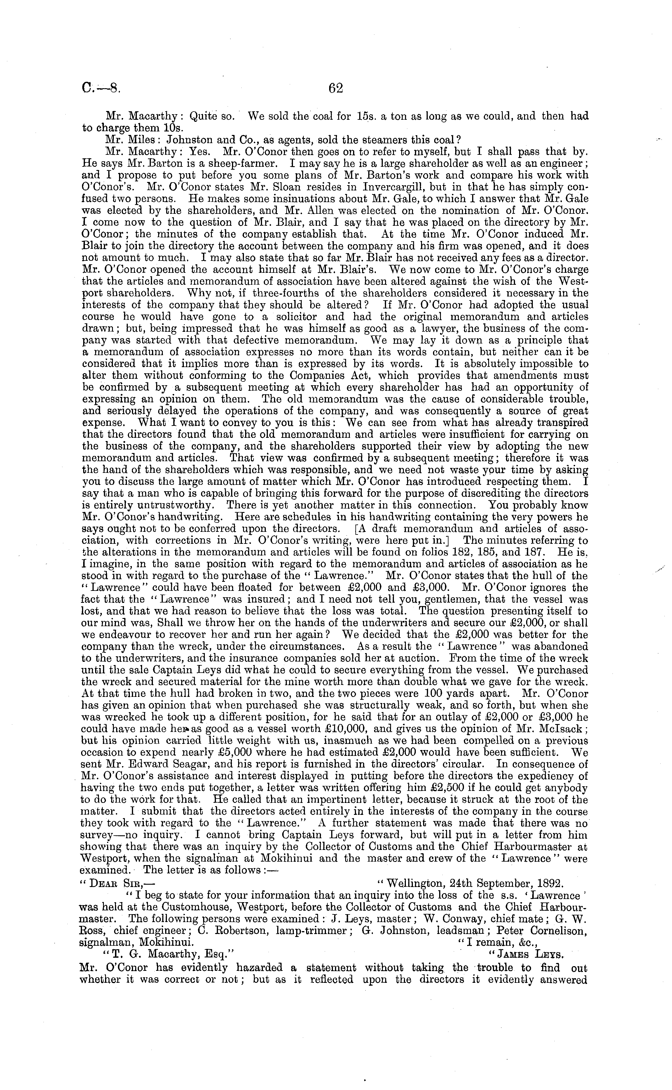 Mr. Macarthy : Quite so. We sold the coal for 15s. a ton as long as we could, and then had to charge them 10s. Mr. Miles : Johnston and Co., as agents, sold the steamers this coal? Mr. Macarthy: Yes. Mr. O'Conor then goes on to refer to myself, but I shall pass that by. He says Mr. Barton is a sheep-farmer. I may say he is a large shareholder as well as an engineer; and I propose to put before you some plans of Mr. Barton's work and compare his work with O'Conor's. Mr. O'Conor states Mr. Sloan resides in Invercargill, but in that he has simply confused two persons. He makes some insinuations about Mr. Gale, to which I answer that Mr. Gale was elected by the shareholders, and Mr. Allen was elected on the nomination of Mr. O'Conor. I come now to the question of Mr. Blair, and I say that he was placed on the directory by Mr. O'Conor; the minutes of the company establish that. At the time Mr. O'Conor induced Mr. Blair to join the directory the account between the company and his firm was opened, and it does not amount to much. I may also state that so far Mr. Blair has not received any fees as a director. Mr. O'Conor opened the account himself at Mr. Blair's. We now come to Mr. O'Conor's charge that the articles and memorandum of association have been altered against the wish of the Westport shareholders. Why not, if three-fourths of the shareholders considered it necessary in the interests of the company that they should be altered? If Mr. O'Conor had adopted the usual course he would have gone to a solicitor and had the original memorandum and articles drawn; but, being impressed that he was himself as good as a lawyer, the business of the company was started with that defective memorandum. We may lay it down as a principle that a memorandum of association expresses no more than its words contain, but neither can it be considered that it implies more than is expressed by its words. It is absolutely impossible to alter them without conforming to the Companies Act, which provides that amendments must be confirmed by a subsequent meeting at which every shareholder has had an opportunity of expressing an opinion on them. The old memorandum was the cause of considerable trouble, and seriously delayed the operations of the company, and was consequently a source of great expense. What I want to convey to you is this: We can see from what has already transpired that the directors found that the old memorandum and articles were insufficient for carrying on the business of the company, and the shareholders supported their view by adopting the new memorandum and articles. That view was confirmed by a subsequent meeting; therefore it was the hand of the shareholders which was responsible, and we need not waste your time by asking you to discuss the large amount of matter which Mr. O'Conor has introduced respecting them. I say that a man who is capable of bringing this forward for the purpose of discrediting the directors is entirely untrustworthy. There is yet another matter in this connection. You probably know Mr. O'Conor's handwriting. Here are schedules in his handwriting containing the very powers he says ought not to be conferred upon the directors. [A draft memorandum and articles of association, with corrections in Mr. O'Conor's writing, were here put in.] The minutes referring to the alterations in the memorandum and articles will be found on folios 182, 185, and 187. He is, I imagine, in the same position with regard to the memorandum and articles of association as he stood in with regard to the purchase of the " Lawrence." Mr. O'Conor states that the hull of the "Lawrence" could have been floated for between £2,000 and £3,000. Mr. O'Conor ignores the fact that the "Lawrence" was insured; and I need not tell you, gentlemen, that the vessel was lost, and that we had reason to believe that the loss was total. The question presenting itself to our mind was, Shall we throw her on the hands of the underwriters and secure our £2,000, or shall we endeavour to recover her and run her again? We decided that the £2,000 was better for the company than the wreck, under the circumstances. As a result the " Lawrence " was abandoned to the underwriters, and the insurance companies sold her at auction. From the time of the wreck until the sale Captain Leys did what he could to secure everything from the vessel. We purchased the wreck and secured material for the mine worth more than double what we gave for the wreck. At that time the hull had broken in two, and the two pieces were 100 yards apart. Mr. O'Conor has given an opinion that when purchased she was structurally weak, and so forth, but when she was wrecked he took up a different position, for he said that for an outlay of £2,000 or £3,000 he could have made hei»as good as a vessel worth £10,000, and gives us the opinion of Mr. Mclsack; but his opinion carried little weight with us, inasmuch as we had been compelled on a previous occasion to expend nearly £5,000 where he had estimated £2,000 would have been sufficient. We sent Mr. Edward Seagar, and his report is furnished in the directors' circular. In consequence of Mr. O'Conor's assistance and interest displayed in putting before the directors the expediency of having the two ends put together, a letter was written offering him £2,500 if he could get anybody to do the work for that. He called that an impertinent letter, because it struck at the root of the matter. I submit that the directors acted entirely in the interests of the company in the course they took with regard to the "Lawrence." A further statement was made that there was no survey—no inquiry. I cannot bring Captain Leys forward, but will put in a letter from him showing that there was an inquiry by the Collector of Customs and the Chief Harbourmaster at Westport, when the signalman at Mokihinui and the master and crew of the " Lawrence " were examined. The letter is as follows :— " Dear Sir,— " Wellington, 24th Septe