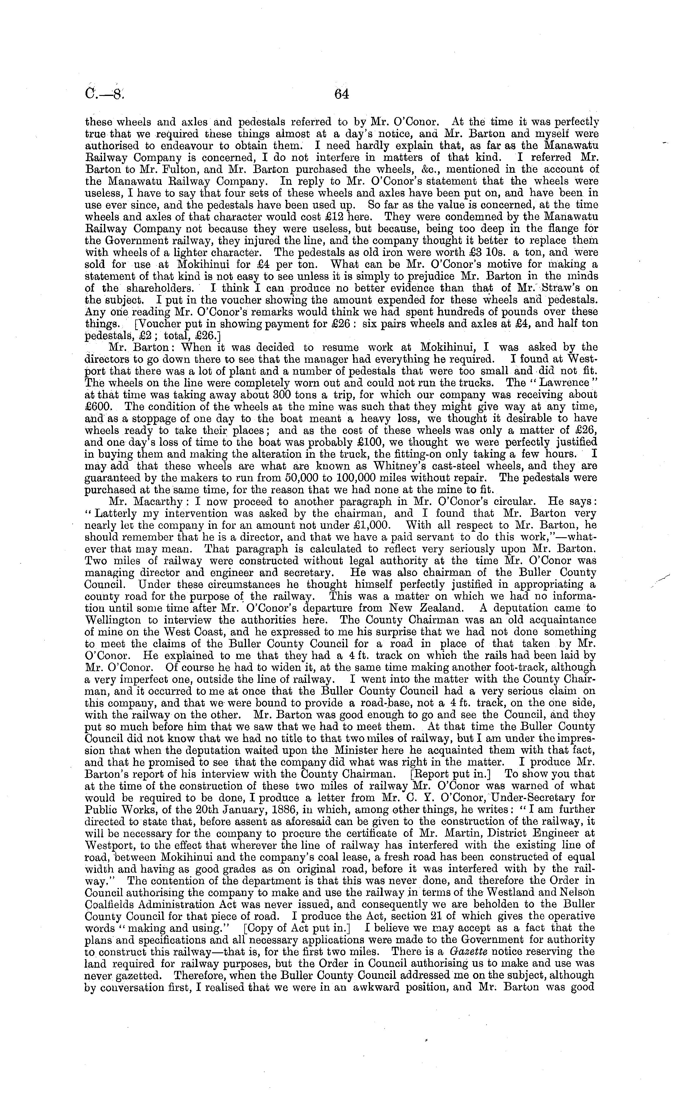 these wheels and axles and pedestals referred to by Mr. O'Conor. At the time it was perfectly true that we required these things almost at a day's notice, and Mr. Barton and myself were authorised to endeavour to obtain them. I need hardly explain that, as far as the Manawatu Railway Company is concerned, Ido not interfere in matters of that kind. I referred Mr. Barton to Mr. Fulton, and Mr. Barton purchased the wheels, &c, mentioned in the account of the Manawatu Railway Company. In reply to Mr. O'Conor's statement that the wheels were useless, I have to say that four sets of these wheels and axles have been put on, and have been in use ever since, and the pedestals have been used up. So far as the value is concerned, at the time wheels and axles of that character would cost £12 here. They were condemned by the Manawatu Railway Company not because they were useless, but because, being too deep in the flange for the Government railway, they injured the line, and the company thought it better to replace them with wheels of a lighter character. The pedestals as old iron were worth £3 10s. a ton, and were sold for use at Mokihinui for £4 per ton. What can be Mr. O'Conor's motive for making a statement of that kind is not easy to see unless it is simply to prejudice Mr. Barton in the minds of the shareholders. I think I can produce no better evidence than that of Mr. Straw's on the subject. I put in the voucher showing the amount expended for these wheels and pedestals. Any one reading Mr. O'Conor's remarks would think we had spent hundreds of pounds over these things. [Voucher put in showing payment for £26 : six pairs wheels and axles at £4, and half ton pedestals, £2 ; total, £26.] Mr. Barton: When it was decided to resume work at Mokihinui, I was asked by the directors to go down there to see that the manager had everything he required. I found at Westport that there was a lot of plant and a number of pedestals that were too small and did not fit. The wheels on the line were completely worn out and could not run the trucks. The " Lawrence " at that time was taking away about 300 tons a trip, for which our company was receiving about £600. The condition of the wheels at the mine was such that they might give way at any time, and as a stoppage of one day to the boat meant a heavy loss, we thought it desirable to have wheels ready to take their places; and as the cost of these wheels was only a matter of £26, and one day's loss of time to the boat was probably £100, we thought we were perfectly justified in buying them and making the alteration in the truck, the fitting-on only taking a few hours. I may add that these wheels are what are known as Whitney's cast-steel wheels, and they are guaranteed by the makers to run from 50,000 to 100,000 miles without repair. The pedestals were purchased at the same time, for the reason that we had none at the mine to fit. Mr. Macarthy : I now proceed to another paragraph in Mr. O'Conor's circular. He says: " Latterly my intervention was asked by the chairman, and I found that Mr. Barton very nearly lei the company in for an amount not under £1,000. With all respect to Mr. Barton, he should remember that he is a director, and that we have a paid servant to do this work," —whatever that may mean. That paragraph is calculated to reflect very seriously upon Mr. Barton. Two miles of railway were constructed without legal authority at the time Mr. O'Conor was managing director and engineer and secretary. He was also chairman of the Buller County Council. Under these circumstances he thought himself perfectly justified in appropriating a county road for the purpose of the railway. This was a matter on which we had no information until some time after Mr. O'Conor's departure from New Zealand. A deputation came to Wellington to interview the authorities here. The County Chairman was an old acquaintance of mine on the West Coast, and he expressed to me his surprise that we had not done something to meet the claims of the Buller County Council for a road in place of that taken by Mr. O'Conor. He explained to me that they had a 4 ft. track on which the rails had been laid by Mr. O'Conor. Of course he had to widen it, at the same time making another foot-track, although a very imperfect one, outside the line of railway. I went into the matter with the County Chairman, and it occurred to me at once that the Buller County Council had a very serious claim on this company, and that we were bound to provide a road-base, not a 4 ft. track, on the one side, with the railway on the other. Mr. Barton was good enough to go and see the Council, and they put so much before him that we saw that we had to meet them. At that time the Buller County Council did not know that we had no title to that two miles of railway, but I am under the impression that when the deputation waited upon the Minister here he acquainted them with that fact, and that he promised to see that the company did what was right in the matter. I produce Mr. Barton's report of his interview with the County Chairman. [Report put in.] To show you that at the time of the construction of these two miles of railway Mr. O'Conor was warned of what would be required to be done, I produce a letter from Mr. C. Y. O'Conor, Under-Secretary for Public Works, of the 20th January, 1886, in which, among other things, he writes : "I am further directed to state that, before assent as aforesaid can be given to the construction of the railway, it will be necessary for the company to procure the certificate of Mr. Martin, District Engineer at Westport, to the effect that wherever the line of railway has interfered with the existing line of road, between Mokihinui and the company's coal lease, a fresh road has been constructed of equal width and having as good grades as on original road, before it was interfered with by the railway." The contention of the department is that this was never done, and therefore the Order 
