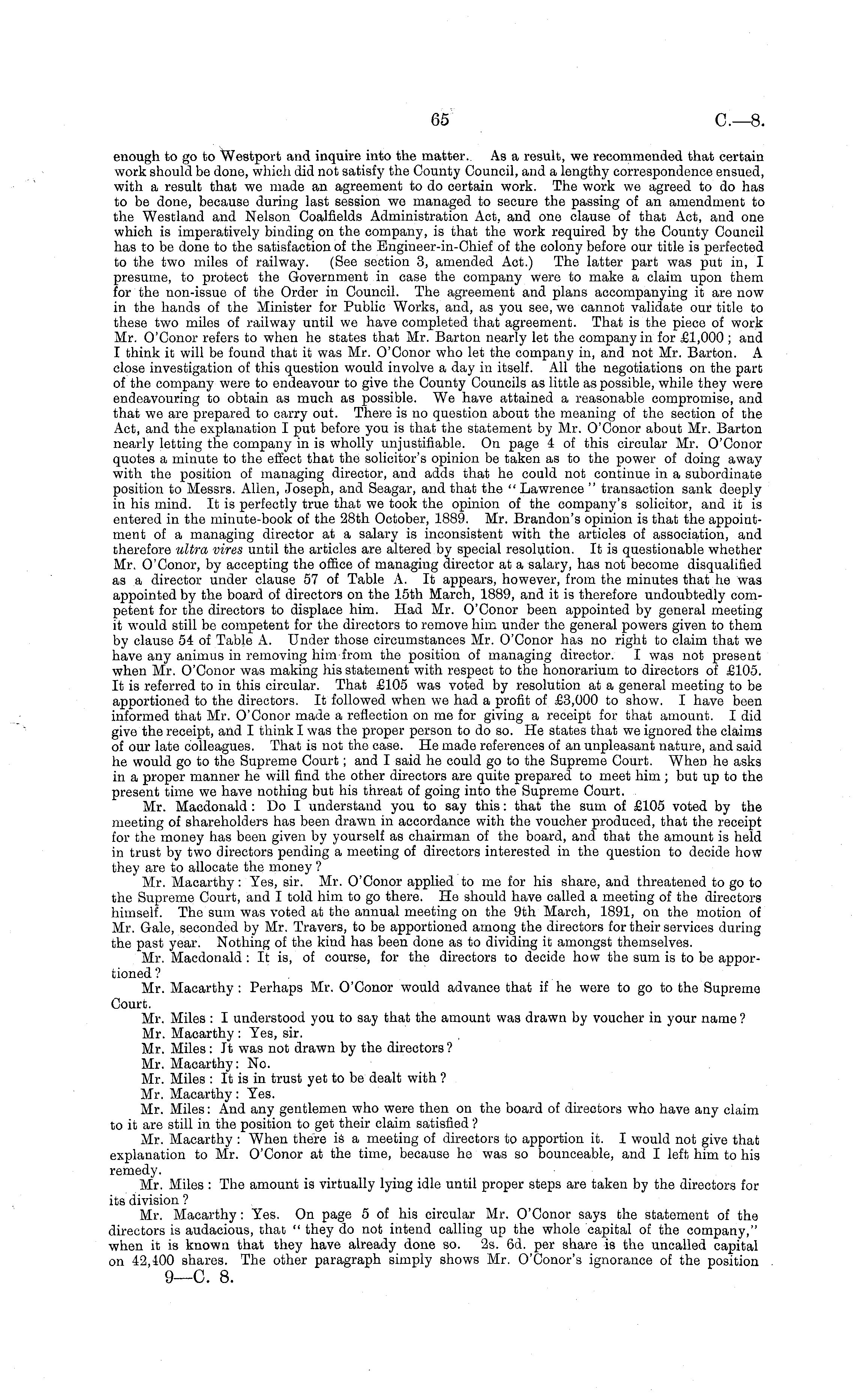 enough to go to Westport and inquire into the matter. As a result, we recommended that certain work should be done, which did not satisfy the County Council, and a lengthy correspondence ensued, with a result that we made an agreement to do certain work. The work we agreed to do has to be done, because during last session we managed to secure the passing of an amendment to the Westland and Nelson Coalfields Administration Act. and one clause of that Act, and one which is imperatively binding on the company, is that the work required by the County Council has to be done to the satisfaction of the Engineer-in-Chief of the colony before our title is perfected to the two miles of railway. (See section 3, amended Act.) The latter part was put in, I presume, to protect the Government in case the company were to make a claim upon them for the non-issue of the Order in Council. The agreement and plans accompanying it are now in the hands of the Minister for Public Works, and, as you see, we cannot validate our title to these two miles of railway until we have completed that agreement. That is the piece of work Mr. O'Conor refers to when he states that Mr. Barton nearly let the company in for £1,000 ; and I think it will be found that it was Mr. O'Conor who let the company in, and not Mr. Barton. A close investigation of this question would involve a day in itself. All the negotiations on the part of the company were to endeavour to give the County Councils as little as possible, while they were endeavouring to obtain as much as possible. We have attained a reasonable compromise, and that we are prepared to carry out. There is no question about the meaning of the section of the Act, and the explanation I put before you is that the statement by Mr. O'Conor about Mr. Barton nearly letting the company in is wholly unjustifiable. On page 4 of this circular Mr. O'Conor quotes a minute to the effect that the solicitor's opinion be taken as to the power of doing away with the position of managing director, and adds that he could not continue in a subordinate position to Messrs. Allen, Joseph, and Seagar, and that the " Lawrence " transaction sank deeply in his mind. It is perfectly true that we took the opinion of the company's solicitor, and it is entered in the minute-book of the 28th October, 1889. Mr. Brandon's opinion is that the appointment of a managing director at a salary is inconsistent with the articles of association, and therefore ultra vires until the articles are altered by special resolution. It is questionable whether Mr. O'Conor, by accepting the office of managing director at a salary, has not become disqualified as a director under clause 57 of Table A. It appears, however, from the minutes that he was appointed by the board of directors on the 15th March, 1889, and it is therefore undoubtedly competent for the directors to displace him. Had Mr. O'Conor been appointed by general meeting it would still be competent for the directors to remove him under the general powers given to them by clause 54 of Table A. Under those circumstances Mr. O'Conor has no right to claim that we have any animus in removing him from the position of managing director. I was not present when Mr. O'Conor was making his statement with respect to the honorarium to directors of £105. It is referred to in this circular. That £105 was voted by resolution at a general meeting to be apportioned to the directors. It followed when we had a profit of £3,000 to show. I have been informed that Mr. O'Conor made a reflection on me for giving a receipt for that amount. I did give the receipt, and I think I was the proper person to do so. He states that we ignored the claims of our late colleagues. That is not the case. He made references of an unpleasant nature, and said he would go to the Supreme Court; and I said he could go to the Supreme Court. When he asks in a proper manner he will find the other directors are quite prepared to meet him ; but up to the present time we have nothing but his threat of going into the Supreme Court. Mr. Macdonald :Do I understand you to say this: that the sum of £105 voted by the meeting of shareholders has been drawn in accordance with the voucher produced, that the receipt for the money has been given by yourself as chairman of the board, and that the amount is held in trust by two directors pending a meeting of directors interested in the question to decide how they are to allocate the money ? Mr. Macarthy: Yes, sir. Mr. O'Conor applied to me for his share, and threatened to go to the Supreme Court, and I told him to go there. He should have called a meeting of the directors himself. The sum was voted at the annual meeting on the 9th March, 1891, on the motion of Mr. Gale, seconded by Mr. Travers, to be apportioned among the directors for their services during the past year. Nothing of the kind has been done as to dividing it amongst themselves. Mr. Macdonald :It is, of course, for the directors to decide how the sum is to be apportioned ? Mr. Macarthy : Perhaps Mr. O'Conor would advance that if he were to go to the Supreme Court. Mr. Miles : I understood you to say that the amount was drawn by voucher in your name ? Mr. Macarthy : Yes, sir. Mr. Miles: Jt was not drawn by the directors ? Mr. Macarthy: No. Mr. Miles : It is in trust yet to be dealt with ? Mr. Macarthy: Yes. Mr. Miles: And any gentlemen who were then on the board of directors who have any claim to it are still in the position to get their claim satisfied ? Mr. Macarthy : When there is a meeting of directors to apportion it. I would not give that explanation to Mr. O'Conor at the time, because he was so bounceable, and I left him to his remedy. Mr. Miles : The amount is virtually lying idle until proper steps are taken by the directors for its division ? Mr. Macarthy: Yes. On page 5 of his circular Mr. O'Conor says the statement of the directors is audacious, that " they do not intend calling up the whole capital of 