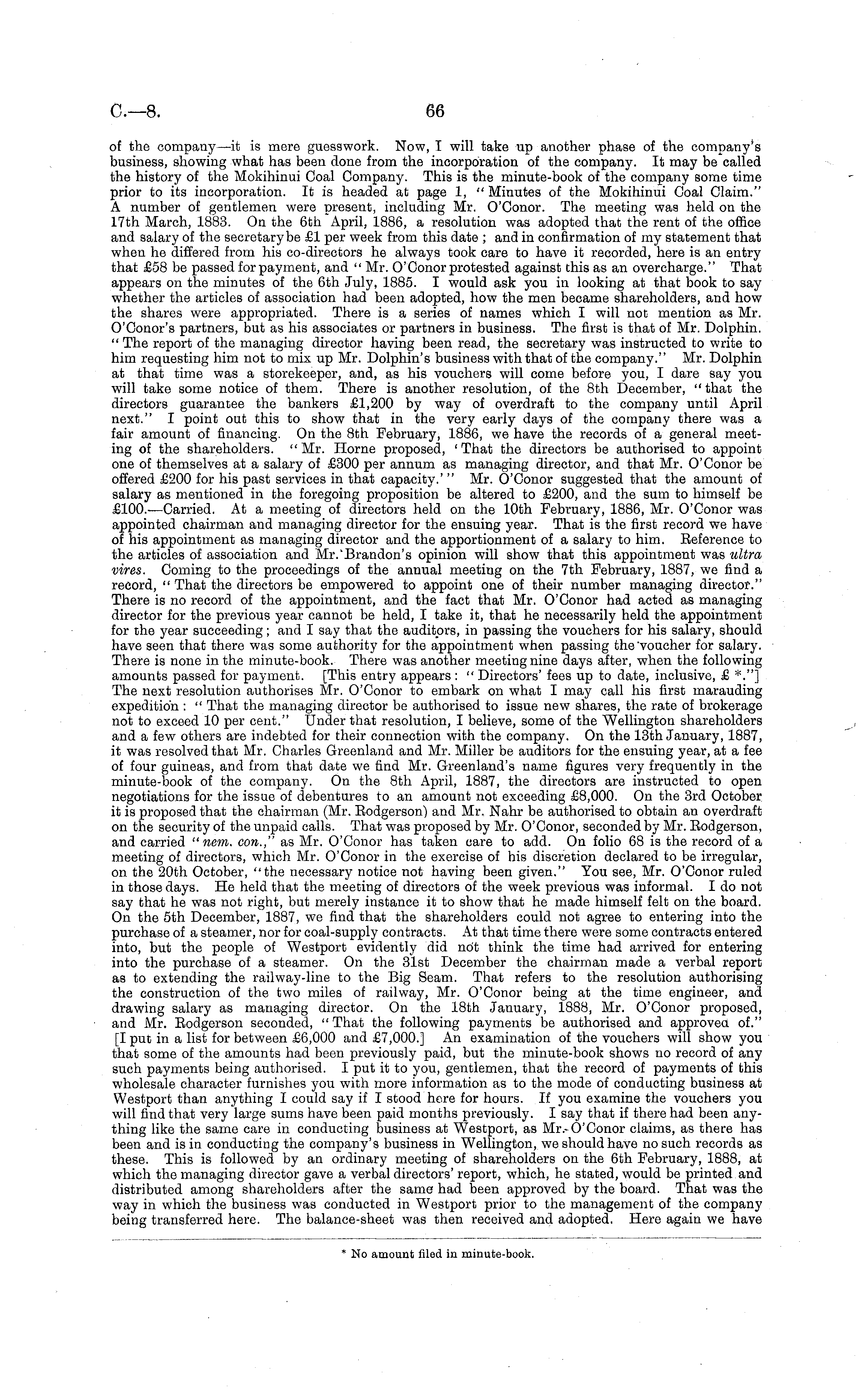 of the company—it is mere guesswork. Now, I will take up another phase of the company's business, showing what has been done from the incorporation of the company. It may be called the history of the Mokihinui Coal Company. This is the minute-book of the company some time prior to its incorporation. It is headed at page 1, " Minutes of the Mokihinui Coal Claim." A number of gentlemen were present, including Mr. O'Conor. The meeting was held on the 17th March, 1883. On the 6th April, 1886, a resolution was adopted that the rent of the office and salary of the secretary be £1 per week from this date ; and in confirmation of my statement that when he differed from his co-directors he always took care to have it recorded, here is an entry that £58 be passed forpayment, and " Mr. O'Conor protested against this as an overcharge." That appears on the minutes of the 6th July, 1885. I would ask you in looking at that book to say whether the articles of association had been adopted, how the men became shareholders, and how the shares were appropriated. There is a series of names which I will not mention as Mr. O'Conor's partners, but as his associates or partners in business. The first is that of Mr. Dolphin. " The report of the managing director having been read, the secretary was instructed to write to him requesting him not to mix up Mr. Dolphin's business with that of the company." Mr. Dolphin at that time was a storekeeper, and, as his vouchers will come before you, I dare say you will take some notice of them. There is another resolution, of the Bth December, "that the directors guarantee the bankers £1,200 by way of overdraft to the company until April next." I point out this to show that in the very early days of the company there was a fair amount of financing. On the Bth February, 1886, we have the records of a general meeting of the shareholders. "Mr. Home proposed, 'That the directors be authorised to appoint one of themselves at a salary of £300 per annum as managing director, and that Mr. O'Conor be offered £200 for his past services in that capacity.' " Mr. O'Conor suggested that the amount of salary as mentioned in the foregoing proposition be altered to £200, and the sum to himself be £100.—Carried. At a meeting of directors held on the 10th February, 1886, Mr. O'Conor was appointed chairman and managing director for the ensuing year. That is the first record we have of his appointment as managing director and the apportionment of a salary to him. Eeference to the articles of association and Mr.'Brandon's opinion will show that this appointment was ultra vires. Coming to the proceedings of the annual meeting on the 7th February, 1887, we find a record, " That the directors be empowered to appoint one of their number managing director." There is no record of the appointment, and the fact that Mr. O'Conor had acted as managing director for the previous year cannot be held, I take it, that he necessarily held the appointment for the year succeeding; and I say that the auditors, in passing the vouchers for his salary, should have seen that there was some authority for the appointment when passing the voucher for salary. There is none in the minute-book. There was another meeting nine days after, when the following amounts passed for payment. [This entry appears : " Directors' fees up to date, inclusive, £ *."] The next resolution authorises Mr. O'Conor to embark on what I may call his first marauding expedition : " That the managing director be authorised to issue new shares, the rate of brokerage not to exceed 10 per cent." Under that resolution, I believe, some of the Wellington shareholders and a few others are indebted for their connection with the company. On the 13th January, 1887, it was resolved that Mr. Charles Greenland and Mr. Miller be auditors for the ensuing year, at a fee of four guineas, and from that date we find Mr. Greenland's name figures very frequently in the minute-book of the company. On the Bth April, 1887, the directors are instructed to open negotiations for the issue of debentures to an amount not exceeding £8,000. On the 3rd October it is proposed that the chairman (Mr. Eodgerson) and Mr. Nahr be authorised to obtain an overdraft on the security of the unpaid calls. That was proposed by Mr. O'Conor, seconded by Mr. Eodgerson, and carried "nem. con.," as Mr. O'Conor has taken care to add. On folio 68 is the record of a meeting of directors, which Mr. O'Conor in the exercise of his discretion declared to be irregular, on the 20th October, "the necessary notice not having been given." You see, Mr. O'Conor ruled in those days. He held that the meeting of directors of the week previous was informal. Ido not say that he was not right, but merely instance it to show that he made himself felt on the board. On the sth December, 1887, we find that the shareholders could not agree to entering into the purchase of a steamer, nor for coal-supply contracts. At that time there were some contracts entered into, but the people of Westport evidently did ndt think the time had arrived for entering into the purchase of a steamer. On the 31st December the chairman made a verbal report as to extending the railway-line to the Big Seam. That refers to the resolution authorising the construction of the two miles of railway, Mr. O'Conor being at the time engineer, and drawing salary as managing director. On the 18th January, 1888, Mr. O'Conor proposed, and Mr. Eodgerson seconded, " That the following payments be authorised and approved of." [I put in a list for between £6,000 and £7,000.] An examination of the vouchers will show you that some of the amounts had been previously paid, but the minute-book shows no record of any such payments being authorised. I put it to you, gentlemen, that the record of payments of this wholesale character furnishes you with more information as to the mode of conducting business at Westport than anything I could say if I stood here fo