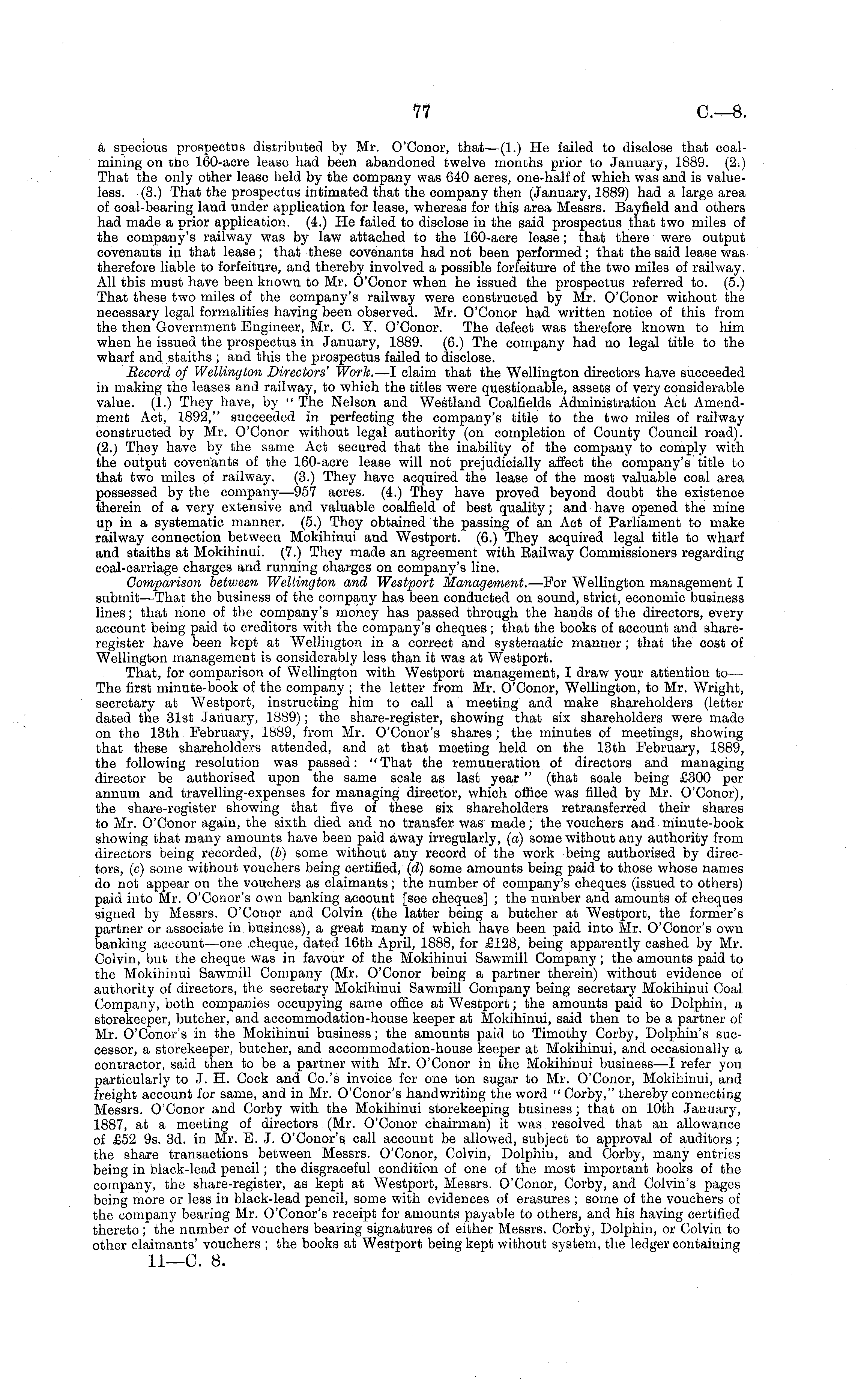 a specious prospectus distributed by Mr. O'Conor, that—(l.) He failed to disclose that coalmining on the 160-acre lease had been abandoned twelve months prior to January, 1889. (2.) That the only other lease held by the company was 640 acres, one-half of which was and is valueless. (3.) That the prospectus intimated that the company then (January, 1889) had a large area of coal-bearing land under application for lease, whereas for this area Messrs. Bayfield and others had made a prior application. (4.) He failed to disclose in the said prospectus that two miles of the company's railway was by law attached to the 160-acre lease; that there were output covenants in that lease; that these covenants had not been performed; that the said lease was therefore liable to forfeiture, and thereby involved a possible forfeiture of the two miles of railway. All this must have been known to Mr. O'Conor when he issued the prospectus referred to. (5.) That these two miles of the company's railway were constructed by Mr. O'Conor without the necessary legal formalities having been observed. Mr. O'Conor had written notice of this from the then Government Engineer, Mr. C. Y. O'Conor. The defect was therefore known to him when he issued the prospectus in January, 1889. (6.) The company had no legal title to the wharf and staiths ; and this the prospectus failed to disclose. Record of Wellington Directors' Work. —l claim that the Wellington directors have succeeded in making the leases and railway, to which the titles were questionable, assets of very considerable value. (1.) They have, by " The Nelson and Westland Coalfields Administration Act Amendment Act, 1892," succeeded in perfecting the company's title to the two miles of railway constructed by Mr. O'Conor without legal authority (on completion of County Council road). (2.) They have by the same Act secured that the inability of the company to comply with the output covenants of the 160-acre lease will not prejudicially affect the company's title to that two miles of railway. (3.) They have acquired the lease of the most valuable coal area possessed by the company—9s7 acres. (4.) They have proved beyond doubt the existence therein of a very extensive and valuable coalfield of best quality; and have opened the mine up in a systematic manner. (5.) They obtained the passing of an Act of Parliament to make railway connection between Mokihinui and Westport. (6.) They acquired legal title to wharf and staiths at Mokihinui. (7.) They made an agreement with Eailway Commissioners regarding coal-carriage charges and running charges on company's line. Comparison between Wellington and Westport Management. —For Wellington management I submit—That the business of the company has been conducted on sound, strict, economic business lines; that none of the company's money has passed through the hands of the directors, every account being paid to creditors with the company's cheques; that the books of account and shareregister have been kept at Wellington in a correct and systematic manner; that the cost of Wellington management is considerably less than it was at Westport. That, for comparison of Wellington with Westport management, I draw your attention to — The first minute-book of the company ; the letter from Mr. O'Conor, Wellington, to Mr. Wright, secretary at Westport, instructing him to call a meeting and make shareholders (letter dated the 31st January, 1889); the share-register, showing that six shareholders were made on the 13th February, 1889, from Mr. O'Conor's shares; the minutes of meetings, showing that these shareholders attended, and at that meeting held on the 13th February, 1889, the following resolution was passed: "That the remuneration of directors and managing director be authorised upon the same scale as last year " (that scale being £300 per annum and travelling-expenses for managing director, which office was filled by Mr. O'Conor), the share-register showing that five of these six shareholders retransferred their shares to Mr. O'Conor again, the sixth died and no transfer was made; the vouchers and minute-book showing that many amounts have been paid away irregularly, (a) some without any authority from directors being recorded, (b) some without any record of the work being authorised by directors, (c) some without vouchers being certified, (d) some amounts being paid to those whose names do not appear on the vouchers as claimants; the number of company's cheques (issued to others) paid into Mr. O'Conor's own banking account [see cheques] ; the number and amounts of cheques signed by Messrs. O'Conor and Colvin (the latter being a butcher at Westport, the former's partner or associate in business), a great many of which have been paid into Mr. O'Conor's own banking account—one .cheque, dated 16th April, 1888, for £128, being apparently cashed by Mr. Colvin, but the cheque was in favour of the Mokihinui Sawmill Company; the amounts paid to the Mokihinui Sawmill Company (Mr. O'Conor being a partner therein) without evidence of authority of directors, the secretary Mokihinui Sawmill Company being secretary Mokihinui Coal Company, both companies occupying same office at Westport; the amounts paid to Dolphin, a storekeeper, butcher, and accommodation-house keeper at Mokihinui, said then to be a partner of Mr. O'Conor's in the Mokihinui business; the amounts paid to Timothy Corby, Dolphin's successor, a storekeeper, butcher, and accommodation-house keeper at Mokihinui, and occasionally a contractor, said then to be a partner with Mr. O'Conor in the Mokihinui business—l refer you particularly to J. H. Cock and Co.'s invoice for one ton sugar to Mr. O'Conor, Mokihinui, and freight account for same, and in Mr. O'Conor's handwriting the word " Corby," thereby connecting Messrs. O'Conor and Corby with the Mokihinui storekeeping business; that on 10th January, 1887, at a meeting of directors (Mr. O'Conor chairman) it was resolved that an