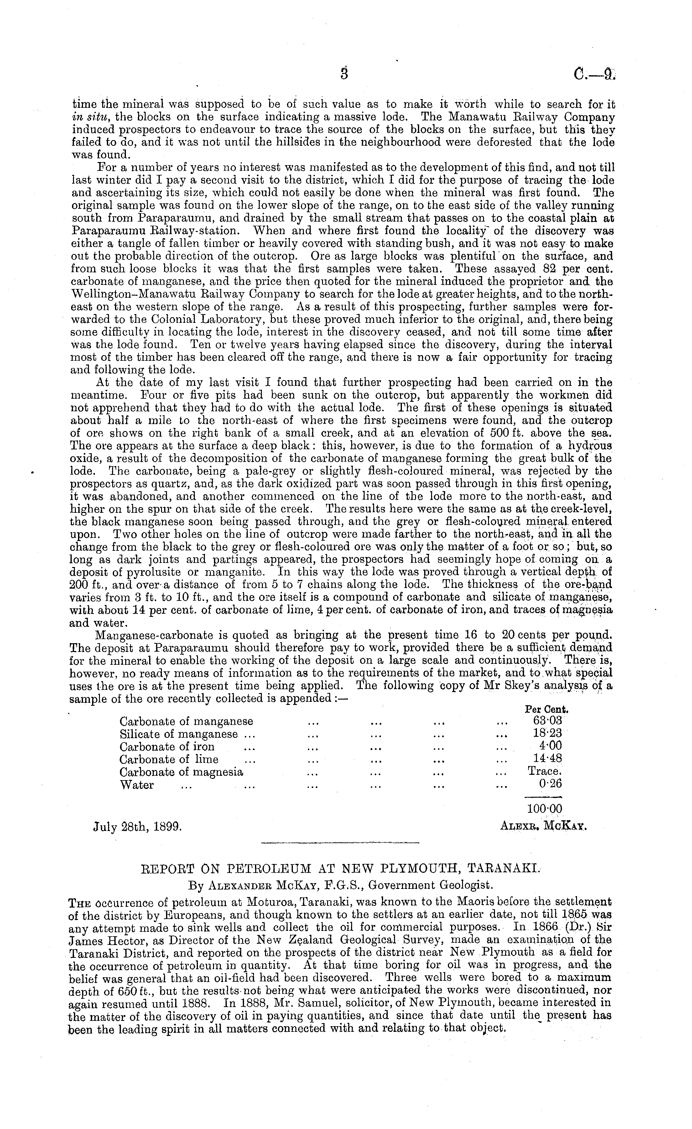REPORT ON PETROLEUM AT NEW PLYMOUTH, TARANAKI. By Alexander McKay, F.G.S., Government Geologist. The occurrence of petroleum at Moturoa, Taranaki, was known to the Maoris before the settlement of the district by Europeans, and though known to the settlers at an earlier date, not till 1865 was any attempt made to sink wells and collect the oil for commercial purposes. In 1866 (Dr.) Sir James Hector, as Director of the New Zealand Geological Survey, made an examination of the Taranaki District, and reported on the prospects of the district near New Plymouth as a field for the occurrence of petroleum in quantity. At that time boring for oil was in progress, and the belief was general that an oil-field had been discovered. Three wells were bored to a maximum depth of 650 ft., but the results-not being what were anticipated the works were discontinued, nor again resumed until 1888. In 1888, Mr, Samuel, solicitor, of New Plymouth, became interested in the matter of the discovery of oil in paying quantities, and since that date until the_ present has been the leading spirit in all matters connected with and relating to that object.