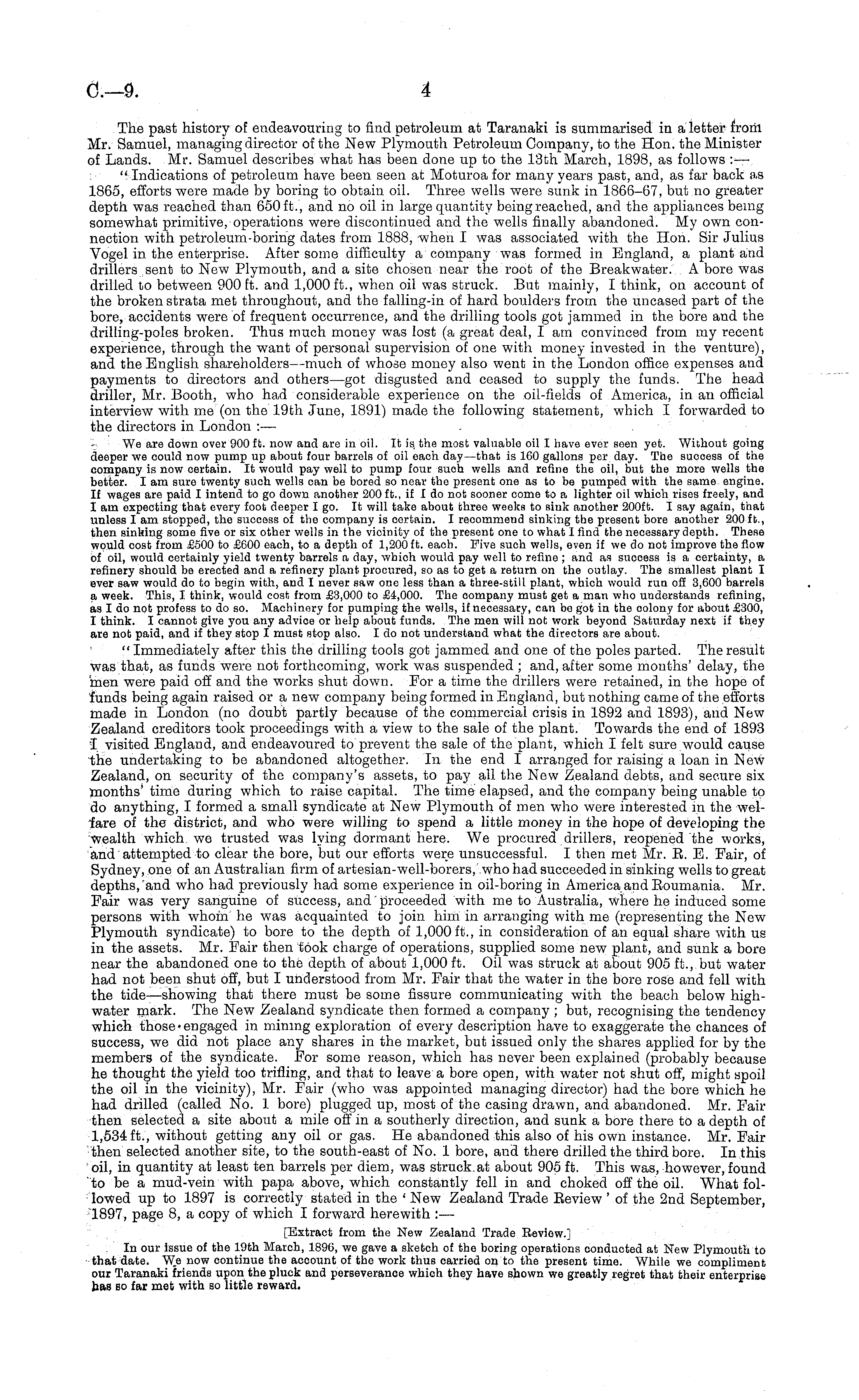The past history of endeavouring to find petroleum at Taranaki is summarised in a letter frorii Mr. Samuel, managing director of the New Plymouth Petroleum Company, to the Hon. the Minister of Lands. Mr. Samuel describes what has been done up to the 13th March, 1898, as follows : — "Indications of petroleum have been seen at Moturoa for many years past, and, as far back as 1865, efforts were made by boring to obtain oil. Three wells were sunk in 1866-67, but no greater depth was reached than 650 ft., and no oil in large quantity being reached, and the appliances being somewhat primitive, operations were discontinued and the wells finally abandoned. My own connection with petroleum-boring dates from 1888, when I was associated with the Hon. Sir Julius Vogel in the enterprise. After some difficulty a company was formed in England, a plant and drillers sent to New Plymouth, and a site chosen near the root of the Breakwater. A bore was drilled to between 900 ft. and 1,000 ft., when oil was struck. But mainly, I think, on account of the broken strata met throughout, and the falling-in of hard boulders from the uncased part of the bore, accidents were of frequent occurrence, and the drilling tools got jammed in the bore and the drilling-poles broken. Thus much money was lost (a great deal, I am convinced from my recent experience, through the want of personal supervision of one with money invested in the venture), and the English shareholders —much of whose money also went in the London office expenses and payments to directors and others—got disgusted and ceased to supply the funds. The head driller, Mr. Booth, who had considerable experience on the oil-fields of America, in an official interview with me (on the 19th June, 1891) made the following statement, which I forwarded to the directors in London :— - Wβ are down over 900 ft. now and are in oil. It is, the most valuable oil I have ever seen yet. Without going deeper we could now pump up about four barrels of oil each day—that is 160 gallons per day. The success of the company is now certain. It would pay well to pump four suoh wells and refine the oil, but the more wells the better. lam sure twenty such wells can be bored so near the present one as to be pumped with the same engine. If wages are paid I intend to go down another 200 ft., if I do not sooner come to a lighter oil which rises freely, and lam expecting that every foot deeper I go. It will take about three weeks to sink another 200 ft. I say again, that unless lam stopped, the success of the company is certain. I recommend sinking the present bore another 200 ft., then sinking some five or six other wells in the vicinity of the present one to what I find the necessary depth. These would cost from £500 to £600 each, to a depth of 1,200 ft. each. Five such wells, even if we do not improve the flow of oil, would certainly yield twenty barrels a day, which would pay well to refine ; and as success is a certainty, a refinery should be erected and a refinery plant procured, so as to get a return on the outlay. The smallest plant I ever saw would do to begin with, and I never saw ono less than a three-still plant, which would run off 3,600 barrels a week. This, I think, would cost from £3,000 to £4,000. The company must get a man who understands refining, as Ido not profess to do so. Machinery for pumping the wells, if necessary, can be got in the colony for about £300, I think. I cannot give you any advice or help about funds. The men will not work beyond Saturday next if they are not paid, and if they stop I must stop also. Ido not understand what the directors are about. " Immediately after this the drilling tools got jammed and one of the poles parted. The result was that, as funds were not forthcoming, work was suspended ; and, after some months' delay, the men were paid off and the works shut down. For a time the drillers were retained, in the hope of funds being again raised or a new company being formed in England, but nothing came of the efforts made in London (no doubt partly because of the commercial crisis in 1892 and 1893), and New Zealand creditors took proceedings with a view to the sale of the plant. Towards the end of 1893 I visited England, and endeavoured to prevent the sale of the plant, which I felt sure would cause the undertaking to be abandoned altogether. In the end I arranged for raising a loan in New Zealand, on security of the company's assets, to pay all the New Zealand debts, and secure six months' time during which to raise capital. The time elapsed, and the company being unable to do anything, I formed a small syndicate at New Plymouth of men who were interested in the welfare of the district, and who were willing to spend a little money in the hope of developing the wealth which we trusted was lying dormant here. We procured drillers, reopened the works, and attempted to clear the bore, but our efforts were unsuccessful. I then met Mr. E. E. Fair, of Sydney, one of an Australian firm of artesian-well-borers, who had succeeded in sinking wells to great depths,'and who had previously had some experience in oil-boring in America and Eoumania. Mr. Fair was very sanguine of success, and" proceeded with me to Australia, where he induced some persons with whom he was acquainted to join him in arranging with me (representing the New Plymouth syndicate) to bore to the depth of 1,000 ft., in consideration of an equal share with us in the assets. Mr. Fair then took charge of operations, supplied some new plant, and sunk a bore near the abandoned one to the depth of about 1,000 ft. Oil was struck at about 905 ft., but water had not been shut off, but I understood from Mr. Fair that the water in the bore rose and fell with the tide —showing that there must be some fissure communicating with the beach below highwater mark. The New Zealand syndicate then formed a company ; but, recognising the tendency which those • engaged in mining exploration
