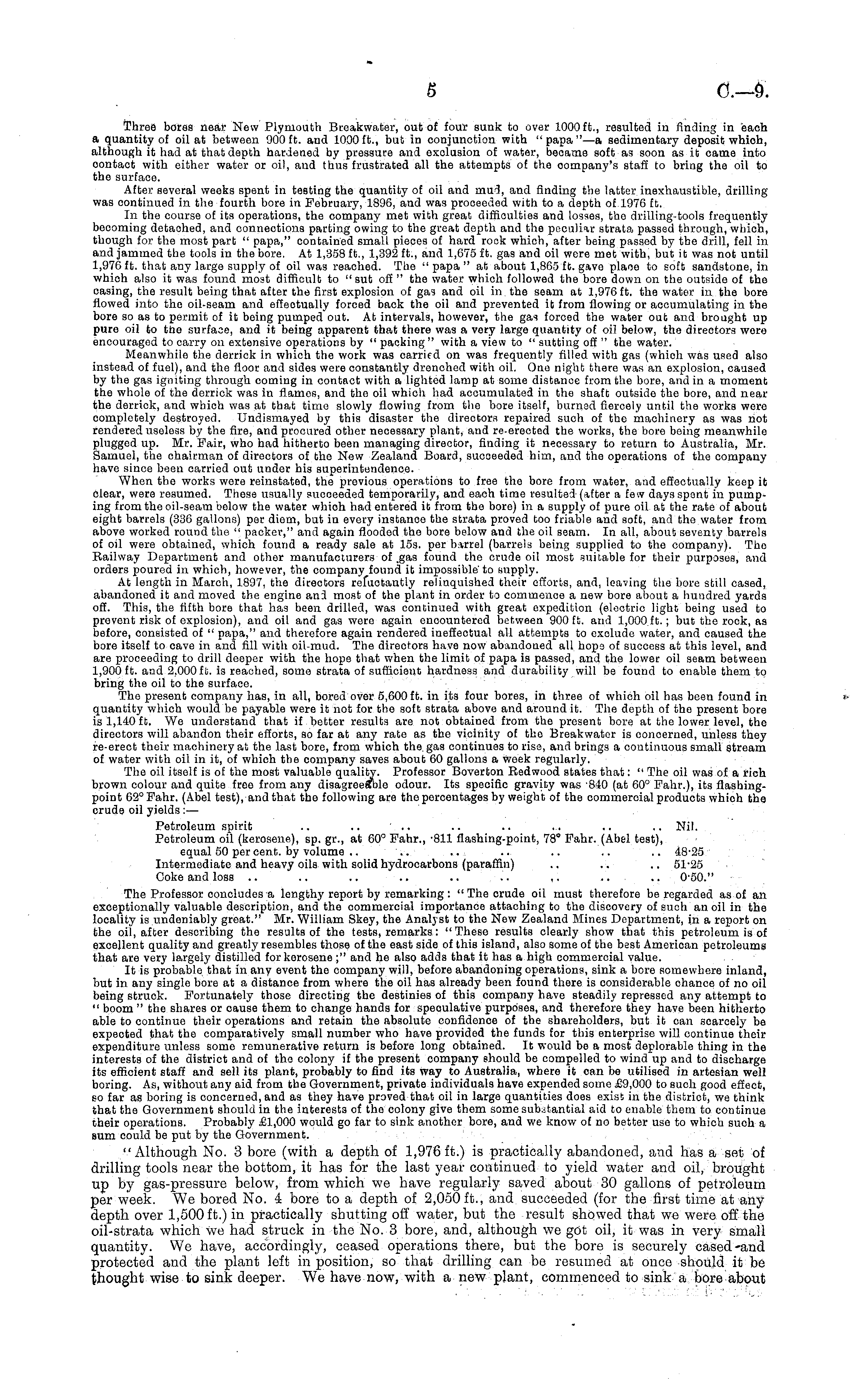 Three bores near New Plymouth Breakwater, out of four sunk to over 1000 ft., resulted in finding in each a quantity of oil at between 900 ft. and 1000 ft., but in conjunction with "papa"—a sedimentary deposit which, although it had at that depth hardened by pressure and exclusion of water, became soft as soon as it cama into contact with either water or oil, and thus frustrated all the attempts of the oompany's staff to bring the oil to the surface. After several weeks spent In testing the quantity of oil and mud, and finding the latter inexhaustible, drilling was continued in the fourth bore in February, 1896, and was proceeded with to a depth of 1976 ft. In the course of its operations, the company met with great difficulties and losses, the drilling-tools frequently becoming detached, and connections parting owing to the great depth and the peculiar strata passed through, which, though for the most part " papa," contained small pieces of hard rook which, after being pa.ssed by the drill, fell in and jammed the tools in the bore. At 1,358 ft., 1,392 ft., and 1,675 ft. gas and oil were met with, but it was not until 1,976 ft. that any large supply of oil was reached. The " papa " at about 1,865 ft. gave place to soft sandstone, in which also it was found moat difficult to "sut off " the water which followed the bore down on the outside of the casing, the result being that after the first explosion of gas and oil in the seam at 1,976 ft. the water in the bore flowed into the oil-seam and effeotually forced back the oil and prevented it from flowing or accumulating in the bore so as to permit of it being pumped out. At intervals, however, the gas forced the water out and brought up pure oil to the surface, and it being apparent that there was a very large quantity of oil below, the directors were encouraged to carry on extensive operations by " packing" with a view to " sutting off " the water. Meanwhile the derrick in which the work was carried on was frequently filled with gas (which was used also instead of fuel), and the floor and sides were constantly drenched with oil. One night there was an explosion, caused by the gas igniting through coming in contact with a lighted lamp at some distance from the bore, and in a moment the whole of the derrick was in flames, and the oil which had accumulated in the shaft outside the bore, and near the derrick, and which was at that time slowly flowing from the bore itself, burnad fiercely until the works wore completely destroyed. Undismayed by this disaster the directors repaired such of the machinery as was not rendered useless by the fire, and procured other necessary plant, and re-erected the works, the bore being meanwhile plugged up. Mr. Pair, who had hitherto been managing director, finding it necessary to return to Australia, Mr. Samuel, the chairman of directors of the New Zealand Board, succeeded him, and the operations of the company have since been carried out under his superintendence. When the works were reinstated, the previous operations to free the bore from water, and effectually keep it clear, were resumed. These usually succeeded temporarily, and each time resulted (after a few days spent in pumping from the oil-seam below the water which had entered it from the bore) in a supply of pure oil at the rate of about eight barrels (336 gallons) per diem, but in every instance the strata proved too friable and soft, and the water from above worked round the " packer," and again flooded the bore below and the oil seam. In all, about seventy barrels of oil were obtained, which found a ready sale at 15s. per barrel (barrels being supplied to the company). The Railway Department and other manufacturers of .gas found the crude oil most suitable for their purposes, and orders poured in which, however, the company found it impossible'to supply. At length in March, 1897, the directors refuctantly relinquished their efforts, and, leaving the bore still cased, abandoned it and moved the engine and most of the plant in order to commence a new bore about a hundred yards off. This, the fifth bore that has been drilled, was continued with great expedition (electric light being used to prevent risk of explosion), and oil and gas wero again encountered between 900 ft. and 1,000 ft.; but the rock, as before, consisted of " papa," and therefore again rendered ineffectual all attempts to exclude water, and caused the bore itself to cave in and fill with oil-mud. The directors have now abandoned all hop 9 of success at this levol, and are proceeding to drill deeper with the hope that when the limit of papa is passed, and the lower oil seam between 1,900 ft. and 2,000 ft. is reached, some strata of sufficient hardnosa and durability will be found to enable them to bring the oil to the surface. The present company has, in all, bored over 5,600 ft. in its four bores, in three of which oil has been found in quantity which would be payable were it not for the soft strata above and around it. The depth of the present bore is 1,140 ft. We understand that if.better results are not obtained from the present bore at the lower level, the directors will abandon their efforts, so far at any rate as the vicinity of the Breakwater is concerned, unless they re-erect their machinery at the last bore, from which the, gas continues to rise, and brings a continuous small stream of water with oil in it, of which the company saves about 60 gallons a week regularly. The oil itself is of the moat valuable quality. Professor Boverton Redwood states that: " The oil was of a rich brown colour and quite free from any disagreeable odour. Its specific gravity was 840 (at 60° Fahr.), its flashingpoint 62°Fahr. (Abel test), and that the following are the percentages by weight of the commercial products whioh the crude oil yields :— Petroleum spirit .. .. .. .. .. ... .. .. Nil. Petroleum oil (kerosene), sp. gr., at 60° Fahr., -811 flashing-point, 78° Fahr. (Abel test), equal 5