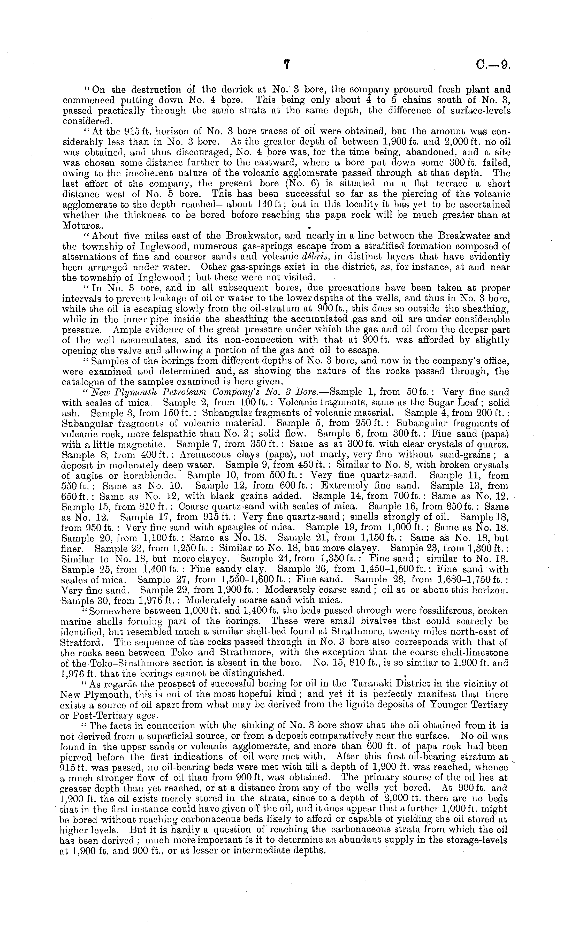 "On the destruction of the derrick at No. 3 bore, the company procured fresh plant and commenced putting down No. 4 bore. This being only about 4to 5 chains south of No. 3, passed practically through the same strata at the same depth, the difference of surface-levels considered. "At the 915 ft. horizon of No. 3 bore traces of oil were obtained, but the amount was considerably less than in No. 3 bore. At the greater depth of between 1,900 ft. and 2,000 ft. no oil was obtained, and thus discouraged, No. 4 bore was, for the time being, abandoned, and a site was chosen some distance further to the eastward, where a bore put down some 300 ft. failed, owing to the incoherent nature of the volcanic agglomerate passed through at that depth. The last effort of the company, the present bore (No. 6) is situated on a flat terrace a short distance west of No. 5 bore. This has been successful so far as the piercing of the volcanic agglomerate to the depth reached—about 140 ft; but in this locality it has yet to be ascertained whether the thickness to be bored before reaching the papa rock will be much greater than at Moturoa. . " About five miles east of the Breakwater, and nearly in a line between the Breakwater and the township of Inglewood, numerous gas-springs escape from a stratified formation composed of alternations of fine and coarser sands and volcanic debris, in distinct layers that have evidently been arranged under water. Other gas-springs exist in the district, as, for instance, at and near the township of Inglewood ; but these were not visited. "In No. 3 bore, and in all subsequent bores, due precautions have been taken at proper intervals to prevent leakage of oil or water to the lower depths of the wells, and thus in No. 3 bore, while the oil is escaping slowly from the oil-stratum at 900 ft., this does so outside the sheathing, while in the inner pipe inside the sheathing the accumulated gas and oil are under considerable pressure. Ample evidence of the great pressure under which the gas and oil from the deeper part of the well accumulates, and its non-connection with that at 900 ft. was afforded by slightly opening the valve and allowing a portion of the gas and oil to escape. " Samples of the borings from different depths of No. 3 bore, and now in the company's office, were examined and determined and, as showing the nature of the rocks passed through, the catalogue of the samples examined is here given. " Neiv Plymouth Petroleum Company's No. 3 Bore. —Sample 1, from 50 ft.: Very fine sand with scales of mica. Sample 2, from 100 ft.: Volcanic fragments, same as the Sugar Loaf; solid ash. Sample 3, from 150 ft. : Subangular fragments of volcanic material. Sample 4, from 200 ft.: Subangular fragments of volcanic material. Sample 5, from 250 ft. : Subangular fragments of volcanic rock, more felspathic than No. 2 ; solid flow. Sample 6, from 300 ft. : Fine sand (papa) with a little magnetite. Sample 7, from 350 ft. : Same as at 300 ft. with clear crystals of quartz. Sample 8; from 400 ft.: Arenaceous clays (papa), not marly, very fine without sand-grains; a deposit in moderately deep water. Sample 9, from 450 ft. : Similar to No. 8, with broken crystals of augite or hornblende. Sample 10, from 500 ft.: Very fine quartz-sand.. Sample 11, from 550 ft.: Same as No. 10. Sample 12, from 600 ft.: Extremely fine sand. Sample 13, from 650 ft. : Same as No. 12, with black grains added. Sample 14, from 700 ft.: Same as No. 12. Sample 15, from 810 ft. : Coarse quartz-sand with scales of mica. Sample 16, from 850 ft.: Same as No. 12. Sample 17, from 915 ft.: Very fine quartz-sand; smells strongly of oil. Sample 18, from 950 ft. : Very fine sand with spangles of mica. Sample 19, from 1,000 ft. : Same as No. 18. Sample 20, from 1,100 ft. : Same as No. 18. Sample 21, from 1,150 ft.: Same as No. 18, but finer. Sample 22, from 1,250 ft. : Similar to No. 18, but more clayey. Sample 23, from 1,300 ft.: Similar to No. 18, but more clayey. Sample 24, from 1,350 ft.: Fine sand ; similar to No. 18. Sample 25, from 1,400 ft.: Fine sandy clay. Sample 26, from 1,450-1,500 ft.: Fine sand with scales of mica. Sample 27, from 1,550-1,600 ft.: Fine sand. Sample 28, from 1,680-1,750 ft. : Very fine sand. Sample 29, from 1,900 ft.: Moderately coarse sand ; oil at or about this horizon. Sample 30, from 1,976 ft. : Moderately coarse sand with mica. "Somewhere between I,oooft. and 1,400 ft. the beds passed through were fossiliferous, broken marine shells forming part of the borings. These were small bivalves that could scarcely be identified, but resembled much a similar shell-bed found at Strathmore, twenty miles north-east of Stratford. The sequence of the rocks passed through in No. 3 bore also corresponds with that of the rocks seen between Toko and Strathmore, with the exception that the coarse shell-limestone of the Toko-Strathmore section is absent in the bore. No. 15, 810 ft., is so similar to 1,900 ft. and 1,976 ft. that the borings cannot be distinguished. " As regards the prospect of successful boring for oil in the Taranaki District in the vicinity of New Plymouth, this is not of the most hopeful kind ; and yet it is perfectly manifest that there exists a source of oil apart from what may be derived from the lignite deposits of Younger Tertiary or Post-Tertiary ages. " The facts in connection with the sinking of No. 3 bore show that the oil obtained from it is not derived from a superficial source, or from a deposit comparatively near the surface. No oil was found in the upper sands or volcanic agglomerate, and more than 600 ft. of papa rock had been pierced before the first indications of oil were met with. After this first oil-bearing stratum at 915 ft. was passed, no oil-bearing beds were met with till a depth of 1,900 ft. was reached, whence a much stronger flow of oil than from 900 ft. was obtained. The primary source of the oil lies at greater depth than yet reached, or at a distance from any of the
