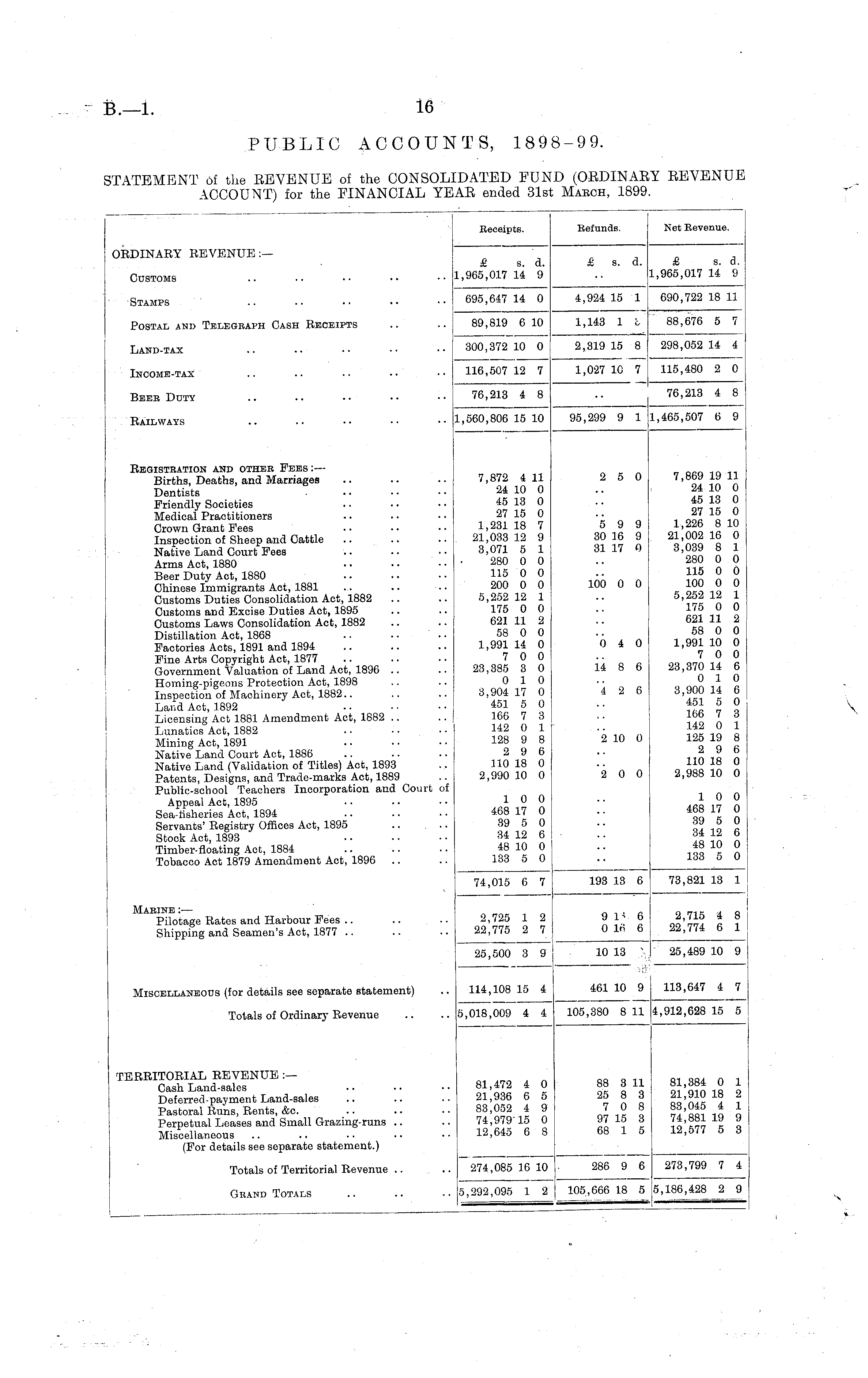 Receipts. Refunds. Net Revenue. ORDINARY REVENUE:— £ s. d. 1,965,017 14 9 £ s. d. £ s. d. Il, 965,017 14 9 Customs Stamps 695,647 14 0 4,924 15 1 690,722 18 11 Postal and Telegraph Cash Receipts 89,819 6 10 1,143 1 88,676 5 7 Land-tax 300,372 10 0 2,319 15 8 298,052 14 4 Income-tax 116,507 12 7 1,027 10 7 115,480 2 0 Beeb Duty 76,213 4 8 76,213 4 8 Railways 1,560,806 15 10 95,299 9 1 1,465,507 6 9 Registration and other Fees :— Births, Deaths, and Marriages Dentists Friendly Societies Medical Practitioners Crown Grant Fees Inspection of Sheep and Cattle Native Land Court Fees Arms Act, 1880 Beer Duty Act, 1880 Chinese Immigrants Act, 1881 Customs Duties Consolidation Act, 1882 Customs and Excise Duties Act, 1895 Customs Laws Consolidation Act, 1882 Distillation Act, 1868 Factories Acts, 1891 and 1894 Fine Arts Copyright Act, 1877 Government Valuation of Land Act, 1896 Homing-pigeons Protection Act, 1898 Inspection of Machinery Act, 1882.. Land Act, 1892 Licensing Act 1881 Amendment Act, 1882 Lunatics Act, 1882 Mining Act, 1891 Native Land Court Act, 1886 Native Land (Validation of Titles) Act, 1893 Patents, Designs, and Trade-marks Act, 1889 Public-school Teachers Incorporation and Court of Appeal Act, 1895 Sea-fisheries Act, 1894 Servants' Registry Offices Act, 1895 .. ... Stock Act, 1893 Timber-floating Act, 1884 Tobacco Act 1879 Amendment Act, 1896 7,872 4 11 24 10 0 45 13 0 27 15 0 1,231 18 7 21,033 12 9 3,071 5 1 280 0 0 115 0 0 200 0 0 5,252 12 1 175 0 0 621 11 2 58 0 0 1,991 14 0 7 0 0 23,385 3 0 0 10 3,904 17 0 451 5 0 166 7 3 142 0 1 128 9 8 2 9 6 110 18 0 2,990 10 0 2 5 0 5 9 9 30 16 9 31 17 0 100 0 0 0 4 0 14 8 6 7,869 19 11 24 10 0 45 13 0 27 15 0 1,226 8 10 21,002 16 0 3,039 8 1 280 0 0 115 0 0 100 0 0 5,252 12 1 175 0 0 621 11 2 58 0 0 1,991 10 0 7 0 0 23,370 14 6 0 1 0 3,900 14 6 451 5 0 166 7 3 142 0 1 125 19 8 2 9 6 110 18 0 2,988 10 0 4 2 6 2 10 0 2 0 0 10 0 468 17 0 39 5 0 34 12 6 48 10 0 133 5 0 10 0 468 17 0 39 5 0 34 12 6 48 10 0 133 5 0 74,015 6 7 193 13 6 73,821 13 1 Marine :— Pilotage Rates and Harbour Fees .. .. Shipping and Seamen's Act, 1877 2,725 1 2 22,775 2 7 9 1-6 Olfi 6 2,715 4 8 22,774 6 1 25,500 3 9 10 13 ' \ 25,489 10 9 Miscellaneous (for details see separate statement) 114,108 15 4 461 10 9 I 113,647 4 7 Totals of Ordinary Revenue 5,018,009 4 4 105,380 8 11 4,912,628 15 5 TERRITORIAL REVENUE :— Cash Land-sales Deferred-payment Land-sales Pastoral Runs, Rents, &c. Perpetual Leases and Small Grazing-runs Miscellaneous (For details see separate statement.) 81,472 4 0 21,936 6 5 83,052 4 9 74,97915 0 12,645 6 8 88 3 11 25 8 3 7 0 8 97 15 3 68 1 5 81,384 0 1 21,910 18 2 83,045 4 1 74,881 19 9 12,577 5 3 Totals of Territorial Revenue 274,085 16 10 286 9 6 273,799 7 4 Geand Totals 105,666 18 5 5,186,428 2 9 5,292,095 1 2