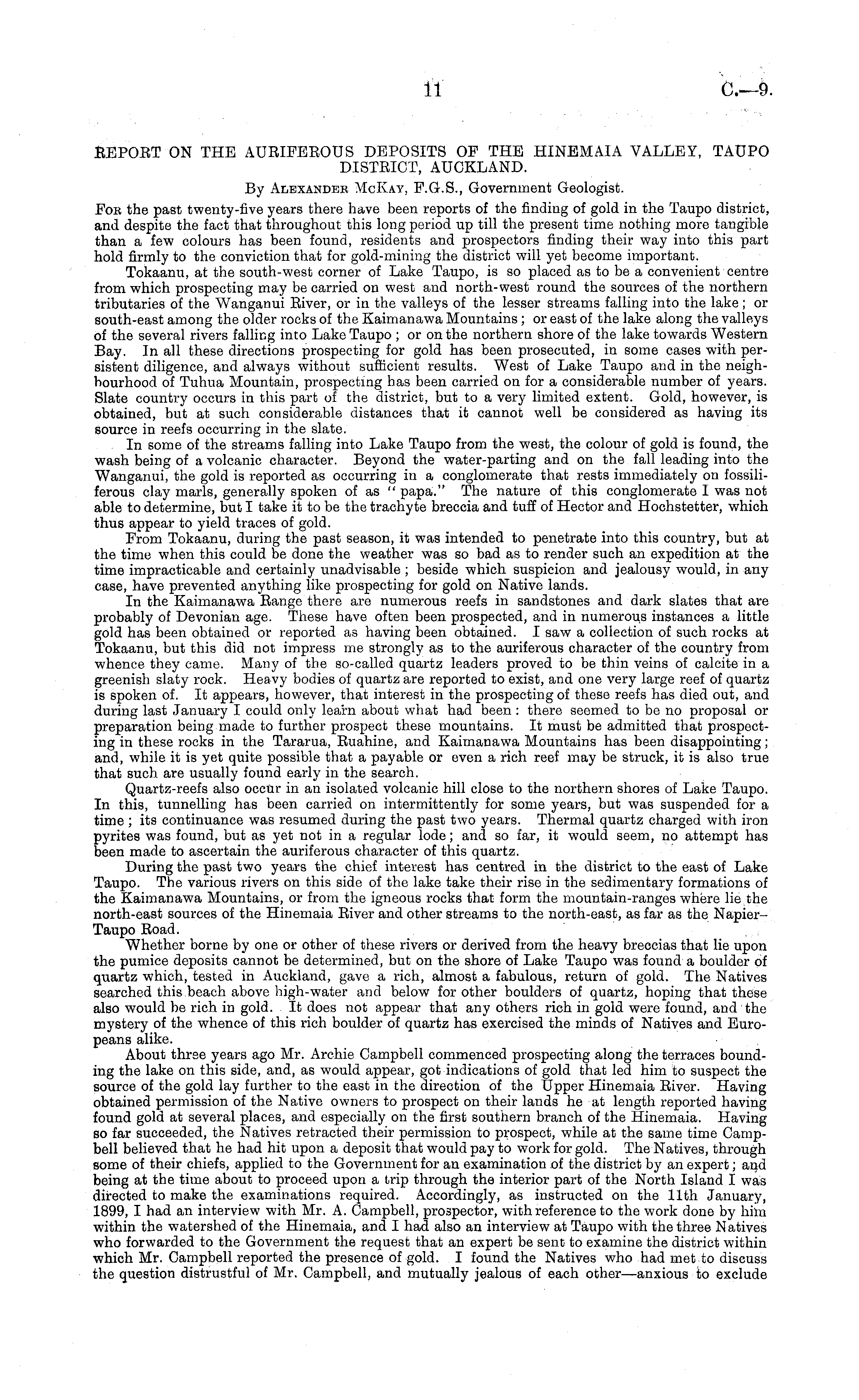 REPORT ON THE AURIFEROUS DEPOSITS OF THE HINEMAIA VALLEY, TAUPO DISTRICT, AUCKLAND. By Alexandee McKay, F.G.S., Government Geologist. Foe the past twenty-five years there have been reports of the finding of gold in the Taupo district, and despite the fact that throughout this long period up till the present time nothing more tangible than a few colours has been found, residents and prospectors finding their way into this part hold firmly to the conviction that for gold-mining the district will yet become important. Tokaanu, at the south-west corner of Lake Taupo, is so placed as to be a convenient centre from which prospecting may be carried on west and north-west round the sources of the northern tributaries of the Wanganui River, or in the valleys of the lesser streams falling into the lake; or south-east among the older rocks of the Kaimanawa Mountains; or east of the lake along the valleys of the several rivers falling into Lake Taupo ; or on the northern shore of the lake towards Western Bay. In all these directions prospecting for gold has been prosecuted, in some cases with persistent diligence, and always without sufficient results. West of Lake Taupo and in the neighbourhood of Tuhua Mountain, prospecting has been carried on for a considerable number of years. Slate country occurs in this part of the district, but to a very limited extent. Gold, however, is obtained, but at such considerable distances that it cannot well be considered as having its source in reefs occurring in the slate. In some of the streams falling into Lake Taupo from the weet, the colour of gold is found, the wash being of a volcanic character. Beyond the water-parting and on the fall leading into the Wanganui, the gold is reported as occurring in a conglomerate that rests immediately on fossiliferous clay marls, generally spoken of as " papa." The nature of this conglomerate I was not able to determine, but I take it to be the trachyte breccia and tuff of Hector and Hochstetter, which thus appear to yield traces of gold. From Tokaanu, during the past season, it was intended to penetrate into this country, but at the time when this could be done the weather was so bad as to render such an expedition at the time impracticable and certainly unadvisable ; beside which suspicion and jealousy would, in any case, have prevented anything like prospecting for gold on Native lands. In the Kaimanawa Range there are numerous reefs in sandstones and dark slates that are probably of Devonian age. These have often been prospected, and in numerous instances a little gold has been obtained or reported as having been obtained. I saw a collection of such rocks at Tokaanu, but this did not impress me strongly as to the auriferous character of the country from whence they came. Many of the so-called quartz leaders proved to be thin veins of calcite in a greenish slaty rock. Heavy bodies of quartz are reported to exist, and one very large reef of quartz is spoken of. It appears, however, that interest in the prospecting of these reefs has died out, and during last January I could only learn about what had been : there seemed to be no proposal or preparation being made to further prospect these mountains. It must be admitted that prospecting in these rocks in the Tararua, Ruahine, and Kaimanawa Mountains has been disappointing; and, while it is yet quite possible that a payable or even a rich reef may be struck, it is also true that such are usually found early in the search. Quartz-reefs also occur in an isolated volcanic hill close to the northern shores of Lake Taupo. In this, tunnelling has been carried on intermittently for some years, but was suspended for a time ; its continuance was resumed during the past two years. Thermal quartz charged with iron pyrites was found, but as yet not in a regular lode; and so far, it would seem, no attempt has been made to ascertain the auriferous character of this quartz. During the past two years the chief interest has centred in the district to the east of Lake Taupo. The various rivers on this side of the lake take their rise in the sedimentary formations of the Kaimanawa Mountains, or from the igneous rocks that form the mountain-ranges where lie the north-east sources of the Hinemaia River and other streams to the north-east, as far as the NapierTaupo Road. Whether borne by one or other of these rivers or derived from the heavy breccias that lie upon the pumice deposits cannot be determined, but on the shore of Lake Taupo was found a boulder of quartz which, tested in Auckland, gave a rich, almost a fabulous, return of gold. The Natives searched this beach above high-water and below for other boulders of quartz, hoping that these also would be rich in gold. It does not appear that any others rich in gold were found, and the mystery of the whence of this rich boulder of quartz has exercised the minds of Natives and Europeans alike. About thrse years ago Mr. Archie Campbell commenced prospecting along the terraces bounding the lake on this side, and, as would appear, got indications of gold that led him to suspect the source of the gold lay further to the east in the direction of the Upper Hinemaia River. Having obtained permission of the Native owners to prospect on their lands he at length reported having found gold at several places, and especially on the first southern branch of the Hinemaia. Having so far succeeded, the Natives retracted their permission to prospect, while at the same time Campbell believed that he had hit upon a deposit that would pay to work for gold. The Natives, through some of their chiefs, applied to the Government for an examination of the district by an expert; and being at the time about to proceed upon a trip through the interior part of the North Island I was directed to make the examinations required. Accordingly, as instructed on the 11th January, 1899, I had an interview with Mr. A. Campbell, prospector, with reference to the work done by him within