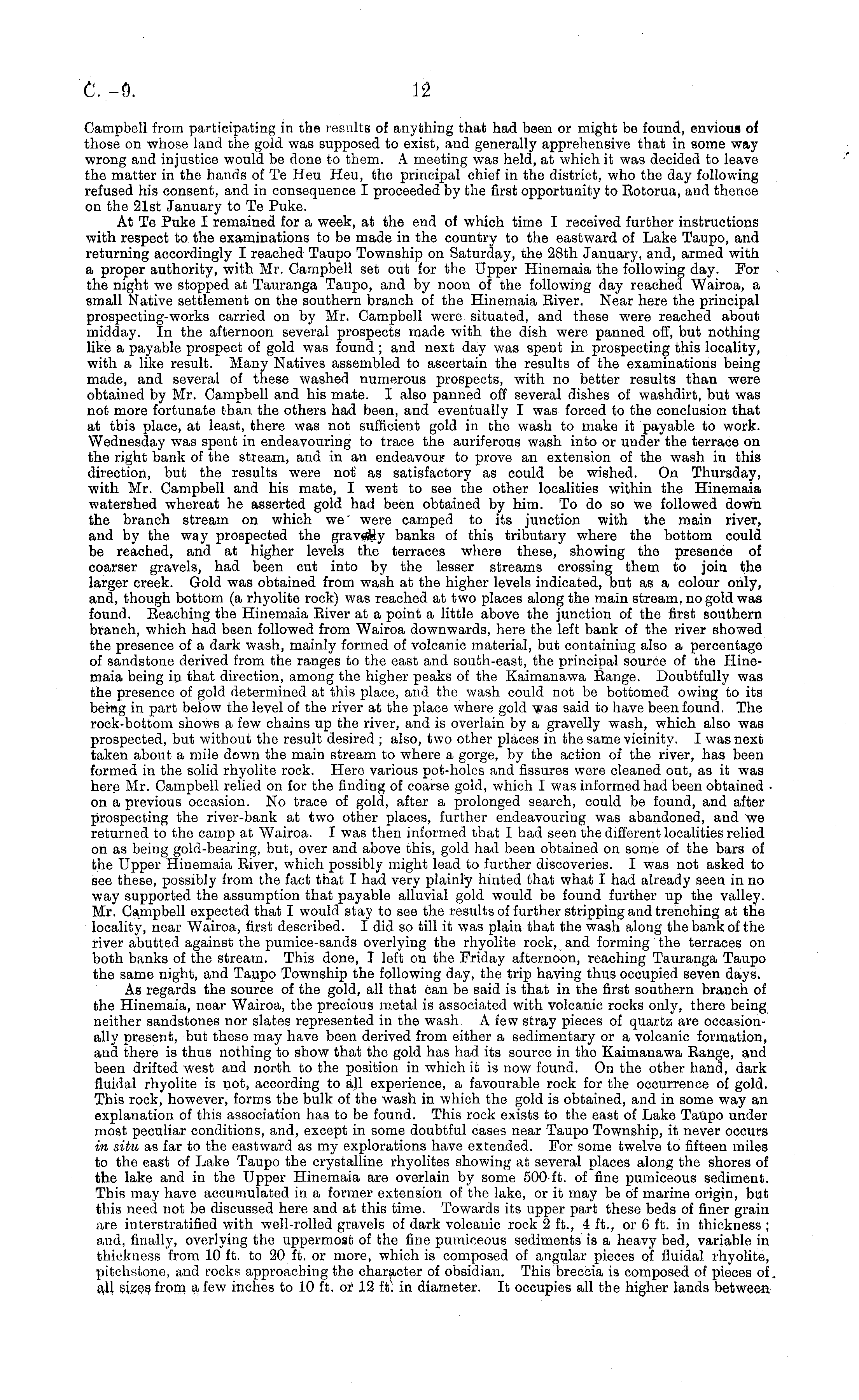 Campbell from participating in the results of anything that had been or might be found, envious 01 those on whose land the gold was supposed to exist, and generally apprehensive that in some way wrong and injustice would be done to them. A meeting was held, at which it was decided to leave the matter in the hands of Te Heu Heu, the principal chief in the district, who the day following refused his consent, and in consequence I proceeded by the first opportunity to Eotorua, and thence on the 21st January to Te Puke. At Te Puke I remained for a week, at the end of which time I received further instructions with respect to the examinations to be made in the country to the eastward of Lake Taupo, and returning accordingly I reached Taupo Township on Saturday, the 28th January, and, armed with a proper authority, with Mr. Campbell set out for the Upper Hinemaia the following day. For the night we stopped at Tauranga Taupo, and by noon of the following day reached Wairoa, a small Native settlement on the southern branch of the Hinemaia Eiver. Near here the principal prospecting-works carried on by Mr. Campbell were situated, and these were reached about midday. In the afternoon several prospects made with the dish were panned off, but nothing like a payable prospect of gold was found ; and next day was spent in prospecting this locality, with a like result. Many Natives assembled to ascertain the results of the examinations being made, and several of these washed numerous prospects, with no better results than were obtained by Mr. Campbell and his mate. I also panned off several dishes of washdirt, but was not more fortunate than the others had been, and eventually I was forced to the conclusion that at this place, at least, there was not sufficient gold in the wash to make it payable to work. Wednesday was spent in endeavouring to trace the auriferous wash into or under the terrace on the right bank of the stream, and in an endeavour to prove an extension of the wash in this direction, but the results were not' as satisfactory as could be wished. On Thursday, with Mr. Campbell and his mate, I went to see the other localities within the Hinemaia watershed whereat he asserted gold had been obtained by him. To do so we followed down the branch stream on which we were camped to its junction with the main river, and by the way prospected the gravely banks of this tributary where the bottom could be reached, and at higher levels the terraces where these, showing the presence of coarser gravels, had been cut into by the lesser streams crossing them to join the larger creek. Gold was obtained from wash at the higher levels indicated, but as a colour only, and, though bottom (a rhyolite rock) was reached at two places along the main stream, no gold was found. Eeaching the Hinemaia River at a point a little above the junction of the first southern branch, which had been followed from Wairoa downwards, here the left bank of the river showed the presence of a dark wash, mainly formed of volcanic material, but containing also a percentage of sandstone derived from the ranges to the east and south-east, the principal source of the Hinemaia being in that direction, among the higher peaks of the Kaimanawa Bange. Doubtfully was the presence of gold determined at this place, and the wash could not be bottomed owing to its bei-ng in part below the level of the river at the place where gold was said to have been found. The rock-bottom shows a few chains up the river, and is overlain by a gravelly wash, which also was prospected, but without the result desired ; also, two other places in the same vicinity. I was next taken about a mile down the main stream to where a gorge, by the action of the river, has been formed in the solid rhyolite rock. Here various pot-holes and fissures were cleaned out, as it was here Mr. Campbell relied on for the finding of coarse gold, which I was informed had been obtained ■ on a previous occasion. No trace of gold, after a prolonged search, could be found, and after prospecting the river-bank at two other places, further endeavouring was abandoned, and we returned to the camp at Wairoa. I was then informed that I had seen the different localities relied on as being gold-bearing, but, over and above this, gold had been obtained on some of the bars of the Upper Hinemaia Eiver, which possibly might lead to further discoveries. I was not asked to see these, possibly from the fact that I had very plainly hinted that what I had already seen in no way supported the assumption that payable alluvial gold would be found further up the valley. Mr. Campbell expected that I would stay to see the results of further stripping and trenching at the locality, near Wairoa, first described. I did so till it was plain that the wash along the bank of the river abutted against the pumice-sands overlying the rhyolite rock, and forming the terraces on both banks of the stream. This done, I left on the Friday afternoon, reaching Tauranga Taupo the same night, and Taupo Township the following day, the trip having thus occupied seven days. As regards the source of the gold, all that can be said is that in the first southern branch of the Hinemaia, near Wairoa, the precious metal is associated with volcanic rocks only, there being neither sandstones nor slates represented in the wash. A few stray pieces of quartz are occasionally present, but these may have been derived from either a sedimentary or a volcanic formation, and there is thus nothing to show that the gold has had its source in the Kaimanawa Range, and been drifted west and north to the position in which it is now found. On the other hand, dark fluidal rhyolite is not, according to all experience, a favourable rock for the occurrence of gold. This rock, however, forms the bulk of the wash in which the gold is obtained, and in some way an explanation of this association has to be found. This rock exists to the east of Lake Taupo under most peculia