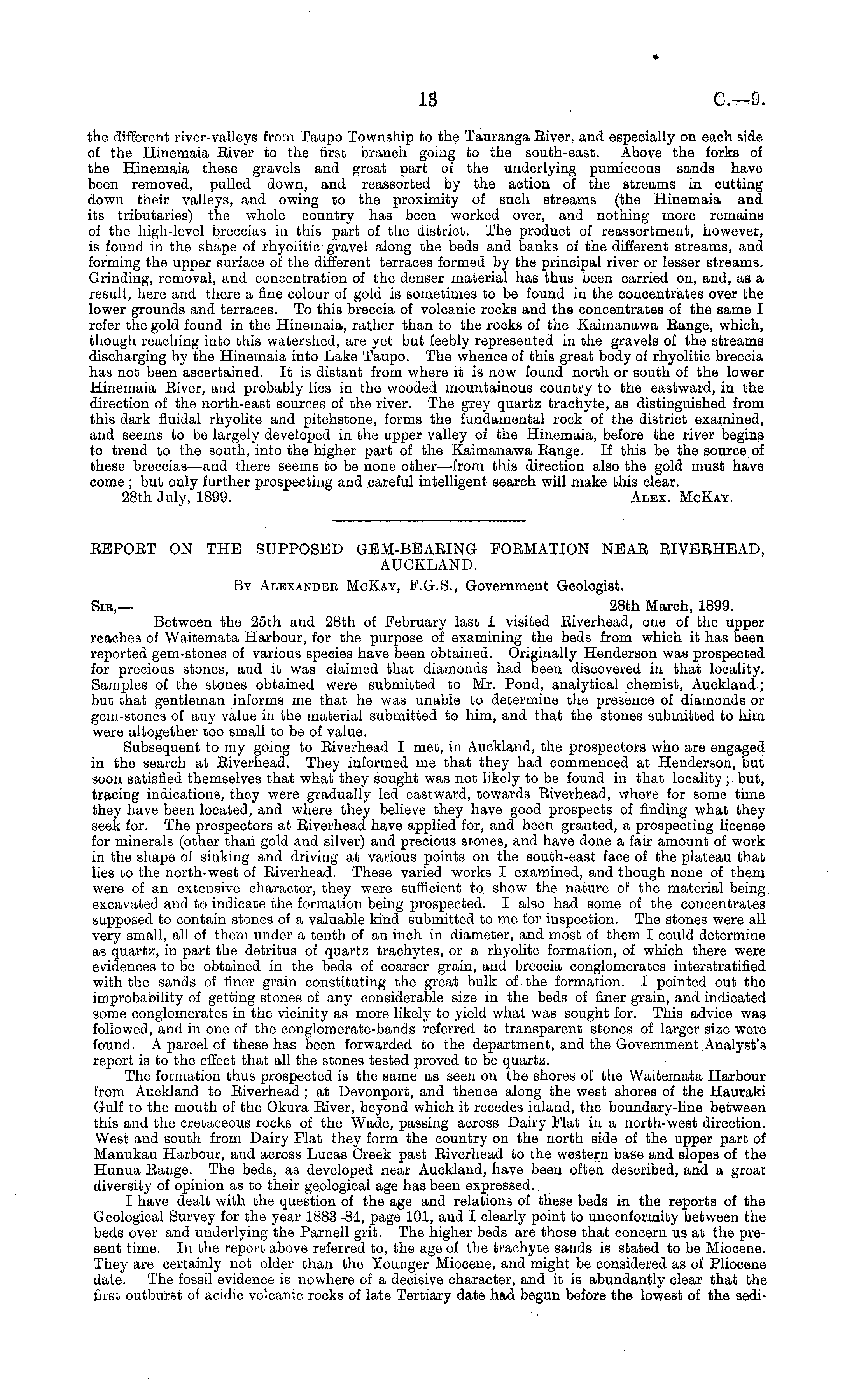 BEPORT ON THE SUPPOSED GEM-BEAEING FORMATION NEAR RIVERHEAD, AUCKLAND. By Albxandeb McKay, F.G.S., Government Geologist. Sib,— 28th March, 1899. Between the 25th and 28th of February last I visited Riverhead, one of the upper reaches of Waitemata Harbour, for the purpose of examining the beds from which it has been reported gem-stones of various species have been obtained. Originally Henderson was prospected for precious stones, and it was claimed that diamonds had been discovered in that locality. Samples of the stones obtained were submitted to Mr. Pond, analytical chemist, Auckland; but that gentleman informs me that he was unable to determine the presence of diamonds or gem-stones of any value in the material submitted to him, and that the stones submitted to him were altogether too small to be of value. Subsequent to my going to Riverhead I met, in Auckland, the prospectors who are engaged in the search at Riverhead. They informed me that they had commenced at Henderson, but soon satisfied themselves that what they sought was not likely to be found in that locality; but, tracing indications, they were gradually led eastward, towards Riverhead, where for some time they have been located, and where they believe they have good prospects of finding what they seek for. The prospectors at Riverhead have applied for, and been granted, a prospecting license for minerals (other than gold and silver) and precious stones, and have done a fair amount of work in the shape of sinking and driving at various points on the south-east face of the plateau that lies to the north-west of Riverhead. These varied works I examined, and though none of them were of an extensive character, they were sufficient to show the nature of the material being excavated and to indicate the formation being prospected. I also had some of the concentrates supposed to contain stones of a valuable kind submitted to me for inspection. The stones were all very small, all of them under a tenth of an inch in diameter, and most of them I could determine as quartz, in part the detritus of quartz trachytes, or a rhyolite formation, of which there were evidences to be obtained in the beds of coarser grain, and breccia conglomerates interstratified with the sands of finer grain constituting the great bulk of the formation. I pointed out the improbability of getting stones of any considerable size in the beds of finer grain, and indicated some conglomerates in the vicinity as more likely to yield what was sought for. This advice was followed, and in one of the conglomerate-bands referred to transparent stones of larger size were found. A parcel of these has been forwarded to the department, and the Government Analyst's report is to the effect that all the stones tested proved to be quartz. The formation thus prospected is the same as seen on the shores of the Waitemata Harbour from Auckland to Riverhead; at Devonport, and thence along the west shores of the Hauraki Gulf to the mouth of the Okura River, beyond which it recedes inland, the boundary-line between this and the cretaceous rocks of the Wade, passing across Dairy Flat in a north-west direction. West and south from Dairy Flat they form the country on the north side of the upper part of Manukau Harbour, and across Lucas Creek past Riverhead to the western base and slopes of the Hunua Range. The beds, as developed near Auckland, have been often described, and a great diversity of opinion as to their geological age has been expressed. I have dealt with the question of the age and relations of these beds in the reports of the Geological Survey for the year 1883-84, page 101, and I clearly point to unconformity between the beds over and underlying the Parnell grit. The higher beds are those that concern us at the present time. In the report above referred to, the age of the trachyte sands is stated to be Miocene. They are certainly not older than the Younger Miocene, and might be considered as of Pliocene date. The fossil evidence is nowhere of a decisive character, and it is abundantly clear that the first outburst of acidic volcanic rocks of late Tertiary date had begun before the lowest of the sedi-