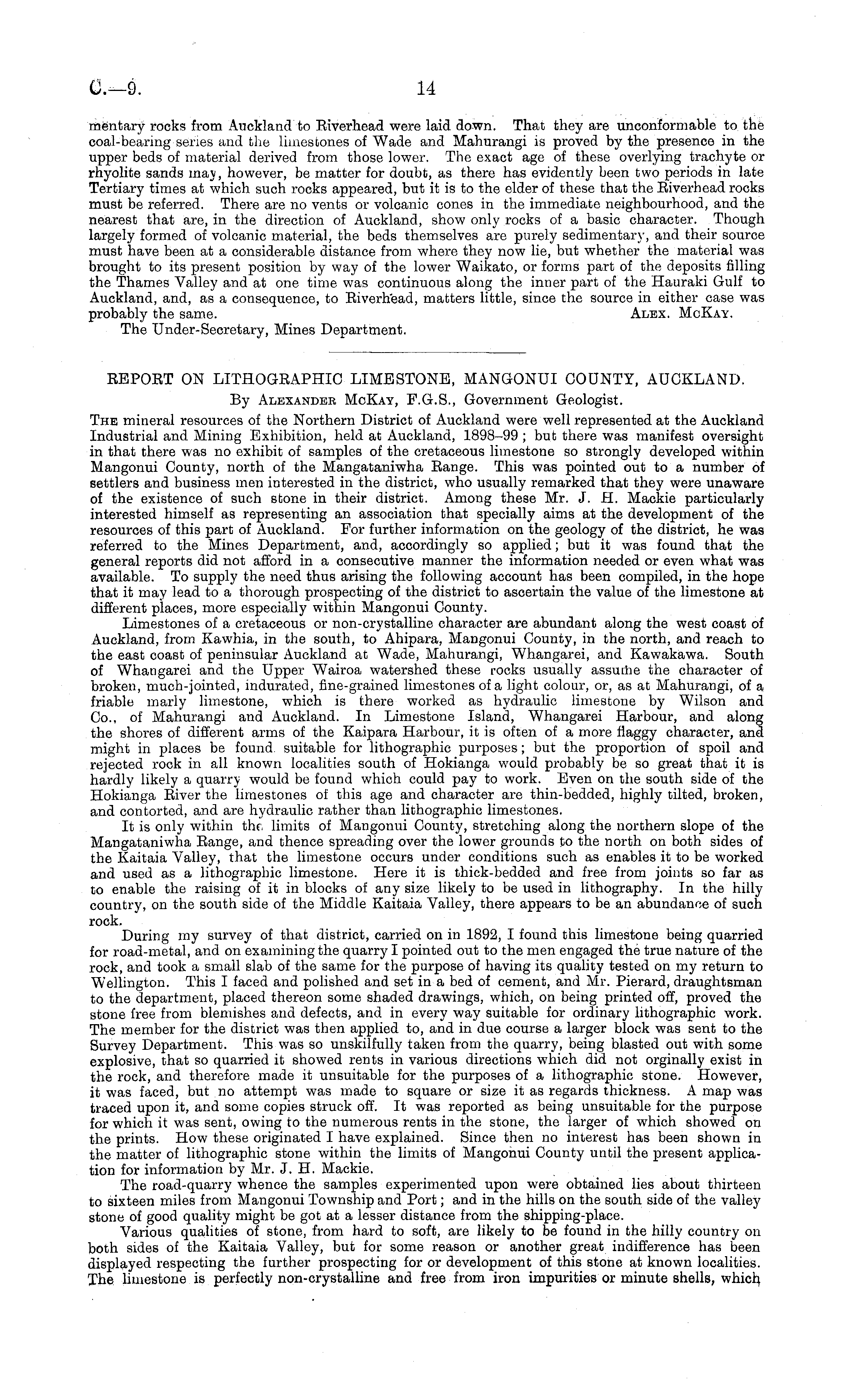 EEPOBT ON LITHOGRAPHIC LIMESTONE, MANGONUI COUNTY, AUCKLAND. By Alexander McKay, F.G.S., Government Geologist. The mineral resources of the Northern District of Auckland were well represented at the Auckland Industrial and Mining Exhibition, held at Auckland, 1898-99 ; but there was manifest oversight in that there was no exhibit of samples of the cretaceous limestone so strongly developed within Mangonui County, north of the Mangataniwha Eange. This was pointed out to a number of settlers and business men interested in the district, who usually remarked that they were unaware of the existence of such stone in their district. Among these Mr. J. H. Mackie particularly interested himself as representing an association that specially aims at the development of the resources of this part of Auckland. For further information on the geology of the district, he was referred to the Mines Department, and, accordingly so applied; but it was found that the general reports did not afford in a consecutive manner the information needed or even what was available. To supply the need thus arising the following account has been compiled, in the hope that it may lead to a thorough prospecting of the district to ascertain the value of the limestone at different places, more especially within Mangonui County. Limestones of a cretaceous or non-crystalline character are abundant along the west coast of Auckland, from Kawhia, in the south, to Ahipara, Mangonui County, in the north, and reach to the east coast of peninsular Auckland at Wade, Mahurangi, Whangarei, and Kawakawa. South of Whangarei and the Upper Wairoa watershed these rocks usually assuilie the character of broken, much-jointed, indurated, fine-grained limestones of a light colour, or, as at Mahurangi, of a friable marly limestone, which is there worked as hydraulic limestone by Wilson and Co., of Mahurangi and Auckland. In Limestone Island, Whangarei Harbour, and along the shores of different arms of the Kaipara Harbour, it is often of a more flaggy character, and might in places be found suitable for lithographic purposes ; but the proportion of spoil and rejected rock in all known localities south of Hokianga would probably be so great that it is hardly likely a quarry would be found which could pay to work. Even on the south side of the Hokianga River the limestones of this age and character are thin-bedded, highly tilted, broken, and contorted, and are hydraulic rather than lithographic limestones. It is only within the limits of Mangonui County, stretching along the northern slope of the Mangataniwha Eange, and thence spreading over the lower grounds to the north on both sides of the Kaitaia Valley, that the limestone occurs under conditions such as enables it to be worked and used as a lithographic limestone. Here it is thick-bedded and free from joints so far as to enable the raising of it in blocks of any size likely to be used in lithography. In the hilly country, on the south side of the Middle Kaitaia Valley, there appears to be an abundance of such rock. During my survey of that district, carried on in 1892, I found this limestone being quarried for road-metal, and on examining the quarry I pointed out to the men engaged the true nature of the rock, and took a small slab of the same for the purpose of having its quality tested on my return to Wellington. This I faced and polished and set in a bed of cement, and Mr. Pierard, draughtsman to the department, placed thereon some shaded drawings, which, on being printed off, proved the stone free from blemishes and defects, and in every way suitable for ordinary lithographic work. The member for the district was then applied to, and in due course a larger block was sent to the Survey Department. This was so unskilfully taken from the quarry, being blasted out with some explosive, that so quarried it showed rents in various directions which did not orginally exist in the rock, and therefore made it unsuitable for the purposes of a lithographic stone. However, it was faced, but no attempt was made to square or size it as regards thickness. A map was traced upon it, and some copies struck off. It was reported as being unsuitable for the purpose for which it was sent, owing to the numerous rents in the stone, the larger of which showed on the prints. How these originated I have explained. Since then no interest has been shown in the matter of lithographic stone within the limits of Mangonui County until the present application for information by Mr. J. H. Mackie. The road-quarry whence the samples experimented upon were obtained lies about thirteen to sixteen miles from Mangonui Township and Port; and in the hills on the south side of the valley stone of good quality might be got at a lesser distance from the shipping-place. Various qualities of stone, from hard to soft, are likely to be found in the hilly country on both sides of the Kaitaia Valley, but for some reason or another great indifference has been displayed respecting the further prospecting for or development of this stone at known localities. The limestone is perfectly non-crystalline and free from iron impurities or minute shells, whicl}