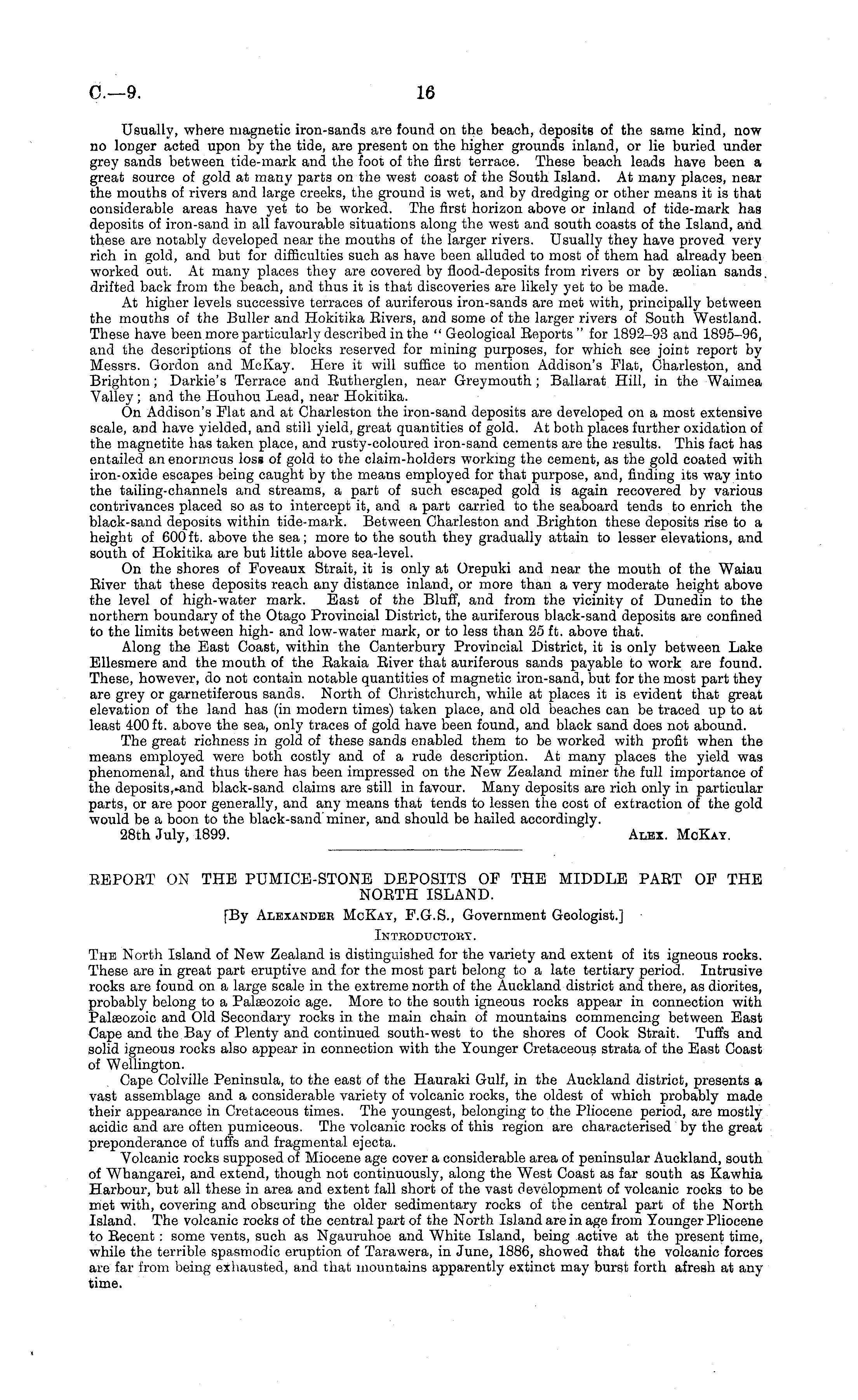 Usually, where magnetic iron-sands are found on the beach, deposits of the same kind, now no longer acted upon by the tide, are present on the higher grounds inland, or lie buried under grey sands between tide-mark and the foot of the first terrace. These beach leads have been a great source of gold at many parts on the west coast of the South Island. At many places, near the mouths of rivers and large creeks, the ground is wet, and by dredging or other means it is that considerable areas have yet to be worked. The first horizon above or inland of tide-mark has deposits of iron-sand in all favourable situations along the west and south coasts of the Island, and these are notably developed near the mouths of the larger rivers. Usually they have proved very rich in gold, and but for difficulties such as have been alluded to most of them had already been worked out. At many places they are covered by flood-deposits from rivers or by seolian sands drifted back from the beach, and thus it is that discoveries are likely yet to be made. At higher levels successive terraces of auriferous iron-sands are met with, principally between the mouths of the Buller and Hokitika Eivers, and some of the larger rivers of South Westland. These have been more particularly described in the "Geological Eeports " for 1892-93 and 1895-96, and the descriptions of the blocks reserved for mining purposes, for which see joint report by Messrs. Gordon and McKay. Here it will suffice to mention Addison's Flat, Charleston, and Brighton; Darkies Terrace and Eutherglen, near Greymouth ; Ballarat Hill, in the Waimea Valley; and the Houhou Lead, near Hokitika. On Addison's Flat and at Charleston the iron-sand deposits are developed on a most extensive scale, and have yielded, and still yield, great quantities of gold. At both places further oxidation of the magnetite has taken place, and rusty-coloured iron-sand cements are the results. This fact has entailed an enormous loss of gold to the claim-holders working the cement, as the gold coated with iron-oxide escapes being caught by the means employed for that purpose, and, finding its way into the tailing-channels and streams, a part of such escaped gold is again recovered by various contrivances placed so as to intercept it, and a part carried to the seaboard tends to enrich the black-sand deposits within tide-mark. Between Charleston and Brighton these deposits rise to a height of 600 ft. above the sea; more to the south they gradually attain to lesser elevations, and south of Hokitika are but little above sea-level. On the shores of Foveaux Strait, it is only at Orepuki and near the mouth of the Waiau Eiver that these deposits reach any distance inland, or more than a very moderate height above the level of high-water mark. East of the Bluff, and from the vicinity of Dunedin to the northern boundary of the Otago Provincial District, the auriferous black-sand deposits are confined to the limits between high- and low-water mark, or to less than 25 ft. above that. Along the Bast Coast, within the Canterbury Provincial District, it is only between Lake Ellesmere and the mouth of the Eakaia Eiver that auriferous sands payable to work are found. These, however, do not contain notable quantities of magnetic iron-sand, but for the most part they are grey or garnetiferous sands. North of Christchurch, while at places it is evident that great elevation of the land has (in modern times) taken place, and old beaches can be traced up to at least 400 ft. above the sea, only traces of gold have been found, and black sand does not abound. The great richness in gold of these sands enabled them to be worked with profit when the means employed were both costly and of a rude description. At many places the yield was phenomenal, and thus there has been impressed on the New Zealand miner the full importance of the deposits,*and black-sand claims are still in favour. Many deposits are rich only in particular parts, or are poor generally, and any means that tends to lessen the cost of extraction of the gold would be a boon to the black-sand miner, and should be hailed accordingly. 28th July, 1899. Alex. McKay.