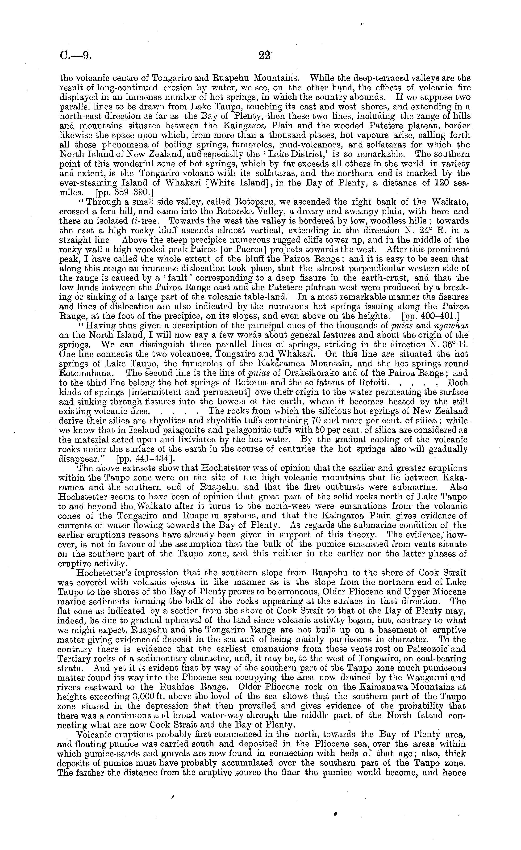 the volcanic centre of Tongariro and Buapehu Mountains. While the deep-terraced valleys are the result of long-continued erosion by water, we see, on the other hand, the effects of volcanic fire displayed in an immense number of hot springs, in which the country abounds. If we suppose two parallel lines to be drawn from Lake Taupo, touching its east and west shores, and extending in a north-east direction as far as the Bay of Plenty, then these two lines, including the range of hills and mountains situated between the Kaingaroa Plain and the wooded Patetere plateau, border likewise the space upon which, from more than a thousand places, hot vapours arise, calling forth all those phenomena of boiling springs, fumaroles, mud-volcanoes, and solfataras for which the North Island of New Zealand, and especially the ' Lake District,' is so remarkable. The southern point of this wonderful zone of hot springs, which by far exceeds all others in the world in variety and extent, is the Tongariro volcano with its solfataras, and the northern end is marked by the ever-steaming Island of Whakari [White Island], in the Bay of Plenty, a distance of 120 seamiles, [pp. 389-390.] " Through a small side valley, called Eotoparu, we ascended the right bank of the Waikato, crossed a fern-hill, and came into the Eotoreka Valley, a dreary and swampy plain, with here and there an isolated ti-tree. Towards the west the valley is bordered by low, woodless hills ; towards the east a high rocky bluff ascends almost vertical, extending in the direction N. 24° E. in a straight line. Above the steep precipice numerous rugged cliffs tower up, and in the middle of the rocky wall a high wooded peak Pairoa [or Paeroa] projects towards the west. After this prominent peak, I have called the whole extent of the bluff the Pairoa Bange; and it is easy to be seen that along this range an immense dislocation took place, that the almost perpendicular western side of the range is caused by a ' fault' corresponding to a deep fissure in the earth-crust, and that the low lands between the Pairoa Eange east and the Patetere plateau west were produced by a breaking or sinking of a large part of the volcanic table-land. In a most remarkable manner the fissures and lines of dislocation are also indicated by the numerous hot springs issuing along the Pairoa Eange, at the foot of the precipice, on its slopes, and even above on the heights, [pp. 400-401.] " Having thus given a description of the principal ones of the thousands of puias and ngawhas on the North Island, I will now say a few words about general features and about the origin of the springs. We can distinguish three parallel lines of springs, striking in the direction N. 36° E. One line connects the two volcanoes, Tongariro and Whakari. On this line are situated the hot springs of Lake Taupo, the fumaroles of the Kakaramea Mountain, and the hot springs round Eotomahana. The second line is the line of puias of Orakeikorako and of the Pairoa Eange; and to the third line belong the hot springs of Eotorua and the solfataras of Eotoiti Both kinds of springs [intermittent and permanent] owe their origin to the water permeating the surface and sinking through fissures into the bowels of the earth, where it becomes heated by the still existing volcanic fires The rocks from which the silicious hot springs of New Zealand derive their silica are rhyolites and rhyolitie tuffs containing 70 and more per cent, of silica ; while we know that in Iceland palagonite and palagonitic tuffs with 50 per cent, of silica are considered as the material acted upon and lixiviated by the hot water. By the gradual cooling of the volcanic rocks under the surface of the earth in the course of centuries the hot springs also will gradually disappear." [pp. 441-434]. The above extracts show that Hochstetter was of opinion that the earlier and greater eruptions within the Taupo zone were on the site of the high volcanic mountains that lie between Kakaramea and the southern end of Euapehu, and that the first outbursts were submarine. Also Hochstetter seems to have been of opinion that great part of the solid rocks north of Lake Taupo to and beyond the Waikato after it turns to the north-west were emanations from the volcanic cones of the Tongariro and Euapehu systems, and that the Kaingaroa Plain gives evidence of currents of water flowing towards the Bay of Plenty. As regards the submarine condition of the earlier eruptions reasons have already been given in support of this theory. The evidence, however, is not in favour of the assumption that the bulk of the pumice emanated from vents situate on the southern part of the Taupo zone, and this neither in the earlier nor the latter phases of eruptive activity. Hochstetter's impression that the southern slope from Euapehu to the shore of Cook Strait was covered with volcanic ejeeta in like manner as is the slope from the northern end of Lake Taupo to the shores of the Bay of Plenty proves to be erroneous, Older Pliocene and Upper Miocene marine sediments forming the bulk of the rocks appearing at the surface in that direction. The flat cone as indicated by a section from the shore of Cook Strait to that of the Bay of Plenty may, indeed, be due to gradual upheaval of the land since volcanic activity began, but, contrary to what we might expect, Euapehu and the Tongariro Eange are not built up on a basement of eruptive matter giving evidence of deposit in the sea and of being mainly pumiceous in character. To the contrary there is evidence that the earliest emanations from these vents rest on Palaeozoic'and Tertiary rocks of a sedimentary character, and, it may be, to the west of Tongariro, on coal-bearing strata. And yet it is evident that by way of the southern part of the Taupo zone much pumiceous matter found its way into the Pliocene sea occupying the area now drained by the Wanganui and rivers eastward to "the Euahine Eange. Older Pliocene rock on the Kaimanawa M
