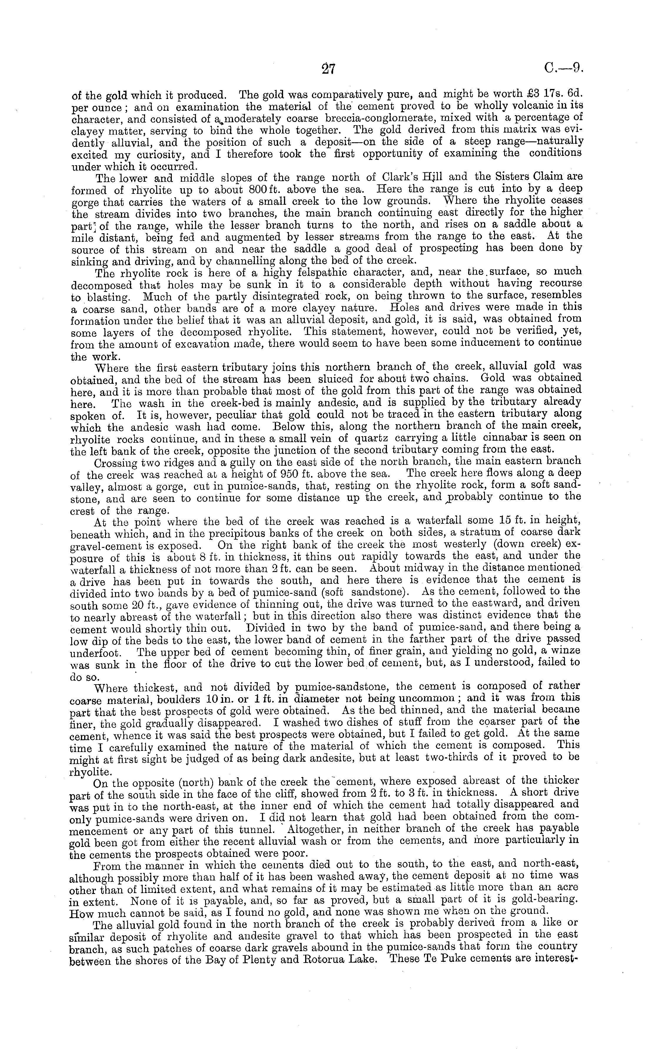 of the gold which it produced. The gold was comparatively pure, and might be worth £3 17s. 6d. per ounce; and on examination the material of the cement proved to be wholly volcanic in its character, and consisted of coarse breccia-conglomerate, mixed with a percentage of clayey matter, serving to bind the whole together. The gold derived from this matrix was evidently alluvial, and the position of such a deposit—on the side of a steep range—naturally excited my curiosity, and I therefore took the first opportunity of examining the conditions under which it occurred. The lower and middle slopes of the range north of Clark's Hjll and the Sisters Claim are formed of rhyolite up to about 800 ft. above the sea. Here the range is cut into by a deep gorge that carries the waters of a small creek to the low grounds. Where the rhyolite ceases the stream divides into two branches, the main branch continuing east directly for the higher part" of the range, while the lesser branch turns to the north, and rises on a saddle about a mile" distant, being fed and augmented by lesser streams from the range to the east. At the source of this stream on and near the saddle a good deal of prospecting has been done by sinking and driving, and by channelling along the bed of the creek. The rhyolite rock is here of a highy felspathic character, and, near the.surface, so much decomposed that holes may be sunk in it to a considerable depth without having recourse to blasting. Much of the partly disintegrated rock, on being thrown to the surface, resembles a coarse sand, other bands are of a more clayey nature. Holes and drives were made in this formation under the belief that it was an alluvial deposit, and gold, it is said, was obtained from some layers of the decomposed rhyolite. This statement, however, could not be verified, yet, from the amount of excavation made, there would seem to have been some inducement to continue the work. Where the first eastern tributary joins this northern branch of the creek, alluvial gold was obtained, and the bed of the stream has been sluiced for about two chains. Gold was obtained here, and it is more than probable that most of the gold from this part of the range was obtained here. The wash in the creek-bed is mainly andesic, and is supplied by the tributary already spoken of. It is, however, peculiar that gold could not be traced in the eastern tributary along which the andesic wash had come. Below this, along the northern branch of the main creek, rhyolite rocks continue, and in these a small vein of quartz carrying a little cinnabar is seen on the left bank of the creek, opposite the junction of the second tributary coming from the east. Crossing two ridges and a guily on the east side of the north branch, the main eastern branch of the creek was reached at a height of 950 ft. above the sea. The creek here flows along a deep valley, almost a gorge, cut in pumice-sands, that, resting on the rhyolite rock, form a soft sandstone, and are seen to continue for some distance up the creek, and probably continue to the crest of the range. At the point where the bed of the creek was reached is a waterfall some 15 ft. in height, beneath which, and in the precipitous banks of the creek on both sides, a stratum of coarse dark gravel-cement is exposed. On the right bank of the creek the most westerly (down creek) exposure of this is about 8 ft. in thickness, it thins out rapidly towards the east, and under the waterfall a thickness of not more than 2 ft. can be seen. About midway in the distance mentioned a drive has been put in towards the south, and here there is evidence that the cement is divided into two bands by a bed of pumice-sand (soft sandstone). As the cement, followed to the south some 20 ft., gave evidence of thinning out, the drive was turned to the eastward, and driven to nearly abreast of the waterfall; but in this direction also there was distinct evidence that the cement would shortly thin out. Divided in two by the band of pumice-sand, and there being a low dip of the beds to the east, the lower band of cement in the farther part of the drive passed underfoot. The upper bed of cement becoming thin, of finer grain, and yielding no gold, a winze was sunk in the floor of the drive to cut the lower bed of cement, but, as I understood, failed to do so. Where thickest, and not divided by pumice-sandstone, the cement is composed of rather coarse material, boulders 10 in. or lft. in diameter not being uncommon ; and it was from this part that the best prospects of gold were obtained. As the bed thinned, and the material became finer, the gold gradually disappeared. I washed two dishes of stuff from the coarser part of the cement, whence it was said the best prospects were obtained, but I failed to get gold. At the same time I carefully examined the nature of the material of which the cement is composed. This might at first sight be judged of as being dark andesite, but at least two-thirds of it proved to be rhyolite. ■ On the opposite (north) bank of the creek the cement, where exposed abreast of the thicker part of the south side in the face of the cliff, showed from 2 ft. to 3 ft. in thickness. _ A short drive was put in to the north-east, at the inner end of which the cement had totally disappeared and only pumice-sands were driven on. I did not learn that gold had been obtained from the commencement or any part of this tunnel. Altogether, in neither branch of the creek has payable gold been got from either the recent alluvial wash or from the cements, and more particularly in the cements the prospects obtained were poor. From the manner in which the cements died out to the south, to the east, and north-east, although possibly more than half of it has been washed away, the cement deposit at no time was other than of limited extent, and what remains of it may be estimated as little more than an acre in extent. None of it is payable, and, so far as proved, but a smal