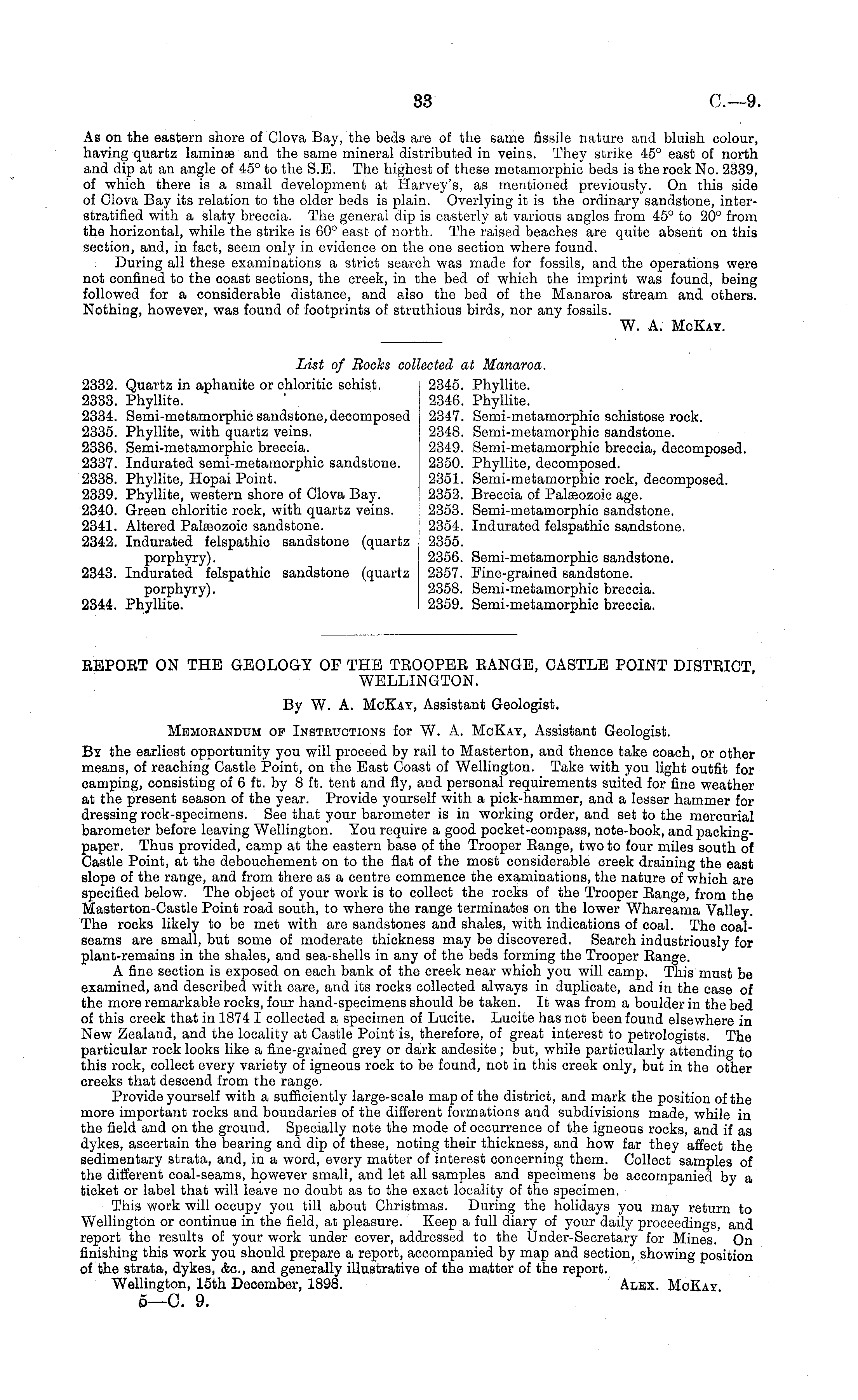 BEPOET ON THE GEOLOGY OF THE TEOOPEE EANGE, CASTLE POINT DISTEICT, WELLINGTON. By W. A. McKay, Assistant Geologist. Mbmoeandum of Instructions for W. A. McKay, Assistant Geologist. By the earliest opportunity you will proceed by rail to Masterton, and thence take coach, or other means, of reaching Castle Point, on the East Coast of Wellington. Take with you light outfit for camping, consisting of 6 ft. by 8 ft. tent and fly, and personal requirements suited for fine weather at the present season of the year. Provide yourself with a pick-hammer, and a lesser hammer for dressing rock-specimens. See that your barometer is in working order, and set to the mercurial barometer before leaving Wellington. You require a good pocket-compass, note-book, and packingpaper. Thus provided, camp at the eastern base of the Trooper Eange, two to four miles south of Castle Point, at the debouchement on to the flat of the most considerable creek draining the east slope of the range, and from there as a centre commence the examinations, the nature of which are specified below. The object of your work is to collect the rocks of the Trooper Eange, from the Masterton-Castle Point road south, to where the range terminates on the lower Whareama Valley. The rocks likely to be met with are sandstones and shales, with indications of coal. The coalseams are small, but some of moderate thickness may be discovered. Search industriously for plant-remains in the shales, and sea-shells in any of the beds forming the Trooper Eange. A fine section is exposed on each bank of the creek near which you will camp. This must be examined, and described with care, and its rocks collected always in duplicate, and in the case of the more remarkable rocks, four hand-specimens should be taken. It was from a boulder in the bed of this creek that in 1874 I collected a specimen of Lucite. Lucite has not been found elsewhere in New Zealand, and the locality at Castle Point is, therefore, of great interest to petrologists. The particular rock looks like a fine-grained grey or dark andesite; but, while particularly attending to this rock, collect every variety of igneous rock to be found, not in this creek only, but in the other creeks that descend from the range. Provide yourself with a sufficiently large-scale map of the district, and mark the position of the more important rocks and boundaries of the different formations and subdivisions made, while in the field and on the ground. Specially note the mode of occurrence of the igneous rocks, and if as dykes, ascertain the bearing and dip of these, noting their thickness, and how far they affect the sedimentary strata, and, in a word, every matter of interest concerning them. Collect samples of the different coal-seams, however small, and let all samples and specimens be accompanied by a ticket or label that will leave no doubt as to the exact locality of the specimen. This work will occupy you till about Christmas. During the holidays you may return to Wellington or continue in the field, at pleasure. Keep a full diary of your daily proceedings, and report the results of your work under cover, addressed to the Under-Secretary for Mines. On finishing this work you should prepare a report, accompanied by map and section, showing position of the strata, dykes, &c, and generally illustrative of the matter of the report. Wellington, 15th December, 1898. Alex. McKay o—C. 9.