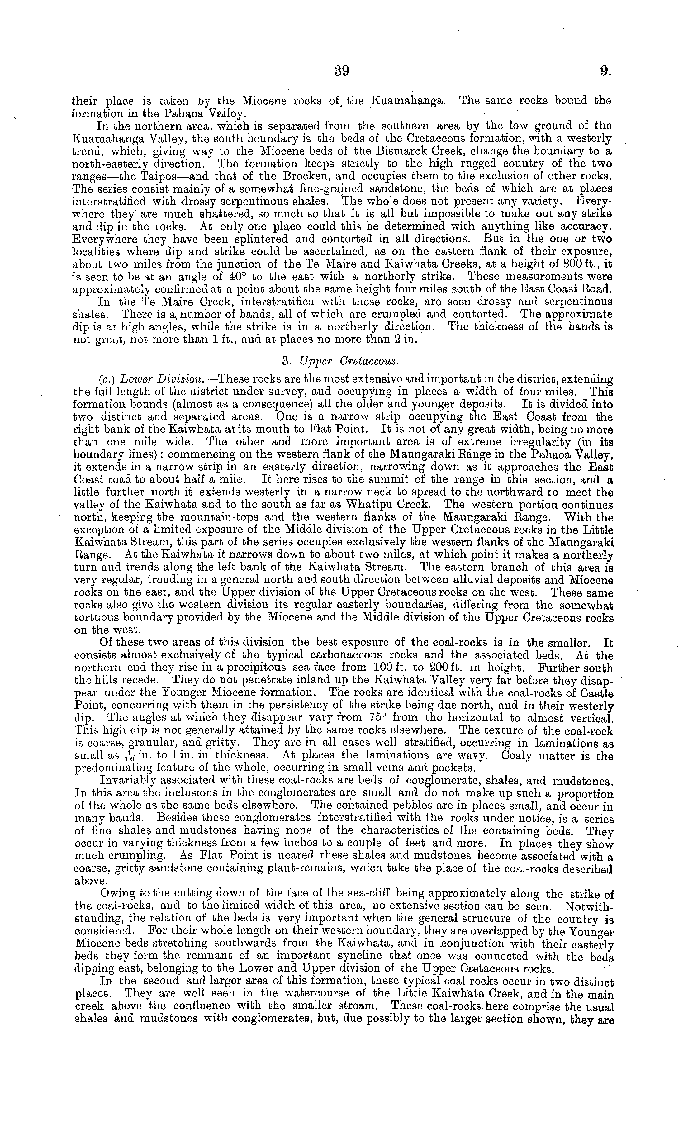 their place is taken by the Miocene rocks the Kuamahanga. The same rooks bound the formation in the Pahaoa Valley. In the northern area, which is separated from the southern area by the low ground of the Kuamahanga Valley, the south boundary is the beds of the Cretaceous formation, with a westerly trend, which, giving way to the Miocene beds of the Bismarck Creek, change the boundary to a north-easterly direction. The formation keeps strictly to the high rugged country of the two ranges—the Taipos—and that of the Brocken, and occupies them to the exclusion of other rocks. The series consist mainly of a somewhat fine-grained sandstone, the beds of which are at places interstratified with drossy serpentinous shales. The whole does not present any variety. Everywhere they are much shattered, so much so that it is all but impossible to make out any strike and dip in the rocks. At only one place could this be determined with anything like accuracy. Everywhere they have been splintered and contorted in all directions. But in the one or two localities where dip and strike could be ascertained, as on the eastern flank of their exposure, about two miles from the junction of the Te Maire and Kaiwhata Creeks, at a height of 800 ft., it is seen to be at an angle of 40° to the east with a northerly strike. These measurements were approximately confirmed at a point about the same height four miles south of the East Coast Boad. In the Te Maire Creek, interstratified with these rocks, are seen drossy and serpentinous shales. There is a. number of bands, all of which are crumpled and contorted. The approximate dip is at high angles, while the strike is in a northerly direction. The thickness of the bands is not great, not more than 1 ft., and at places no more than 2 in. 3. Upper Cretaceous. (c.) Lower Division. —These rocks are the most extensive and important in the district, extending the full length of the district under survey, and occupying in places a width of four miles. This formation bounds (almost as a consequence) all the older and younger deposits. It is divided into two distinct and separated areas. One is a narrow strip occupying the East Coast from the right bank of the Kaiwhata at its mouth to Plat Point. It is not of any great width, being no more than one mile wide. The other and more important area is of extreme irregularity (in its boundary lines); commencing on the western flank of the Maungaraki Bange in the Pahaoa Valley, it extends in a narrow strip in an easterly direction, narrowing down as it approaches the East Coast road to about half a mile. It here rises to the summit of the range in this section, and a little further north it extends westerly in a narrow neck to spread to the northward to meet the valley of the Kaiwhata and to the south as far as Whatipu Creek. The western portion continues north, keeping the mountain-tops and the western flanks of the Maungaraki Eange. With the exception of a limited exposure of the Middle division of the Upper Cretaceous rocks in the Little Kaiwhata Stream, this part of the series occupies exclusively the western flanks of the Maungaraki Eange. At the Kaiwhata it narrows down to about two miles, at which point it makes a northerly turn and trends along the left bank of the Kaiwhata Stream. The eastern branch of this area is very regular, trending in a general north and south direction between alluvial deposits and Miocene rocks on the east, and the Upper division of the Upper Cretaceous rocks on the west. These same rocks also give the western division its regular easterly boundaries, differing from the somewhat tortuous boundary provided by the Miocene and the Middle division of the Upper Cretaceous rocks on the west. Of these two areas of this division the best exposure of the coal-rocks is in the smaller. It consists almost exclusively of the typical carbonaceous rocks and the associated beds. At the northern end they rise in a precipitous sea-face from 100 ft. to 200 ft. in height. Further south the hills recede. They do not penetrate inland up the Kaiwhata Valley very far before they disappear under the Younger Miocene formation. The rocks are identical with the coal-rocks of Castle Point, concurring with them in the persistency of the strike being due north, and in their westerly dip. The angles at which they disappear vary from 75° from the horizontal to almost vertical. This high dip is not generally attained by the same rocks elsewhere. The texture of the coal-rock is coarse, granular, and gritty. They are in all cases well stratified, occurring in laminations as small as 3^in. to lin. in thickness. At places the laminations are wavy. Coaly matter is the predominating feature of the whole, occurring in small veins and pockets. Invariably associated with these coal-rocks are beds of conglomerate, shales, and mudstones. In this area the inclusions in the conglomerates are small and do not make up such a proportion of the whole as the same beds elsewhere. The contained pebbles are in places small, and occur in many bands. Besides these conglomerates interstratified with the rocks under notice, is a series of fine shales and mudstones having none of the characteristics of the containing beds. They occur in varying thickness from a few inches to a couple of feet and more. In places they show much crumpling. As Flat Point is neared these shales and mudstones become associated with a coarse, gritty sandstone containing plant-remains, which take the place of the coal-rocks described above. Owing to the cutting down of the face of the sea-cliff being approximately along the strike of the coal-rocks, and to the limited width of this area, no extensive section can be seen. Notwithstanding, the relation of the beds is very important when the general structure of the country is considered. For their whole length on their western boundary, they are overlapped by the Younger Miocene beds stretching southwards from the Kaiwhata, and in