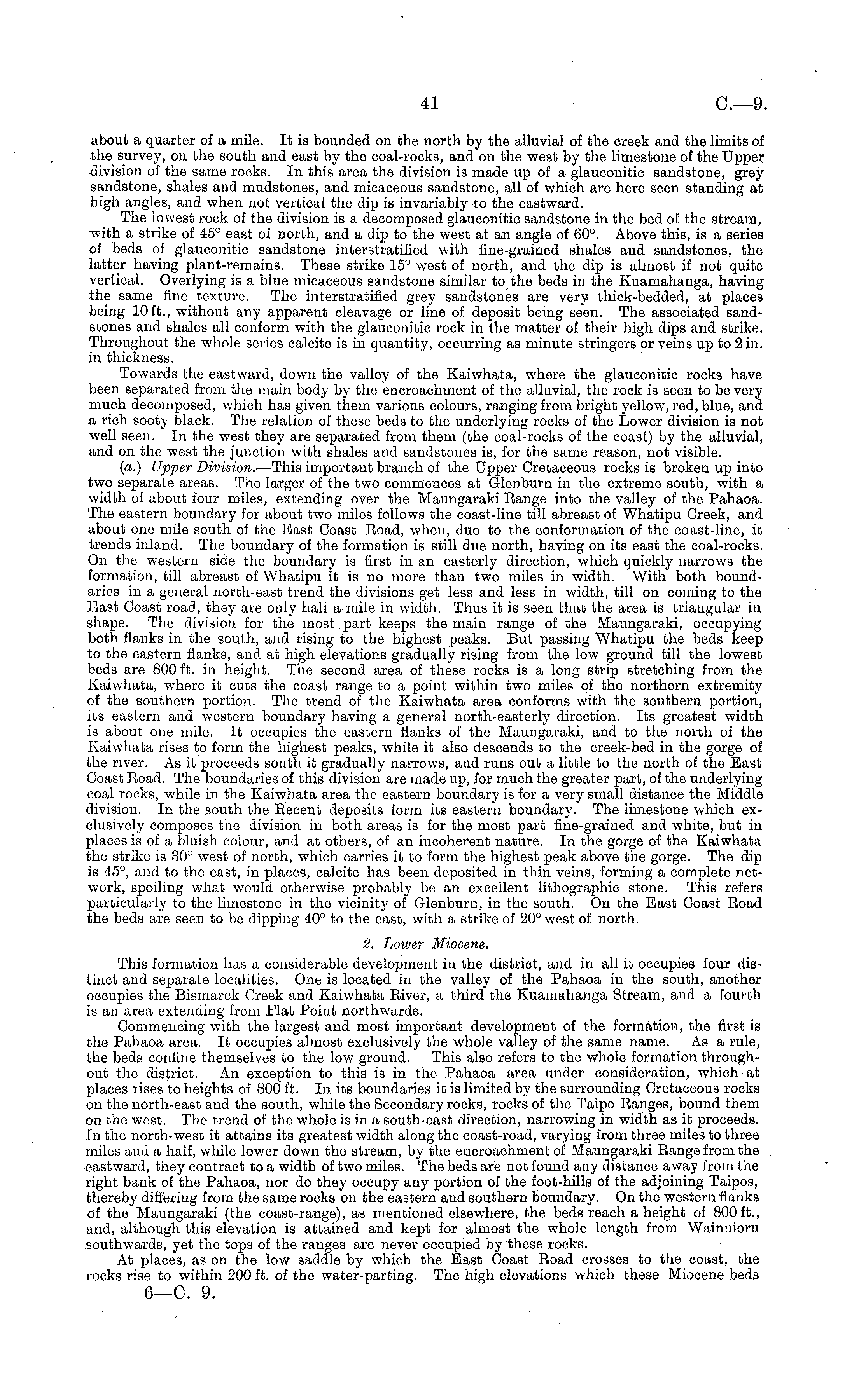 about a quarter of a mile. It is bounded on the north by the alluvial of the creek and the limits of the survey, on the south and east by the coal-rocks, and on the west by the limestone of the Upper division of the same rocks. In this area the division is made up of a glauconitic sandstone, grey sandstone, shales and mudstones, and micaceous sandstone, all of which are here seen standing at high angles, and when not vertical the dip is invariably to the eastward. The lowest rock of the division is a decomposed glauconitic sandstone in the bed of the stream, with a strike of 45° east of north, and a dip to the west at an angle of 60°. Above this, is a series of beds of glaueonitic sandstone interstratified with fine-grained shales and sandstones, the latter having plant-remains. These strike 15° west of north, and the dip is almost if not quite vertical. Overlying is a blue micaceous sandstone similar to the beds in the Kuamahanga, having the same fine texture. The interstratified grey sandstones are very thick-bedded, at places being 10 ft., without any apparent cleavage or line of deposit being seen. The associated sandstones and shales all conform with the glauconitic rock in the matter of their high dips and strike. Throughout the whole series calcite is in quantity, occurring as minute stringers or veins up to 2 in. in thickness. Towards the eastward, down the valley of the Kaiwhata, where the glauconitic rocks have been separated from the main body by the encroachment of the alluvial, the rock is seen to be very much decomposed, which has given them various colours, ranging from bright yellow, red, blue, and a rich sooty black. The relation of these beds to the underlying rocks of the Lower division is not well seen. In the west they are separated from them (the coal-rocks of the coast) by the alluvial, and on the west the junction with shales and sandstones is, for the same reason, not visible. (a.) Upper Division. —This important branch of the Upper Cretaceous rocks is broken up into two separate areas. The larger of the two commences at Glenburn in the extreme south, with a width of about four miles, extending over the Maungaraki Range into the valley of the Pahaoa. The eastern boundary for about two miles follows the coast-line till abreast of Whatipu Creek, and about one mile south of the East Coast Road, when, due to the conformation of the coast-line, it trends inland. The boundary of the formation is still due north, having on its east the coal-rocks. On the western side the boundary is first in an easterly direction, which quickly narrows the formation, till abreast of Whatipu it is no more than two miles in width. With both boundaries in a general north-east trend the divisions get less and less in width, till on coming to the East Coast road, they are only half a mile in width. Thus it is seen that the area is triangular in shape. The division for the most.part keeps the main range of the Maungaraki, occupying both flanks in the south, and rising to the highest peaks. But passing Whatipu the beds keep to the eastern flanks, and. at high elevations gradually rising from the low ground till the lowest beds are 800 ft. in height. The second area of these rocks is a long strip stretching from the Kaiwhata, where it cuts the coast range to a point within two miles of the northern extremity of the southern portion. The trend of the Kaiwhata area conforms with the southern portion, its eastern and western boundary having a general north-easterly direction. Its greatest width is about one mile. It occupies the eastern flanks of the Maungaraki, and to the north of the Kaiwhata rises to form the highest peaks, while it also descends to the creek-bed in the gorge of the river. As it proceeds south it gradually narrows, and runs out a little to the north of the East Coast Road. The boundaries of this division are made up, for much the greater part, of the underlying coal rocks, while in the Kaiwhata area the eastern boundary is for a very small distance the Middle division. In the south the Recent deposits form its eastern boundary. The limestone which exclusively composes the division in both areas is for the most part fine-grained and white, but in places is of a bluish colour, and at others, of an incoherent nature. In the gorge of the Kaiwhata the strike is 30° west of north, which carries it to form the highest peak above the gorge. The dip is 45°, and to the east, in places, calcite has been deposited in thin veins, forming a complete network, spoiling what would otherwise probably be an excellent lithographic stone. This refers particularly to the limestone in the vicinity of Glenburn, in the south. On the East Coast Road the beds are seen to be dipping 40° to the east, with a strike of 20° west of north. 2. Lower Miocene. This formation has a considerable development in the district, and in all it occupies four distinct and separate localities. One is located in the valley of the Pahaoa in the south, another occupies the Bismarck Creek and Kaiwhata River, a third the Kuamahanga Stream, and a fourth is an area extending from JPlat Point northwards. Commencing with the largest and most important development of the formation, the first is the Pahaoa area. It occupies almost exclusively the whole valley of the same name. As a rule, the beds confine themselves to the low ground. This also refers to the whole formation throughout the district. An exception to this is in the Pahaoa area under consideration, which at places rises to heights of 800 ft. In its boundaries it is limited by the surrounding Cretaceous rocks on the north-east and the south, while the Secondary rocks, rocks of the Taipo Ranges, bound them on the west. The trend of the whole is in a south-east direction, narrowing in width as it proceeds. In the north-west it attains its greatest width along the coast-road, varying from three miles to three miles and a half, while lower down the stream, by the encro
