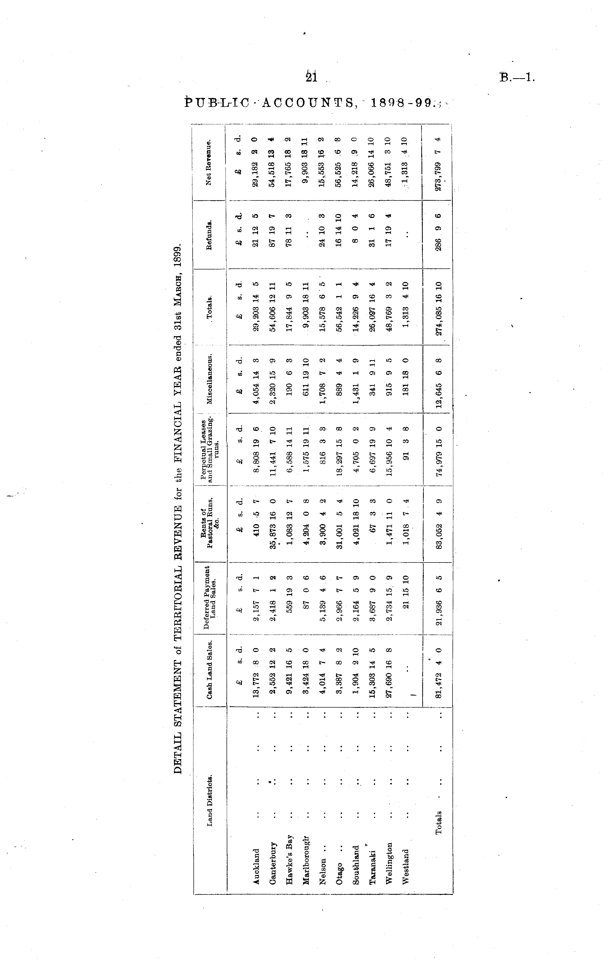 Land Districts. Cash Land Sales. Deferred Payment Land Sales. Rents of Pastoral Runs, Perpetual Leases and Small Grazing- Miscellaneous, runs. . Totals. Refunds. Net ReTenue. £ s. d. £ s. d. £ s. d. £ s. d. £ s. d. £ s. d. £ s. d. £ s. d. Auckland 13,772 8 0 2,157 7 1 410 5 7 8,808 19 6 4,054 14 3 29,203 14 5 21 12 5 29,182 2 0 Canterbury ■ 2,552 12 2 9,421 16 5 3,424 18 0 4,014 7 4 3,387 8 2 1,904 2 10 15,303 14 5 j 2,418 1 2 559 19 3 87 0 6 5,139 4 6 2,966 7 7 2,164 5 9 3,687 9 0 35,873 16 0 i ; 11,441 7 10 2,320 15 9 54,606 12 11 87 19 7 54,518 13 4 Hawke's Bay 1,083 12 7 6,588 14 11 190 6 3 17,844 9 5 78 11 3 17,765 18 2 Marlborough 4,204 0 8 ;■_...... 1,575 19 11 611 19 10 9,903 18 11 9,903 18 11 Nelson .. 3,900 4 2 816 3 3 1,708 7 2 15,578 6 5 24 10 3 15,553 16 2 Otago I 56,542 1 1 16 14 10 56,525 6 3 31,001 5 4 18,297 15 8 889 4 4 Southland 4,021 18 10 4,705 0 2 1,431 1 9 14,226 9 4 8 0 4 14,218 9 0 Taranaki 67 3 3 6,697 19 9 341 9 11 26,097 16 4 31 1 6 26,066 14 10 Wellington 27,690 16 8 ! 2,734 15. 9 1,471 11 0 ' 15,956 10 4 915 9 5 48,769 3 2 17 19 4 48,751 3 10 Westland i 21 15 10 1,018 7 4 91 3 8 181 18 0 1,313 4 10 1,313 4 10 | I I Totals 81,472 4 0 | 21,936 6 5 j 83,052 4 9 ; 74,979 15 0 286 9 6 273,799 7 4 83,052 4 9 12,645 6 8 274,085 16 10