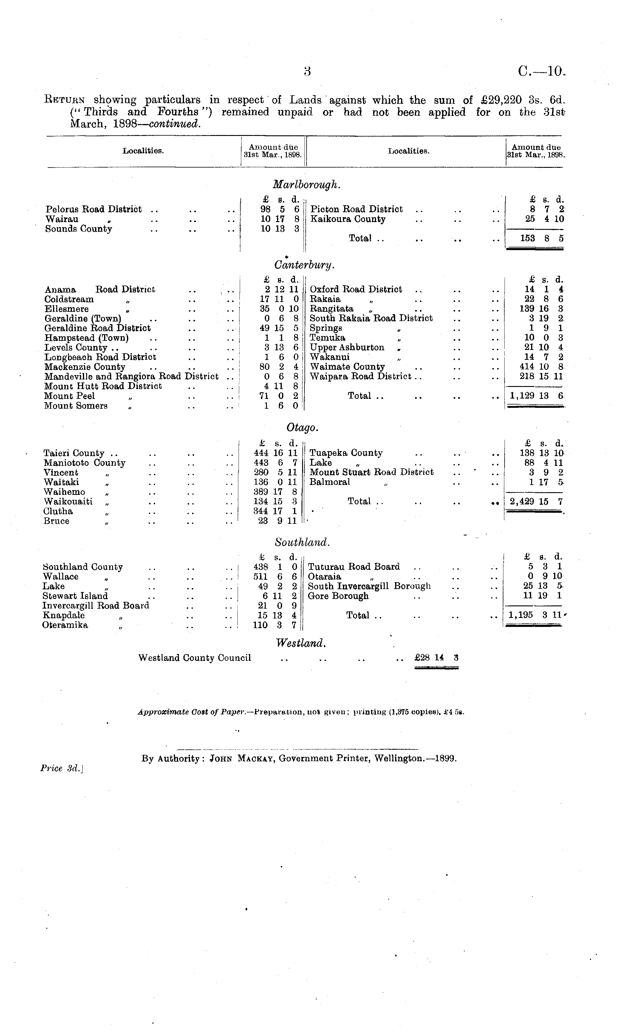 Localities. Amount due 31st Mar., 1898. Localities. Amount due 31st Mar., 1898 Marlh lorough. Pelorus Road District Wairau Sounds County £ s. d. 98 5 6 10 17 8 10 13 3 Picton Road District Kaikoura County Total .. £ s. d. 8 7 2 25 4 10 153 8 5 * Gante; rbury. Anama Road District .. ] .. \ Coldstream „ .. Ellesmere Geraldine (Town) .. .. Geraldine Road District Hampstead (Town) Levels County Longbeach Road District Mackenzie County .. .. Mandeville and Rangiora Road District .. Mount Hutt Road District Mount Peel Mount Somers £ s. d. I 2 12 11 17 11 0 35 0 10 0 6 8 49 15 5 118 3 13 6 16 0 80 2 4 0 6 8 4 11 8 71 0 2 16 0 I ; Oxford Road District Rakaia „ Rangitata South Rakaia Road District Springs Temuka „ Upper Ashburton Wakanui Waimate County Waipara Road District £ s. d. 14 1 4 22 8 6 139 16 3 3 19 2 19 1 10 0 3 21 10 4 14 7 2 414 10 8 218 15 11 Total .. .. 1,129 13 6 Ota igo. Taieri County Maniototo County Vincent „ .. .. Waitaki „ Waihemo Waikouaiti Clutha „ Bruce £ s. d. 444 16 11 443 6 7 280 5 11 136 0 11 389 17 8 134 15 3 344 17 1 23 9 11 Tuapeka County Lake „ Mount Stuart Road District Balmoral £ s. d. 138 13 10 88 4 11 3 9 2 1 17 5 Total .. .. 2,429 15 7 South <,land. Southland County Wallace „ .. .. Lake „ .. .. Stewart Island .. .. Inveroargill Road Board .. .. Knapdale „ .. Oteramika „ .. .. I k s. d. 438 1 0 511 6 6 49 2 2 6 11 2 21 0 9 15 13 4 110 3 7 Tuturau Road Board Otaraia South Invercargill Borough Gore Borough Total .. £ s. d. 5 3 1 0 9 10 25 13 5 11 19 1 .. 1,195 3 11Westl land. Westland County Council I .. £28 14 3