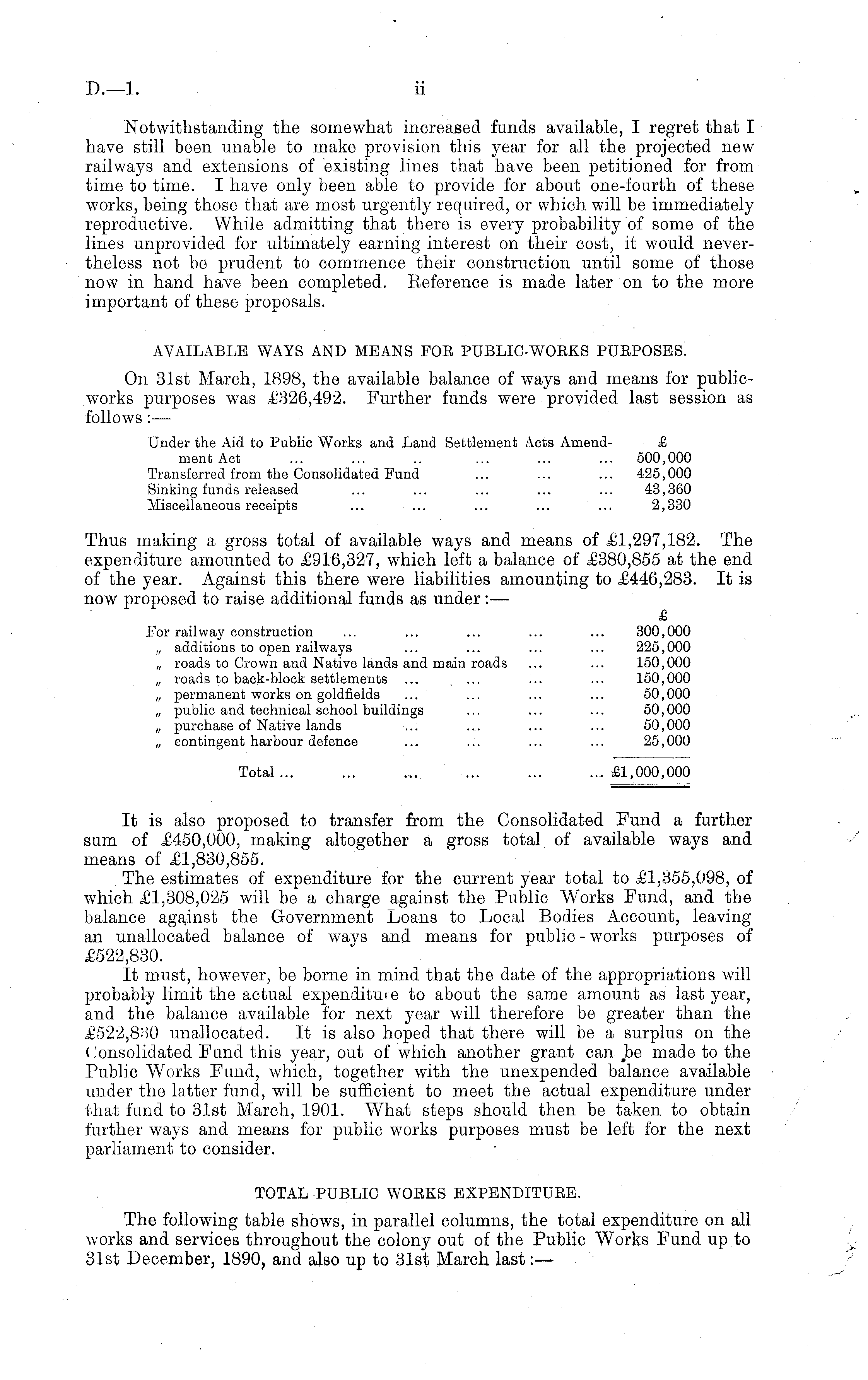 Notwithstanding the somewhat increased funds available, I regret that I have still been unable to make provision this year for all the projected new railways and extensions of existing lines that have been petitioned for from time to time. I have only been able to provide for about one-fourth of these works, being those that are most urgently required, or which will be immediately reproductive. While admitting that there is every probability of some of the lines unprovided for ultimately earning interest on their cost, it would nevertheless not be prudent to commence their construction until some of those now in hand have been completed. Reference is made later on to the more important of these proposals. AVAILABLE WAYS AND MEANS FOE PUBLIC-WOEKS PUEPOSES. On 31st March, 1898, the available balance of ways and means for publicworks purposes was .£326,492. Further funds were provided last session as follows:— Under the Aid to Public Works and Land Settlement Acts Amend- £ ment Act ... ... .. ... ... ... 500,000 Transferred from the Consolidated Fund ... ... ... 425,000 Sinking funds released ... ... ... ... ... 43,360 Miscellaneous receipts ... ... ... ... ... 2,330 Thus making a gross total of available ways and means of £1,297,182. The expenditure amounted to £916,327, which left a balance of £380,855 at the end of the year. Against this there were liabilities amounting to £446,283. It is now proposed to raise additional funds as under : — £ For railway construction ... ... ... ... ... 300,000 „ additions to open railways ... ... ... ... 225,000 „ roads to Crown and Native lands and main roads ... ... 150,000 „ roads to back-block settlements ... ... ... ... 150,000 „ permanent works on goldfields ... ... ... ... 50,000 „ public and technical school buildings ... ... ... 50,000 „ purchase of Native lands ... .... ... ... 50,000 „ contingent harbour defence ... ... ... ... 25,000 Total ... ... ... ... ... ... £1,000,000 It is also proposed to transfer from the Consolidated Fund a further sum of £450,000, making altogether a gross total of available ways and means of £1,830,855. The estimates of expenditure for the current year total to £1,355,098, of which £1,308,025 will be a charge against the Public "Works Fund, and the balance against the Government Loans to Local Bodies Account, leaving an unallocated balance of ways and means for public - works purposes of £522,830. It must, however, be borne in mind that the date of the appropriations will probably limit the actual expendituie to about the same amount as last year, and the balance available for next year will therefore be greater than the £522,830 unallocated. It is also hoped that there will be a surplus on the Consolidated Fund this year, out of which another grant can # be made to the Public Works Fund, which, together with the unexpended balance available under the latter fund, will be sufficient to meet the actual expenditure under that fund to 31st March, 1901. What steps should then be taken to obtain further w 7 ays and means for public works purposes must be left for the next parliament to consider. TOTAL PUBLIC WOEKS EXPENDITUEE. The following table shows, in parallel columns, the total expenditure on all works and services throughout the colony out of the Public Works Fund up to 31st December, 1890, and also up to 31st March last:—