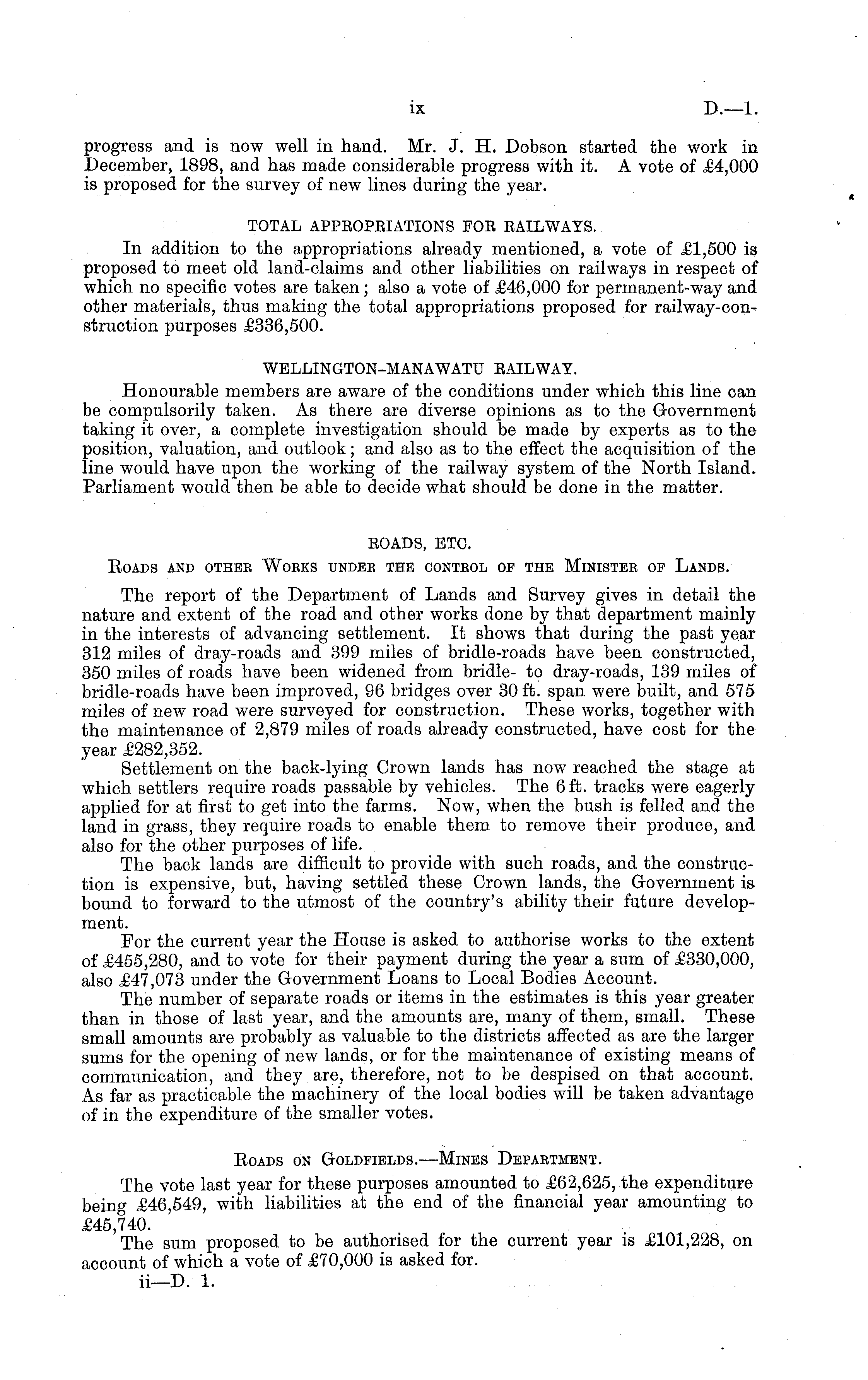 progress and is now well in hand. Mr. J. H. Dobson started the work in December, 1898, and has made considerable progress with it. A vote of £4,000 is proposed for the survey of new lines during the year. TOTAL APPEOPRIATIONS FOE EAILWAYS. In addition to the appropriations already mentioned, a vote of £1,500 is proposed to meet old land-claims and other liabilities on railways in respect of which no specific votes are taken; also a vote of £46,000 for permanent-way and other materials, thus making the total appropriations proposed for railway-con-struction purposes £336,500. WELLINGTON-MANAWATU EAILWAY. Honourable members are aware of the conditions under which this line can be compulsorily taken. As there are diverse opinions as to the Government taking it over, a complete investigation should be made by experts as to the position, valuation, and outlook; and also as to the effect the acquisition of the line would have upon the working of the railway system of the North Island. Parliament would then be able to decide what should be done in the matter. EOADS, ETC. EOADS AND OTHER WoEKS UNDEE THE CONTEOL OF THE MINISTEE OF LANDS. The report of the Department of Lands and Survey gives in detail the nature and extent of the road and other works done by that department mainly in the interests of advancing settlement. It shows that during the past year 312 miles of dray-roads and 399 miles of bridle-roads have been constructed, 350 miles of roads have been widened from bridle- to dray-roads, 139 miles of bridle-roads have been improved, 96 bridges over 30 ft. span were built, and 575 miles of new road were surveyed for construction. These works, together with the maintenance of 2,879 miles of roads already constructed, have cost for the year £282,352. Settlement on the back-lying Crown lands has now reached the stage at which settlers require roads passable by vehicles. The 6 ft. tracks were eagerly applied for at first to get into the farms. Now, when the bush is felled and the land in grass, they require roads to enable them to remove their produce, and also for the other purposes of life. The back lands are difficult to provide with such roads, and the construction is expensive, but, having settled these Crown lands, the Government is bound to forward to the utmost of the country's ability their future development. For the current year the House is asked to authorise works to the extent of £455,280, and to vote for their payment during the year a sum of £330,000, also £47,073 under the Government Loans to Local Bodies Account. The number of separate roads or items in the estimates is this year greater than in those of last year, and the amounts are, many of them, small. These small amounts are probably as valuable to the districts affected as are the larger sums for the opening of new lands, or for the maintenance of existing means of communication, and they are, therefore, not to be despised on that account. As far as practicable the machinery of the local bodies will be taken advantage of in the expenditure of the smaller votes. Eoads on Goldfields.—Mines Department. The vote last year for these purposes amounted to £62,625, the expenditure being £46,549, with liabilities at the end of the financial year amounting to £45,740. The sum proposed to be authorised for the current year is £101,228, on account of which a vote of £70,000 is asked for. ii—D. 1.