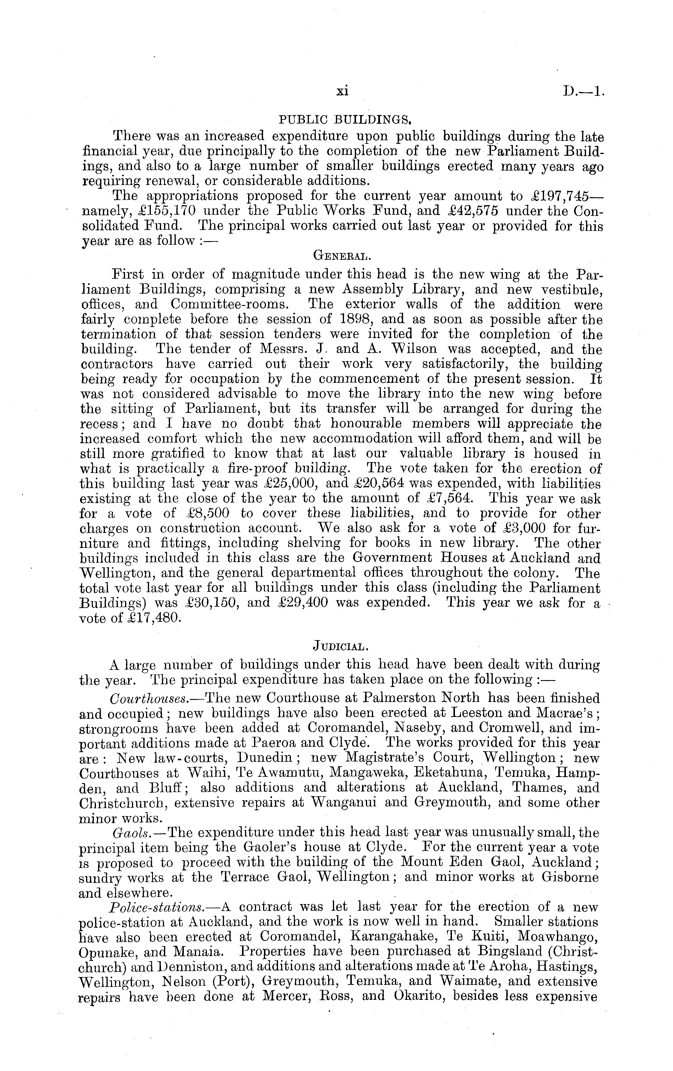 PUBLIC BUILDINGS. There was an increased expenditure upon public buildings during the late financial year, due principally to the completion of the new Parliament Buildings, and also to a large number of smaller buildings erected many years ago requiring renewal, or considerable additions. The appropriations proposed for the current year amount to £197,745 — namely, £155,170 under the Public Works Fund, and £42,575 under the Consolidated Fund. The principal works carried out last year or provided for this year are as follow : — General. First in order of magnitude under this head is the new wing at the Parliament Buildings, comprising a new Assembly Library, and new vestibule, offices, and Committee-rooms. The exterior walls of the addition were fairly complete before the session of 1898, and as soon as possible after the termination of that session tenders were invited for the completion of the building. The tender of Messrs. J. and A. Wilson was accepted, and the contractors have carried out their work very satisfactorily, the building being ready for occupation by the commencement of the present session. It was not considered advisable to move the library into the new wing before the sitting of Parliament, but its transfer will be arranged for during the recess; and I have no doubt that honourable members will appreciate the increased comfort which the new accommodation will afford them, and will be still more gratified to know that at last our valuable library is housed in what is practically a fire-proof building. The vote taken for the erection of this building last year was £25,000, and. £20,564 was expended, with liabilities existing at the close of the year to the amount of £7,564. This year we ask for a vote of £8,500 to cover these liabilities, and to provide for other charges on construction account. We also ask for a vote of £3,000 for furniture and fittings, including shelving for books in new library. The other buildings included, in this class are the Government Houses at Auckland and Wellington, and the general departmental offices throughout the colony. The total vote last year for all buildings under this class (including the Parliament Buildings) was £30,150, and £29,400 was expended. This year we ask for a vote of £17,480. Judicial. A large number of buildings under this head have been dealt with during the year. The principal expenditure has taken place on the following : — Courthouses. —The new Courthouse at Palmerston North has been finished and occupied; new buildings have also been erected at Leeston and Macrae's; strongrooms have been added at Coromandel, Naseby, and Cromwell, and important additions made at Paeroa and Clyde. The works provided for this year are: New law-courts, Dunedin; new Magistrate's Court, Wellington; new Courthouses at Waihi, Te Awamutu, Mangaweka, Eketahuna, Temuka, Hampden, and Bluff; also additions and alterations at Auckland, Thames, and Christchurch, extensive repairs at Wanganui and Greymouth, and some other minor works. Gaols.—The expenditure under this head last year was unusually small, the principal item being the Gaoler's house at Clyde. For the current year a vote is proposed to proceed with the building of the Mount Eden Gaol, Auckland; sundry works at the Terrace Gaol, Wellington; and minor works at Gisborne and elsewhere. Police-stations. —A contract was let last year for the erection of a new police-station at Auckland, and the work is now well in hand. Smaller stations have also been erected at Coromandel, Karangahake, Te Kuiti, Moawhango, Opunake, and Manaia. Properties have been purchased at Bingsland (Christchurch) and Denniston, and additions and alterations made at Te Aroha, Hastings, Wellington, Nelson (Port), Greymouth, Temuka, and Waimate, and extensive repairs have been done at Mercer, Eoss, and Okarito, besides less expensive
