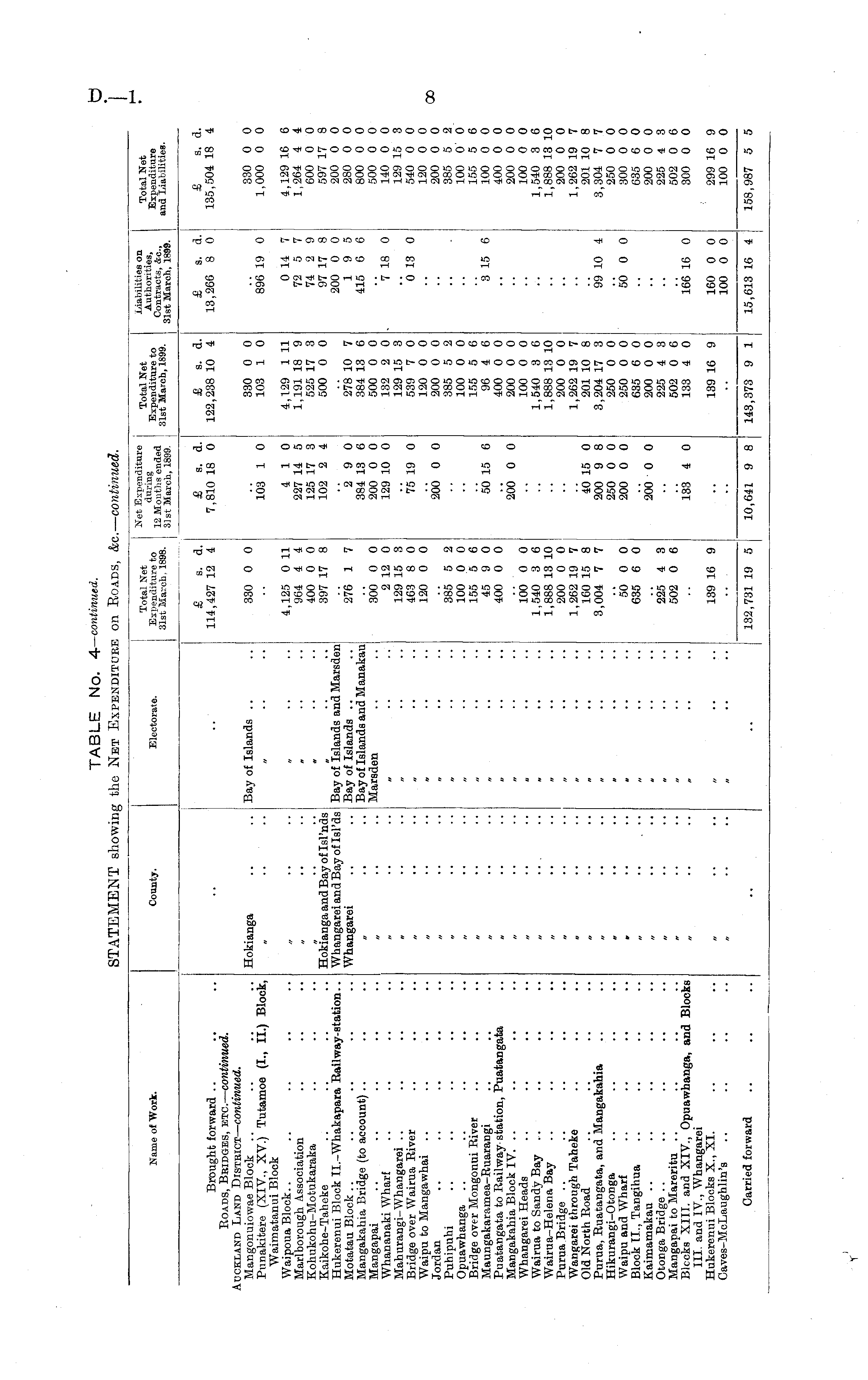 Name of Work. County. Electorate. Total Set Net Expenditure i JSfSfcil 12 Mouths ended I 31st March, 1898. 3] st March, 1899. Total Net Expenditure to 31st March, 1899. Liabilities on Authorities, Contracts, &c., 31st March, 1899. Total Net Expenditure and Liabilities. Brought forward Roads, Bridges, etc. — continued. DCKLAHD Land District — continued. Mangonuiowae Block Punakitere (XIV., XV.) Tutamoe (I., II.) Block, Waimatanui Block Waipoua Block.. Marlborough Association Kohukohu-Motukaraka Kaikohe-Taheke Hukerenui Block Il.-Whakapara Railway-station.. Motatau Block Mangakahia Bridge (to account) Mangapai Whananaki Wharf Mahurangi- Whangarei Bridge over Wairua River Waipu to Mangawhai Jordan Puhipuhi Opuawhanga Bridge over Mongonui Biver Maungakaramea-Buarangi Puatangata to Bailway station, Puatangata Mangakahia Block IV. Whangarei Heads Wairua to Sandy Bay .. Wairua-Helena Bay Purua Bridge Wangarei through Taheke Old North Boad Purua, Buatangata, and Mangakahia Hikurangi-Otonga Waipu and Wharf Block II., Tangihua Kaimamakau Otonga Bridge .. Mangapai to Mareritu Blocks XIII. and XIV., Opuawhanga, and Blocks III. and IV., Whangarei Hukerenui Blocks X., XI. Caves-McLaughlin's £ s. d. 114,427 12 4 £ s. d. 7,810 18 0 £ S. d. 122,238 10 4 £ s. d. 13,266 8 0 £ s. d. 135,504 18 4 Hokianga Bay of Islands 330 0 0 103 1 0 330 0 0 103 1 0 896 19 0 330 0 0 1,000 0 0 4,125 0 11 964 4 4 400 0 0 397 17 8 4 10 227 14 5 125 17 3 102 2 4 4,129 1 11 1,191 18 9 525 17 3 500 0 0 0 14 7 72 5 7 74 2 9 97 17 8 200 0 0 19 5 415 6 6 4,129 16 6 1,264 4 4 600 0 0 597 17 8 200 0 0 280 0 0 800 0 0 500 0 0 140 0 0 129 15 3 540 0 0 120 0 0 200 0 0 385 5 2 100 0 0 155 5 6 100 0 0 400 0 0 200 0 0 100 0 0 1,540 3 6 1,888 13 10 200 0 0 1,262 19 7 201 10 8 3,304 7 7 250 0 0 300 0 0 635 6 0 200 0 0 225 4 3 502 0 6 300 0 0 Hokianga and Bay of Isl'nds Whangarei and Bay of IsFds Whangarei Bay of Islands and Marsden Bay of Islands Bay of Islands and Manakau Marsden i 276 1 7 2 9 0 384 13 6 200 0 0 129 10 0 278 10 7 384 13 6 500 0 0 132 2 0 129 15 3 539 7 0 120 0 0 200 0 0 385 5 2 100 0 0 155 5 6 96 4 6 400 0 0 200 0 0 100 0 0 1,540 3 6 1,888 13 10 200 0 0 1,262 19 7 201 10 8 3,204 17 3 250 0 0 250 0 0 635 6 0 200 0 0 225 4 3 502 0 6 133 4 0 300 0 0 2 12 0 129 15 3 463 8 0 120 0 0 75 19 0 'i 18 0 '6 13 0 385 5 2 100 0 0 155 5 6 45 9 0 400 0 0 200 0 0 • • I 50 15 6 3 15 6 200 0 0 100 0 0 1,540 3 6 1,888 13 10 200 0 0 1,262 19 7 160 15 8 3,004 7 7 40 15 0 200 9 8 250 0 0 200 0 0 99 10 4 50 0 0 635 6 0 50 0 0 it .. . • n • ■ • • 225 4 3 502 0 6 200 0 0 133 4 0 166 16 0 139 16 9 139 16 9 160 0 0 100 0 0 299 16 9 100 0 0 Carried forward 158,987 5 5 132,731 19 5 10,641 9 8 143,373 9 1 15,613 16 4