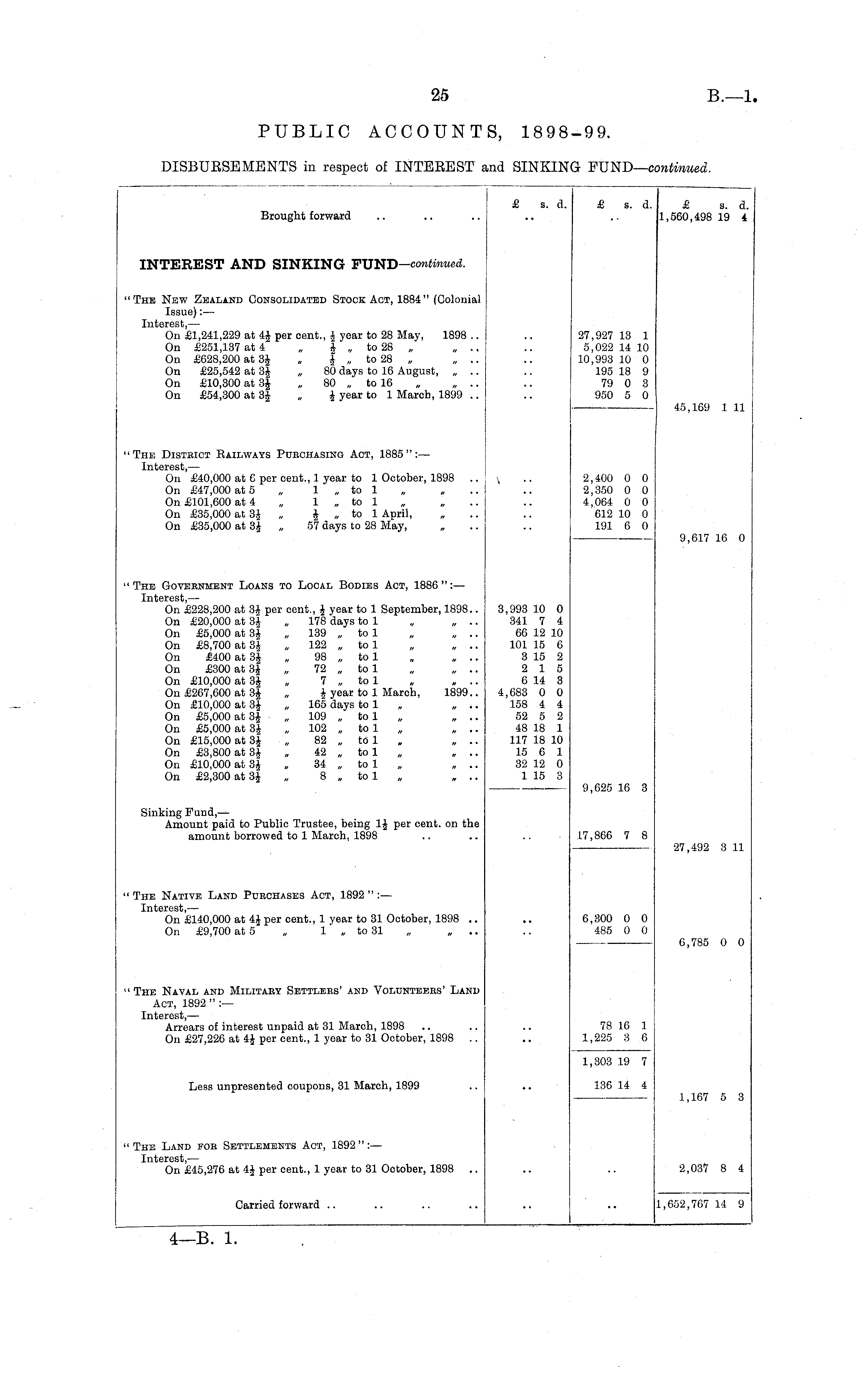 Brought forward £ s. d. £ s. d. I £ s. d. 1,560,498 19 4 INTEREST AND SINKING FUNB-continued. The New Zealand Consolidated Stock Act, 1884" (Colonial Issue): — Interest, — On £1,241,229 at 4J per cent., 4 year to 28 May, 1898 .. On £251,137 at 4 „ J „ to 28 „ On £628,200 at 34 „ 4 , to 28 „ , .. On £25,542 at 3* „ 80 days to 16 August, „ .. On £10,300 at 3J „ 80 „ to 16 „ „ .. On £54,300 at 3J „ 4 year to 1 March, 1899 .. 27,927 13 1 5,022 14 10 10,993 10 0 195 18 9 79 0 3 950 5 0 45,169 1 11 The District Railways Puechasing Act, 1885 " :— Interest, — On £40,000 at 6 per cent., 1 year to 1 October, 1898 .. On £47,000 at 5 1 „ to 1 On £101,600 at 4 1 „ to 1 On £35,000 at 34 „ 4 , to 1 April, On £35,000 at 34 „ 57 days to 28 May, V 2,400 0 0 2,350 0 0 4,064 0 0 612 10 0 191 6 0 9,617 16 0 The Government Loans to Local Bodies Act, 1886 ":— Interest,— On £228,200 at 34 per cent., 4 year to 1 September, 1898.. On £20,000 at 34 „ 178 days to 1 ., „ .. On £5,000 at 34 , 139 „ to 1 „ „ .. On £8,700 at 34 „ 122 „ to 1 „ „ .. On £400 at 3* „ 98 „ to 1 , „ .. On £300 at 34 „ 72 „ to 1 „ , .. On £10,000 at 34 7 „ to 1 „ „ .. On £267,600 at 3J „ 4 year to 1 March, 1899.. On £10,000 at 34 „ 165 days to 1 „ .. On £5,000 at 3| „ 109 „ to 1 „ .. On £5,000 at 34 , 102 „ to 1 „ „ .. On £15,000 at 34 „ 82 „ to 1 „ .. On £3,800 at 34 „ 42 „ to 1 „ .. On £10,000 at 34 , 34 „ to 1 „ „ .. On £2,300 at 34 „ 8 „ to 1 ... 3,993 10 0 341 7 4 66 12 10 101 15 6 3 15 2 2 15 6 14 3 4,683 0 0 158 4 4 52 5 2 48 18 1 117 18 10 15 6 1 32 12 0 1 15 3 9,625 16 3 Sinking Fund, — Amount paid to Public Trustee, being 14 per cent, on the amount borrowed to 1 March, 1898 17,866 7 8 27,492 3 11 The Native Land Pubchases Act, 1892 " :— Interest, — On £140,000 at 4J per cent., 1 year to 31 October, 1898 .. On £9,700 at 5 „ 1 , to 31 „ „ .. 6,300 0 0 485 0 0 6,785 0 0 The Naval and Military Settlers' and Volunteers' Land Act, 1892 " :— Interest, — Arrears of interest unpaid at 31 March, 1898 On £27,226 at 44 per cent., 1 year to 31 October, 1898 .. 78 16 1 1,225 3 6 Less unpresented coupons, 31 March, 1899 1,303 19 7 136 14 4 1,167 5 3 The Land for Settlements Act, 1892 " :— Interest, — On £45,276 at 44 per cent., 1 year to 31 October, 1898 .. 2,037 8 4 Carried forward 11,652,767 14 9