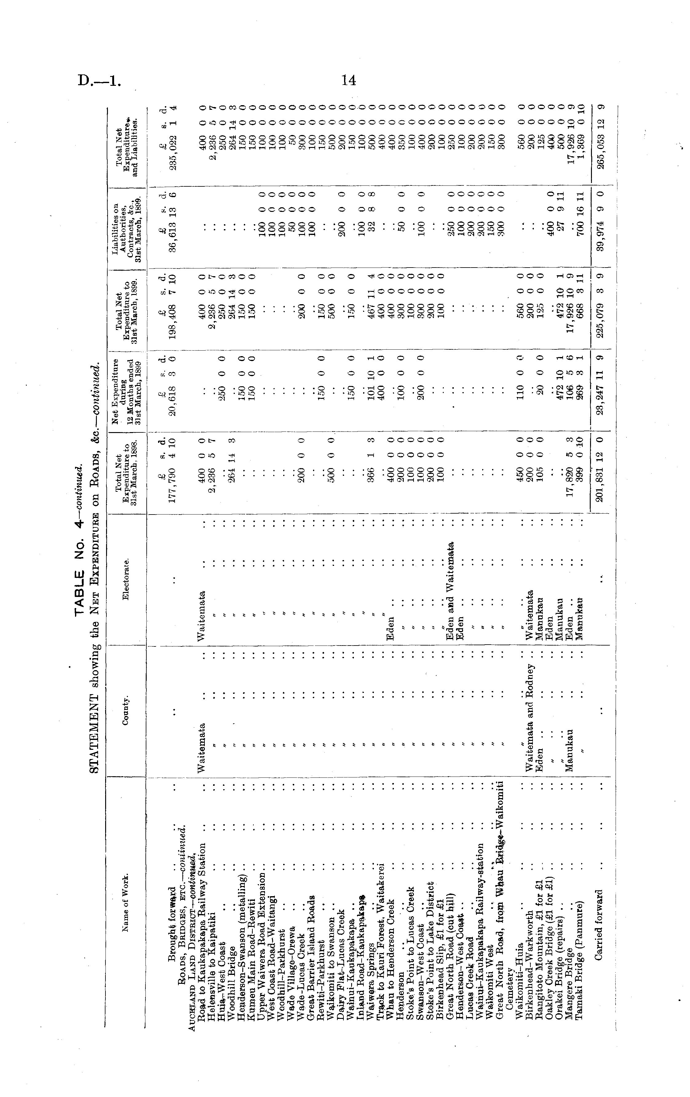 Kame of Work. County. Electorate. Total Net Expenditure to 31st March. 1898. Net F dSrinf tOTe Total Net 12 Monthslnded 3 f£$£%?&£, 31st March, 1899 -ilst March, 189H. Liabilities on Authorities, Contracts, &c, Slst March, 1899. Total Net Expenditure*. and Liabilities. Brought forward .. .. .. [ Roads, Bridges, etc. — continued. UCKLAND Land Distbict — continued. Road to Kaukapakapa Railway Station .. Helensville to Kaipatiki Huia-West Coast Woodhill Bridge Henderson-Swanson (metalling) .. .. Kumeu Main Road-Rewiti .. . - Upper Waiwera Road Extension West Coast Road-Waitangi Woodhill-Parkhurst Wade Village-Orewa Wade-Lucas Creek Great Barrier Island Roads Rewiti-Parkhurst Waikomiti to Swanson Dairy Plat-Lueas Creek Wainui-Kaukapakapa .. .. .. Inland Road-Kaukapakapa Waiwera Springs Track to Kauri Forest, Waitakerei Whau to Henderson Creek Henderson .. Stoke's Point to Lucas Creek Swanson-West Coast Stoke's Point to Lake District Birkenhead Slip, £1 for £1 Great North Road (cut hill) Henderson-West Coast Lucas Creek Road Wainui-Kaukapakapa Railway-station Waikomiti West .. . % Great North Road, from Whau Bridge-Waikomiti Cemetery Waikomiti-Huia Birkenhead-Warkworth Rangitoto Mountain, £1 for £1 .. Oakley Creek Bridge (£1 for £1) .. Orakei Bridge (repairs) Mangere Bridge Tamaki Bridge (Panmure) £ a. d. 177,790 4 10 £ r. d. 20,618 3 0 £ s. d. 198,408 7 10 £ p. d. 36,613 13 6 £ s. a. 235,022 1 4 Waitemata Waitemata 400 0 0 2,236 5 7 264 14 3 250 0 0 150 0 0 150 0 0 400 0 0 2,236 5 7 250 0 0 264 14 3 150 0 0 150 0 0 400 0 0 2,236 5 7 250 0 0 264 14 3 150 0 0 150 0 0 100 0 0 100 0 0 100 0 0 50 0 0 300 0 0 100 0 0 150 0 0 500 0 0 200 0 0 150 0 0 100 0 0 500 0 0 400 0 0 400 0 0 350 0 0 100 0 0 400 0 0 200 0 0 100 0 0 250 0 0 100 0 0 200 0 0 200 0 0 150 0 0 300 0 0 100 0 0 100 0 0 100 0 0 50 0 0 100 0 0 100 0 0 200 0 0 200 0 0 500 0 0 . 150 0 0 150 0 0 150 0 0 500 0 0 150 0 0 200 0 0 366 1 3 400 0 0 200 0 0 100 0 0 100 0 0 200 0 0 100 0 0 101 10 1 400 0 0 100 0 0 200 0 0 467 11 4 400 0 0 400 0 0 300 0 0 100 0 0 300 0 0 200 0 0 100 0 0 100 0 0 32 8 8 Eden" .. 50 0 0 100 0 0 Eden and Waitemata Eden 250 0 0 100 0 0 200 0 0 200 0 0 150 0 0 300 0 0 •• •■ Waitemata and Rodney .. Eden .. Waitemata Eden Manukau Eden Manukau 450 0 0 200 0 0 105 0 0 110 0 0 20 0 0 560 0 0 200 0 0 125 0 0 560 0 0 200 0 0 125 0 0 400 0 0 500 0 0 17,926 10 9 1,369 0 10 17,820 5 3 399 0 10 472 10 1 106 5 6 269 3 1 472 10 1 17,926 10 9 668 3 11 400 0 0 27 9 11 Manukau 700 16 11 Carried forward 201 831 12 0 23,247 11 9 225,079 3 9 39,974 9 0 265, 0i