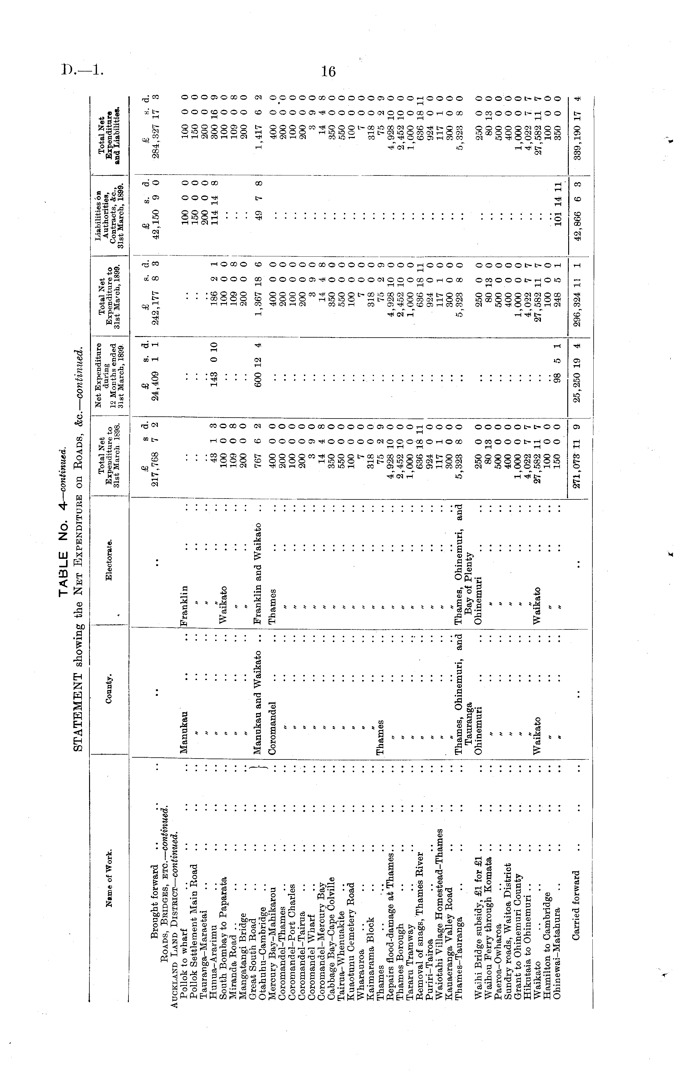 NtimeofWork. County. Electorate. Total Net Expenditure to 31st March 1898. Net Expenditure during 12 Months ended 31st March, 1899. Total Net Expenditure to 31st March, 1899. Liabilities on Authorities, Contracts, &c, 31st March, 1899. Total Net Expenditure and Liabilities. Brought forward Roads, Bbidges, etc. — continued. uckland Land District — continued. Pollok to wharf Pollok Settlement Main Road Tauranga-Maraetai Hunua-Ararimu South. Bombay to Paparata Miranda Road Mangatangi Bridge Great South Road Otahuhu-Gambridge Mercury Bay-Mahikarou Coromandel-Thames Coromandel-Port Charles Coromandel-Tairua Coromandel Wharf Coromandel-Mercury Bay Cabbage Bay-Cape Colville Tairua-Whenuakite Kuaotunu Cemetery Road Wharauroa Kaimarama Block Thames Repairs flood-damage at Thames.. Thames Borough Tararu Tramway Removal of snags, Thames River Puriri-Tairoa Waiotahi Village Homestead-Thames Kauaeranga Valley Road Thames-Tauranga I £ s a. 217,768 7 2 £ s. d. 24,409 1 1 £ s. d. 242,177 8 3 £ s. d. 42,150 9 0 £ S. d. 284,327 17 3 Manukau Franklin 100 0 0 150 0 0 200 0 0 114 14 8 100 0 0 150 0 0 200 0 0 300 16 9 100 0 0 109 0 8 200 0 0 Waikato 43 1 3 100 0 0 109 0 8 200 0 0 143 0 10 186 2 1 100 0 0 109 0 8 200 0 0 Manukau and Waikato .. Franklin and Waikato 767 6 2 600 12 4 1,367 18 6 49 7 8 1,417 6 2 Ooromandel Thames 400 0 0 200 0 0 100 0 0 200 0 0 3 9 0 14 4 8 350 0 0 550 0 0 100 0 0 7 0 0 318 0 0 75 2 9 4,928 10 0 2,452 10 0 1,000 0 0 636 18 11 924 0 0 117 1 0 300 0 0 5,323 8 0 400 0 0 200 0 0 100 0 0 200 0 0 3 9 0 14 4 8 350 0 0 550 0 0 100 0 0 7 0 0 318 0 0 75 2 9 4,928 10 0 2,452 10 0 1,000 0 0 636 18 11 924 0 0 117 1 0 300 0 0 5,323 8 0 400 0 0 200 0 "0 100 0 0 200 0 0 3 9 0 14 4 8 350 0 0 550 0 0 100 0 0 7 0 0 318 0 0 75 2 9 4,928 10 0 2,452 10 0 1,000 0 0 636 18 11 924 0 0 117 1 0 300 0 0 5,323 8 0 Thames Thames, Ohinemuri, and Tauranga Ohinemuri Thames, Ohinemuri, and Bay of Plenty Ohinemuri Waihi Bridge subsidy, £1 for £1 .. Waihou Perry through Komata .. Paeroa-Owharoa Sundry roads, Waitoa District Grant to Ohinemuri County Hikutaia to Ohinemuri Waikato Hamilton to Cambridge Ohinewai-Matahura 250 0 0 80 13 0 500 0 0 400 0 0 1,000 0 0 4,022 7 7 27,582 11 7 100 0 0 150 0 0 250 0 0 80 13 0 500 0 0 400 0 0 1,000 0 0 4,022 7 7 27,582 11 7 100 0 0 248 5 1 250 0 0 80 13 0 500 0 0 400 0 0 1,000 0 0 4,022 7 7 27,582 11 7 100 0 0 350 0 0 Waikato Waikato 98 5 1 101 14 11 Carried forward 339,190 17 4 271,073 11 9 25,250 19 4 296,324 11 1 42,866 6 3