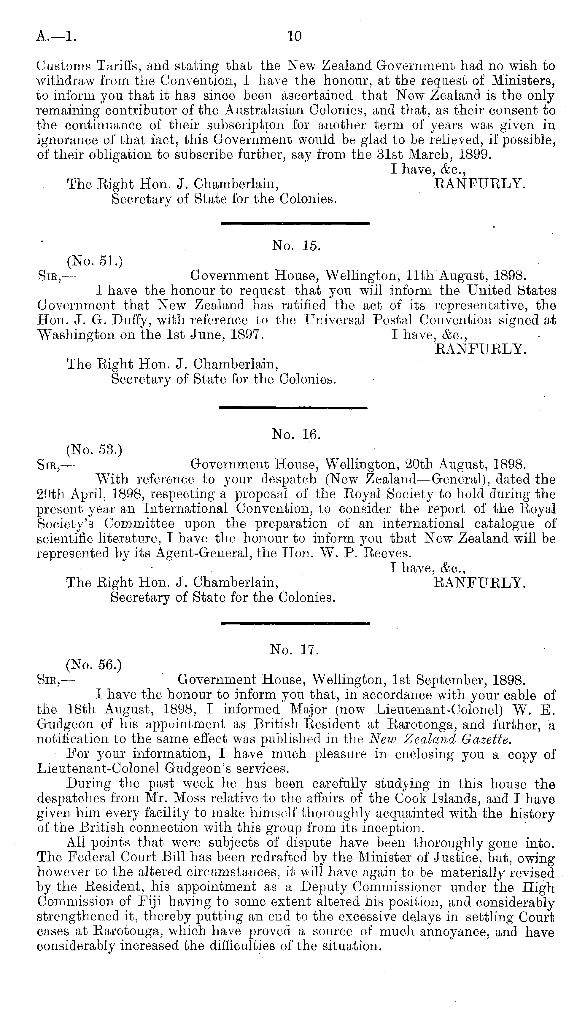 No. 17. (No. 56.) Sic, — Government House, Wellington, Ist September, 1898. I have the honour to inform you that, in accordance with your cable of the 18th August, 1898, I informed Major (now Lieutenant-Colonel) W. E. Gudgeon of his appointment as British Resident at Rarotonga, and further, a notification to the same effect was published in the New Zealand Gazette. For your information, I have much pleasure in enclosing you a copy of Lieutenant-Colonel Gudgeon's services. During the past week he has been carefully studying in this house the despatches from Mr. Moss relative to the affairs of the Cook Islands, and I have given him every facility to make himself thoroughly acquainted with the history of the British connection with this group from its inception. All points that were subjects of dispute have been thoroughly gone into. The Bederal Court Bill has been redrafted by the Minister of Justice, but, owing however to the altered circumstances, it will have again to be materially revised by the Resident, his appointment as a Deputy Commissioner under the High Commission of Fiji having to some extent altered his position, and considerably strengthened it, thereby putting an end to the excessive delays in settling Court cases at Rarotonga, which have proved a source of much annoyance, and have considerably increased the difficulties of the situation.