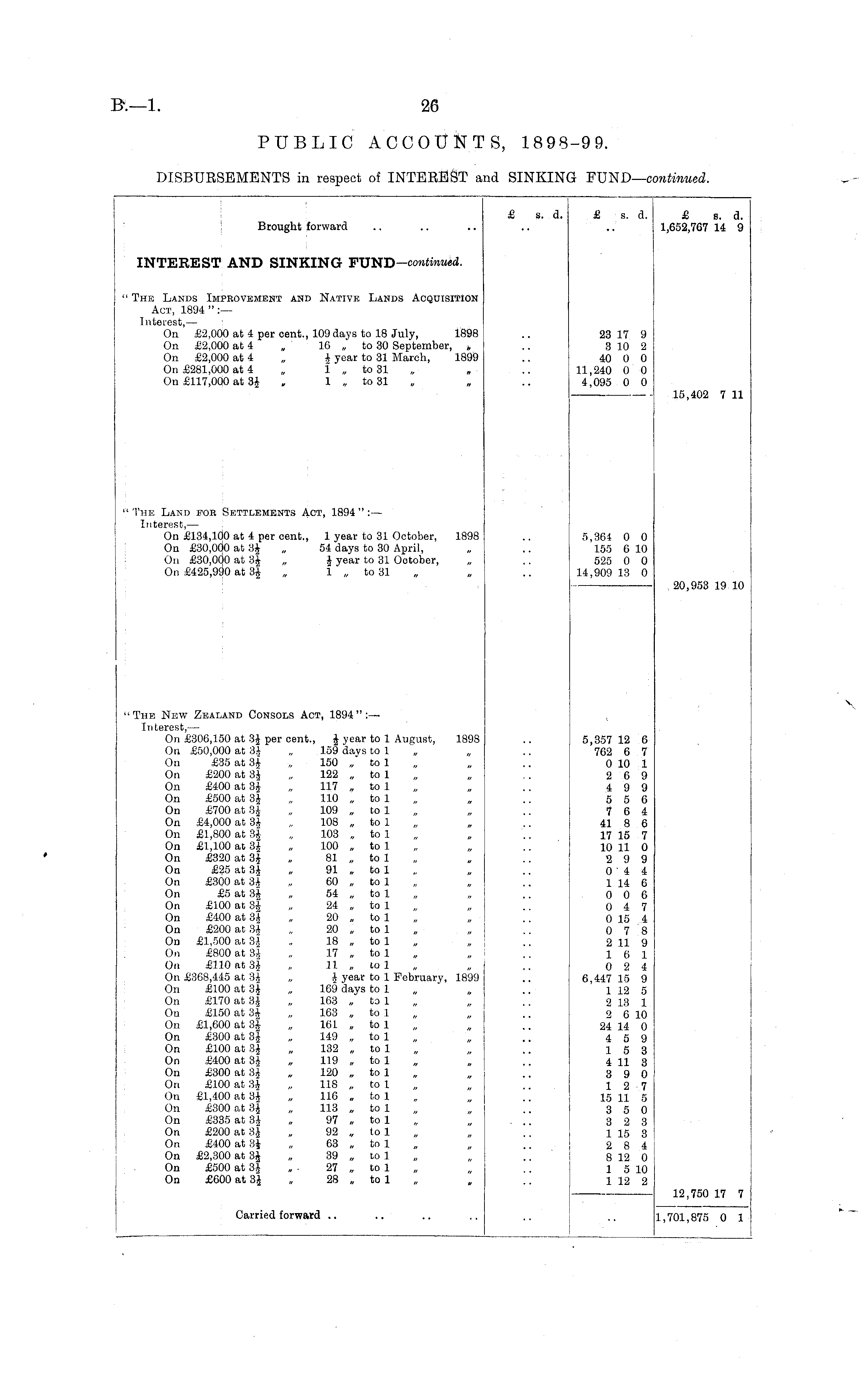 Brought forward £ s. d. £ s. d. £ s. d. 1,652,767 14 9 INTEREST AND SINKING FUNB-continued. " The Lands Improvement and Native Lands Acquisition Act, 1894 " :— Interest, — On £2,000 at 4 per cent., 109 days to 18 July, 1898 On £2,000 at 4 , 16 „ to 30 September, , On £2,000 at 4 „ 4 year to 31 March, 1899 On £281,000 at 4 , 1 „ to 31 On £117,000 at 34 „ 1 „ to 31 23 17 9 3 10 2 40 0 0 11,240 0 0 4,095 0 0 15,402 7 11 " The Land for Settlements Act, 1894 " :— Interest, — On £134,100 at 4 per cent., 1 year to 31 October, 1898 On £30,000 at 34 „ 54 days to 30 April, On £30,000 at 3* „ 4 year to 31 Ootober, On £425,990 at 3$ „ 1 „ to 31 5,364 0 0 155 6 10 525 0 0 14,909 13 0 20,953 19 10 "The New Zealand Consols Act, 1894":— Interest, — On £306,150 at 34 per cent., 4 vear to 1 August, 1898 On £50,000 at 34 „ 159 days to 1 On £35 at 34 „ 150 „ to 1 On £200 at 34 „ 122 „ to 1 On £4.00 at 34 „ 117 „ to 1 On £500 at 34 „ 110 „ to 1 On £700 at 34 „ 109 „ to 1 On £4,000 at 34 „ 108 „ to 1 On £1,800 at 8| „ 103 „ to 1 On £1,100 at 3| „ 100 , to 1 On £320 at 34 „ 81 „ to 1 On £25 at 34 , 91 „ to 1 On £300 at 3A „ 60 „ to 1 On £5 at 84 , 54 „ to 1 On £100 at 3J „ 24 „ to 1 On £400 at 34 . 20 „ to 1 On £200 at s| „ 20 „ to 1 On £1,500 at 34 „ 18 „ to 1 On £800 at 34 „ 17 , to 1 On £110 at 34 „ 11 „ to 1 On £368,445 at 34 „ 4 year to 1 February, 1899 On £100 at 34 „ 169 days to 1 On £170 at 34 „ 163 „ to 1 On £150 at 34 „ 163 „ to 1 On £1,600 at 8* , 161 „ to 1 On £300 at 34 „ 149 „ to 1 On £100 at 34 „ 132 „ to 1 On £400 at 34 „ 119 „ to 1 On £300 at 34 „ 120 „ to 1 On £100 at 3J „ 118 „ to 1 On £1,400 at 34 „ 116 „ to 1 On £300 at 3j „ 113 „ to 1 On £335 at 34 „ 97 „ to 1 On £200 at 3J , 92 „ to 1 On £400 at 84 „ 63 „ to 1 On £2,300 at 34 „ 39 „ to 1 On £500 at 3| , . 27 „ to 1 On £600 at 34 28 „ to 1 5,357 12 6 762 6 7 0 10 1 2 6 9 4 9 9 5 5 6 7 6 4 41 8 6 17 15 7 10 11 0 2 9 9 0 4 4 1 14 6 0 0 6 0 4 7 0 15 4 0 7 8 2 11 9 16 1 0 2 4 6,447 15 9 1 12 5 2 13 1 2 6 10 24 14 0 4 5 9 15 3 4 11 3 3 9 0 12 7 15 11 5 3 5 0 3 2 3 1 15 3 2 8 4 8 12 0 1 5 10 1 12 2 « 12,750 17 7 Carried forward 1,701,875 0 1