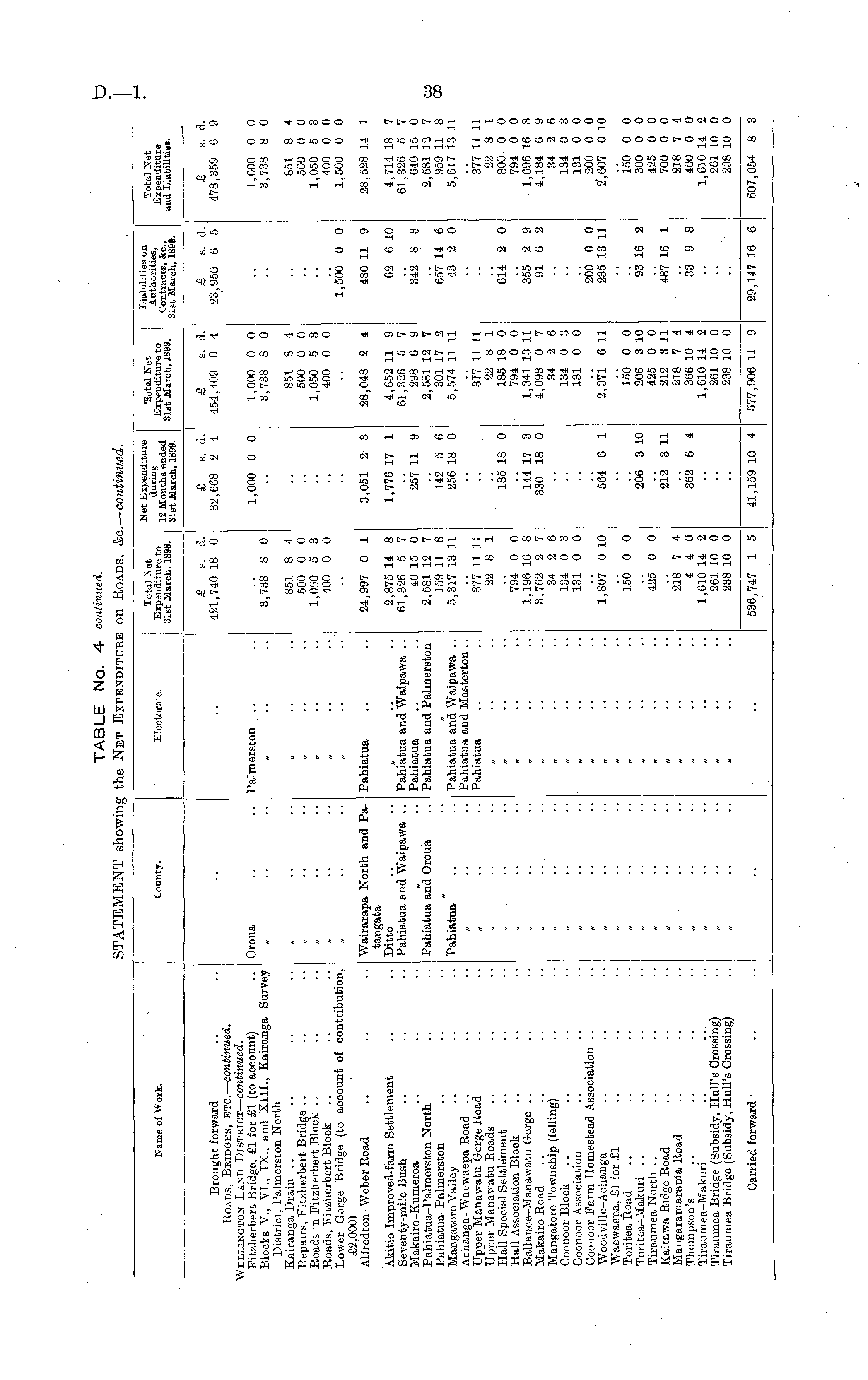 Name of Work. County. Electorate. Total Net Expenditure to 31st March, 1898. Net Expenditure during 12 Months ended 31st March, 1899. ■BotalNet Liabilities on Total Set Expenditure to Antnomies, Expenditure 81st March, 1899. sSXrcn", llw. and Liabiliti... Brought forward Roads, Beidges, etc. — continued. 'Ellington Land Distkict — continued. Pitzherbert Bridge, £1 for £1 (to account) Blocks V., VI., IX., and XIII., Kairanga Survey District, Palmerston North Kairanga Drain .. Eepairs, Pitzherbert Bridge Roads in Pitzhtrbeit Block Roads, Pitzherbert Block Lower Gorge Bridge (to account of contribution, £2,000) Alfredton-Weber Road £ s. a. 421,740 18 0 £ s. d. 32,668 2 4 £ s. d. 454,409 0 4 £ s. d. 23,950 6 5 £ s. fl. 478,359 6 9 Oroua Palmerston 3,738 8 0 1,000 0 0 1,000 0 0 3,738 8 0 1,000 0 0 3,738 8 0 851 8 4 500 0 0 1,050 5 3 400 0 0 851 8 4 500 0 0 1,050 5 3 400 0 0 851 8 4 500 0 0 1,050 5 3 400 0 0 1,500 0 0 1,500 0 0 Akitio Improved-farm Settlement Seventy-mile Bush Makairo-Kumeroa Pahiatua-Palmerston North Pah iatua-Palmerston Mangatoro Valley Aohanga-Waewaepa Road Upper Manawatu Gorge Road Upper Manawatu Roads Hall Special Settlement Hall Association Block Ballance-Matiawatu Gorge Makairo Road Mangatoro Township (felling) Coonoor Block Coonoor Association Coonoor Farm Homestead Association .. Woodville-Aohanga Waewaepa, £1 for £1 Toritea Road Toritea-Makuri Tiraumea North Kaitawa Ridge Road Mangaramarania Road Thompson's Tiraumea-Makuri Tiraumea Bridge (Subsidy, Hull's Crossing) Tiraumea Bridge (Subsidy, Hull's Crossing) Wairarapa North and Patangata Ditto Pabiatua and Waipawa .. Pahiatua Pahiatua and Waipawa .. Pahiatua Pahiatua and Palmerston 24,997 0 1 2,875 14 8 61,326 5 7 40 15 0 2,581 12 7 159 11 8 5,317 13 11 3,051 2 3 1,776 17 1 28,048 2 4 4,652 11 9 61,326 5 7 298 6 9 2,581 12 7 301 17 2 5,574 11 11 480 11 9 62 6 10 28,528 14 1 4,714 18 7 61,326 5 7 640 15 0 2,581 12 7 959 11 8 5,617 13 11 257 11 9 342 8 3 Pahiatua and Oroua 142 5 6 256 18 0 Pahiatua and Waipawa .. Pahiatua and Masterton .. Pahiatua 657 14 6 43 2 0 Pahiatua 377 11 11 22 8 1 3T7 11 11 22 8 1 185 18 0 794 0 0 1,341 13 11 4,093 0 7 34 2 6 134 0 3 131 0 0 377 11 11 22 8 1 800 0 0 794 0 0 1,696 16 8 4,184 6 9 34 2 6 134 0 3 131 0 0 200 0 0 2', 607 0 10 794 0 0 1,196 16 8 3,762 2 7 34 2 6 134 0 3 131 0 0 185 18 0 614 2 0 144 17 3 330 18 0 355 2 9 91 6 2 „ 200 0 0 235 13 11 „ 1,807 0 10 564 6 1 2,371 6 11 ' 150 0 0 206 3 10 150 0 0 206 3 10 425 0 0 212 3 11 218 7 4 366 10 4 1,610 14 2 261 10 0 238 10 0 93 16 2 150 0 0 300 0 0 425 0 0 700 0 0 218 7 4 400 0 0 1,610 14 2 261 10 0 238 10 0 " 425 0 0 212 3 11 487 16 1 „ 218 7 4 4 4 0 1,610 14 2 261 10 0 238 10 0 362 6 4 33 9 8 „ Carried forward 536,747 1 5 41,159 10 4 577,906 11 9 29,147 16 6 607,054 8