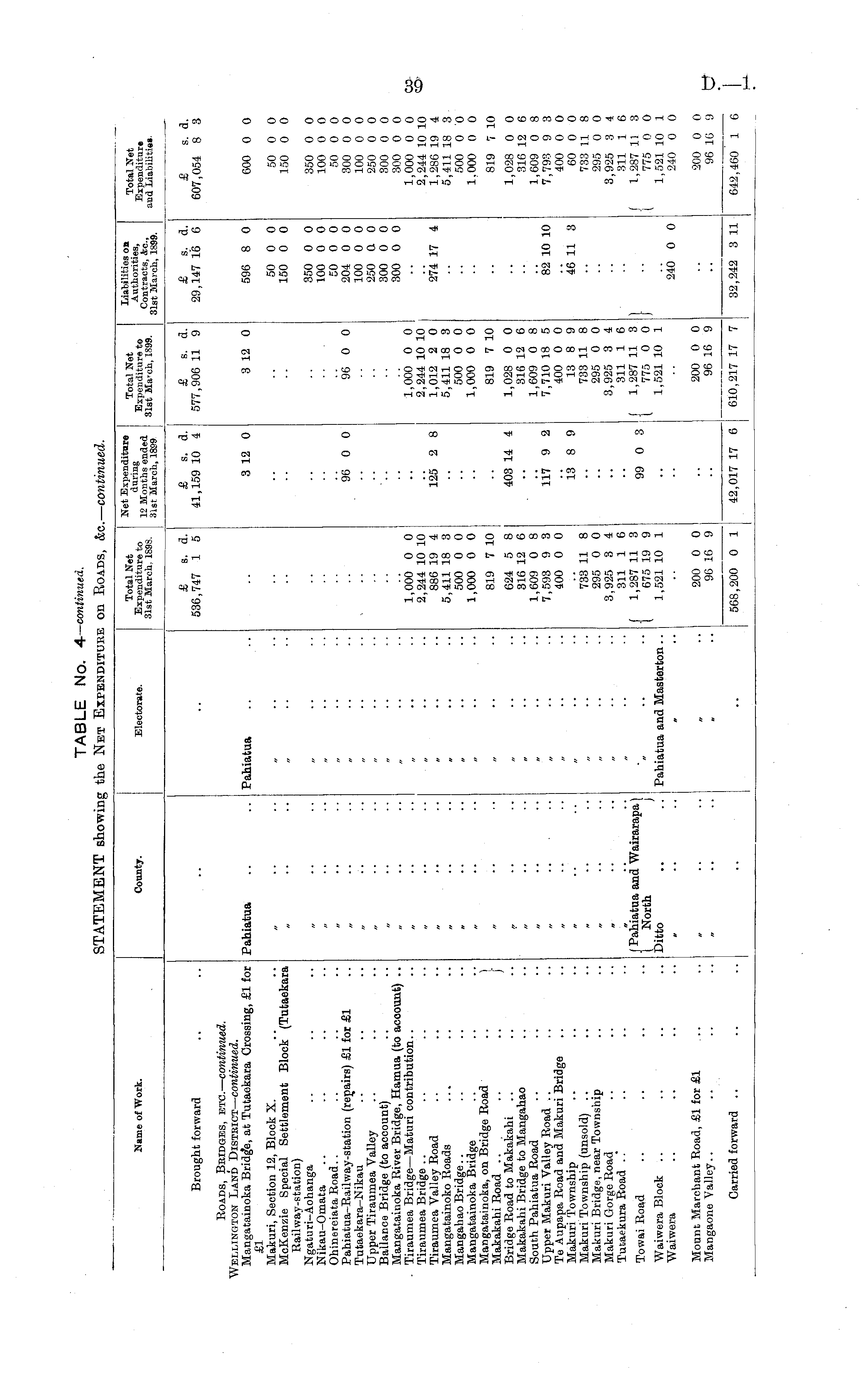 Name of Work. County. Electorate. Total Net Expenditure to 31st March, 1898. Net Expenditure Total Net 12 Months ended o Ex t p |? dit^ r 31st March, 1899 31st Ma ' oh - 1899 ' Liabilities on Authorities, Contracts, &c, 31st March, 1899. Total Net Expenditure and Liabilities. Brought forward £ s. d. 536,747 1 5 £ s. d. 41,159 10 4 £ s. d. 577,906 11 9 £ s. d. 29,147 16 6 £ s. d. 607,054 8 3 Roads, Bridges, etc. — continued. Wellington Land District — continued. Mangatainoka Bridge, at Tutaekara Crossing, £1 for £1 Makuri, Section 12, Block X. MoKenzie Special Settlement Block (Tutaekara Railway-station) Ngaturi-Aohanga Nikau-Omata Ohinereiata Road.. Pahiatua-Railway-station (repairs) £1 for £1 Tutaekara-Nikau Upper Tiraumea Valley Ballacce Bridge (to account) Mangatainoka River Bridge, Hamua (to account) .. Tiraumea Bridge —Maturi contribution.. Tiraumea Bridge Tiraumea Valley Road Mangatainoko Roads ... Mangahao Bridge.. Mangatainoka Bridge Mangatainoka, on Bridge Road .. } Makakahi Road ... .. .. j Bridge Road to Makakahi Makakahi Bridge to Mangahao South Pahiatua Road Upper Makuri Valley Road Te Aupapa Road and Makuri Bridge Makuri Township Makuri Township (unsold) Makuri Bridge, near Township Makuri Gorge Road Tutaekura Road Fabiatua Pahiatua 1,000 0 0 2,244 10 10 886 19 4 5,411 18 3 500 0 0 1,000 0 0 3 12 0 96 0 0 125 2 8 3 12 0 96 0 0 1,000 0 0 2,244 10 10 1,012 2 0 5,411 18 3 500 0 0 1,000 0 0 596 8 0 50 0 0 150 0 0 350 0 0 100 0 0 50 0 0 204 0 0 100 0 0 250 tt 0 300 0 0 300 0 0 274 17 4 600 0 0 50 0 0 150 0 0 350 0 0 100 0 0 50 0 0 300 0 0 100 0 0 250 0 0 300 0 0 300 0 0 1,000 0 0 2,244 10 10 1,286 19 4 5,411 18 3 500 0 0 1.000 0 0 819 7 10 819 7 10 819 7 10 624 5 8 316 12 6 1,609 0 8 7,593 9 3 400 0 0 403 14 4 1 1,028 0 0 316 12 6 1,609 0 8 7,710 18 5 400 0 0 13 8 9 733 11 8 295 0 0 3,925 3 4 311 1 6 1,287 11 3 775 0 0 1,521 10 1 J 1,028 0 0 316 12 6 1,609 0 8 7,793 9 3 400 0 0 60 0 0 733 11 8 295 0 0 3,925 3 4 311 1 6 1,287 11 3 775 0 0 1,521 10 1 240 0 0 117 9 2 82 10 10 13 8 9 46 11 3 733 11 8 295 0 0 3,925 3 4 311 1 6 j 1,287 11 3 \ 675 19 9 1,521 10 1 Towai Road (Pahiatua and Wairarapa) t North j Ditto 99 0 3 1 Waiwera Block Waiwera Pahiatua and Masterton.. 240 0 0 a • • Mount Marchant Road, £1 for £1 Mangaone Valley.. tr • * 200 0 0 96 16 9 200 0 0 96 16 9 200 0 0 96 1C 9 Carried forward 568,200 0 1 610,217 17 7 642,460 1 42,017 17 6 32,242 3 11