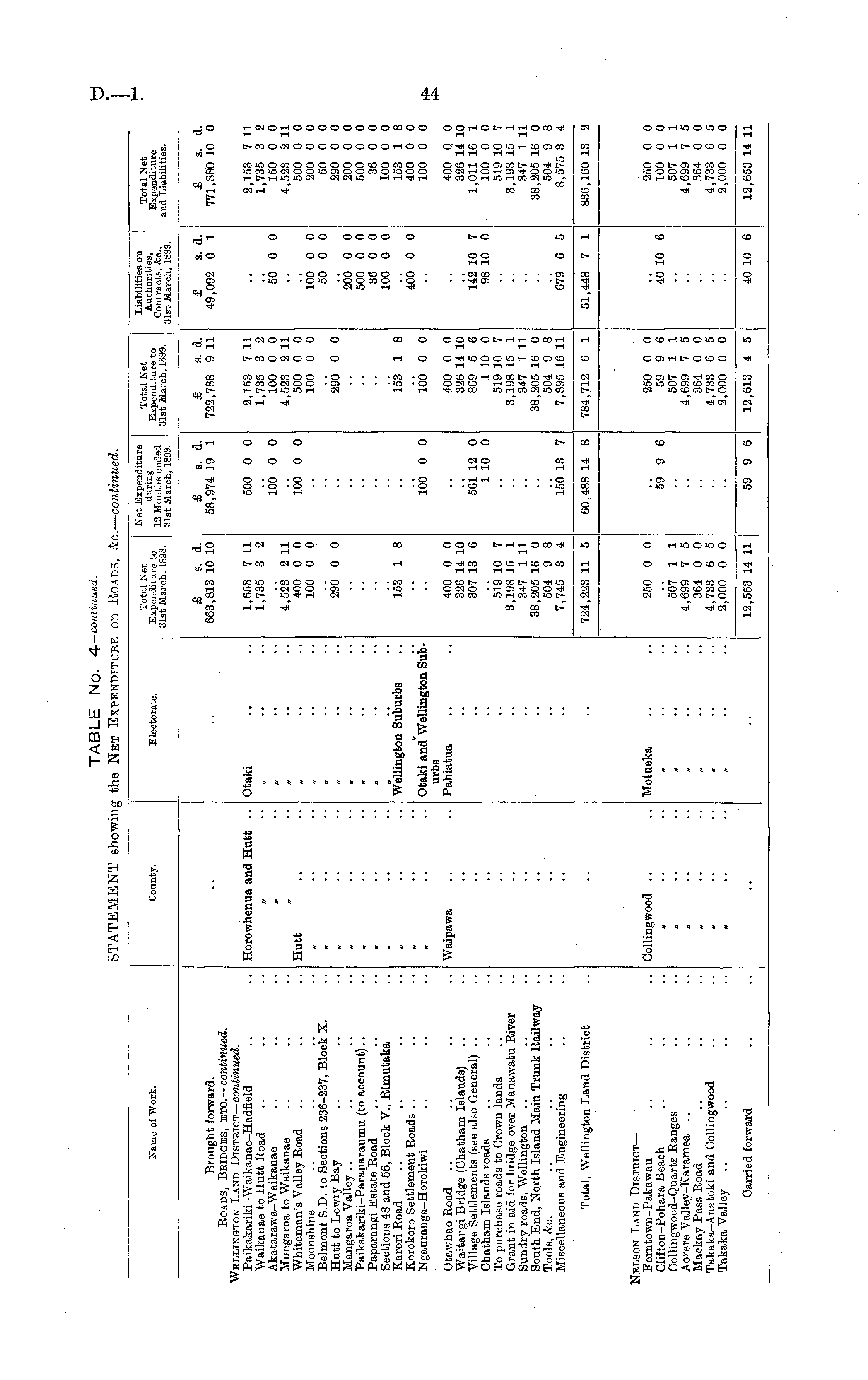 Name of Wort. County. Electorate. Total Net Net Expenditure Expenditure to n Months ended 31st March. 1898. 31st March, 1899 Net Liabilities on Exper.Se to Authorities, Total Net Expenditure and Liabilities. Brought forward. Eoads, Bridges, etc. — continued. Wellington Land District — continued. Paikakariki-Waikanae-Hadfield Waikanae to Hutt Road Akatarawa-Waikanae Mungaroa to Waikanae Whiteman's Valley Road Moonshine Belmont S.D. to Sections 236-237, Block X. Hutfc to Lowry Bay Mangaroa Valley .. Paikakariki-Paraparaumu (to account).. Paparangi Estate Road Sections 48 and 56, Block V., Rimutaka Karori Road Korokoro Settlement Roads .. Ngauranga-Horokiwi £ s. d. 663,813 10 10 £ s. d. 58,974 19 1 £ s. d. 722,788 9 11 £ s. d. 49,092 0 1 £ s. d. 771,880 10 0 Horowhenua and Hutt .. Otaki 1,653 7 11 1,735 3 2 500 0 0 2,153 7 11 1,735 3 2 100 0 0 4,523 2 11 500 0 0 100 0 0 2,153 7 11 1,735 3 2 150 0 0 4,523 2 11 500 0 0 200 0 0 50 0 0 290 0 0 200 0 0 500 0 0 36 0 0 100 0 0 153 1 8 400 0 0 100 0 0 100 0 0 50 0 0 Hutt 4,523 2 11 400 0 0 100 0 0 100 0 0 100 0 0 50 0 0 290 0 0 290 0 0 „ . • . . 200 0 0 500 0 0 36 0 0 100 0 0 Wellington Suburbs 153 1 8 153 1 8 400 0 0 Otaki and Wellington Suburbs Pabiatua 100 0 0 100 0 0 Otawhao Road Waitangi Bridge (Chatham Islands) Village Settlements (see also General) .. Chatham Islands roads To purchase roads to Crown lands Grant in aid for bridge over Manawatu River Sundry roads, Wellington South End, North Island Main Trunk Railway Tools, &c. Miscellaneous and Engineering Waipawa 400 0 0 326 14 10 307 13 6 400 0 0 326 14 10 869 5 6 1 10 0 519 10 7 3,198 15 1 347 1 11 38,205 16 0 504 9 8 7,895 16 11 400 Q 0 326 14 10 1,011 16 1 100 0 0 519 10 7 3,198 15 1 347 1 11 38,205 16 0 504 9 8 8,575 3 4 561 12 0 1 10 0 142 10 7 98 10 0 519 10 7 3,198 15 1 347 1 11 38,205 16 0 504 9 8 7,745 3 4 150 13 7 679 6 5 Total, Wellington Land District 724,223 11 5 60,488 14 8 784,712 6 1 51,448 7 1 836,160 13 2 Nelson Land District — Ferntown-Pakawau Clifton-Pohara Beach Collingwood-Quartz Ranges Aorere Valley-Karamea .. Mackay Pass Road Takaka-Anatoki and Collingwood Takaka Valley Collingwood Motueka 250 0 0 507 1 1 4,699 7 5 364 0 0 4,733 6 5 2,000 0 0 59 9 6 250 0 0 59 9 6 507 1 1 4,699 7 5 364 0 0 4,733 6 5 2,000 0 0 40 10 6 250 0 0 100 0 0 507 1 1 4,699 7 5 364 0 0 4,733 6 5 2,000 0 0 •• Carried forward 12,553 14 11 59 9 6 12,613 4 5 40 10 6 12,653 14 l: