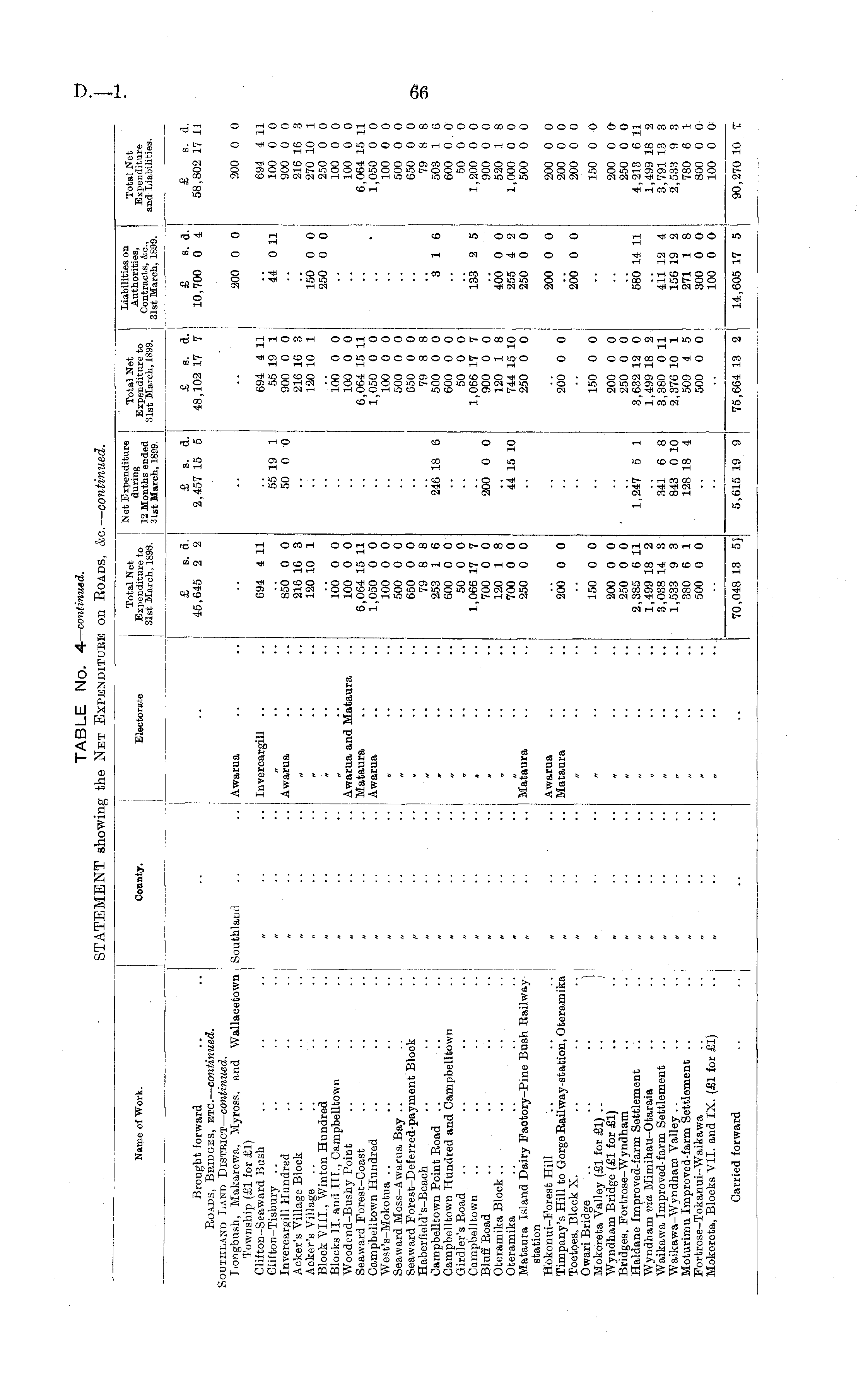 Name of Work. County. Electorate Total Net Expenditure to 31st March, 1898. Net Expenditure I Total Net 12 Monthslnded 31st March, 1899. 31st March ' 1899 - Liabilities on Authorities, Contracts, &c, 31st March, 1899. Total Net Expenditure and Liabilities. £ s. d. 45,645 2 2 £ s. d. 2,457 15 5 £ s. d. 48,102 17 7 £ S. d. 10,700 0 4 £ s. d. 58,802 17 11 Brought forward Roads, Bridges, etc. — continued. Southland Lahd District — continued. Longbush, Makarewa, Myross, and Wallaoetown Township (£1 for £1) Clifton-Seaward Bush Clifton-Tisbury Invereargill Hundred Acker's Village Block Acker's Village Block VIII., Winton Hundred Blocks II. and III., Campbelltown Woodend-Bushy Point Seaward Forest-Coast Campbelltown Hundred West's-Mokotua Seaward Moss-Awarua Bay Seaward Forest-Deferred-payment Block Haberfield's-Beach .. .. Campbelltown Point Road Campbelltown Hundred and Campbelltown Girdler's Road .. .. .. Campbelltown Blufi Road .. Oteramika Block ... .. .. .. ] Oterarnika Mataura Island Dairy Factory-Pine Bush Railway- j station Hokonui-Forest Hill Timpany's Hill to Gorge Railway-station, Oteramika Toetoes, Block X. .. .. .. | Owari Bridge .. .. .. ) Mokoreta Valley (£1 for £1) .. .. j Wyndham Bridge (£1 for £1) Bridges, Fortrose-Wyndham .. Haldane Improved-farm Settlement Wyndham via Mimihau-Otaraia Waikawa Improved- farm Settlement Waikawa-Wyndham Valley .. .. Moturimu Improved-farm Settlement .. Fortrose-Tokanui-Waikawa Mokoreta, Blocks VII. and IX. (£1 for £1) Carried forward Southland if Awarua Inveroargill Awarua Awarua and Mataura Mataura Awarua » • • 694 4 11 850 0 0 216 16 3 120 10 1 100 0 0 100 0 0 6,064 15 11 1,050 0 0 100 0 0 500 0 0 650 0 0 79 8 8 253 1 6 600 0 0 50 0 0 1,066 17 7 700 0 0 120 1 8 700 0 0 250 0 0 55 19 1 50 0 0 246 18 6 200 0 0 44 15 10 694 4 11 55 19 1 900 0 0 216 16 3 120 10 1 100 0 0 100 0 0 6,064 15 11 1,050 0 0 100 0 0 500 0 0 650 0 0 79 8 8 500 0 0 600 0 0 50 0 0 1,066 17 7 900 0 0 120 1 8 744 15 10 250 0 0 200 0 0 44 0 11 150 0 0 250 0 0 3 16 133 2 5 200 0 0 694 4 11 100 0 0 900 0 0 216 16 3 270 10 1 250 0 0 100 0 0 100 0 0 6,064 15 11 1,050 0 0 100 0 0 500 0 0 650 0 0 79 8 8 503 1 6 600 0.0 50 0 0 1,200 0 0 900 0 0 520 1 8 1,000 0 0 500 0 0 Mataura 400 0 0 255 i 2 250 0 0 Awarua Mataura 200 0 0 200 0 0 200 0 0 200 0 0 200 0 0 200 0 0 200 0 0 150 0 0 150 0 0 150 0 0 200 0 0 250 0 0 2,385 6 11 1,499 18 2 3,038 14 3 1,533 9 3 380 6 1 500 0 0 1,247 5 1 341 6 8 843 0 10 128 18 4 200 0 0 250 0 0 3,632 12 0 1,499 18 2 3,380 0 11 2,376 10 1 509 4 5 500 0 0 580 14 11 411 12 4 156 19 2 271 1 8 300 0 0 100 0 0 200 0 0 250 0 0 4,213 6 11 1,499 18 2 3,791 13 8 2,533 9 3 780 6 1 800 0 0 100 0 0 ■■ 70,048 13 5] 5,615 19 9 75,664 13 2 14,605 17 5 90,270 10