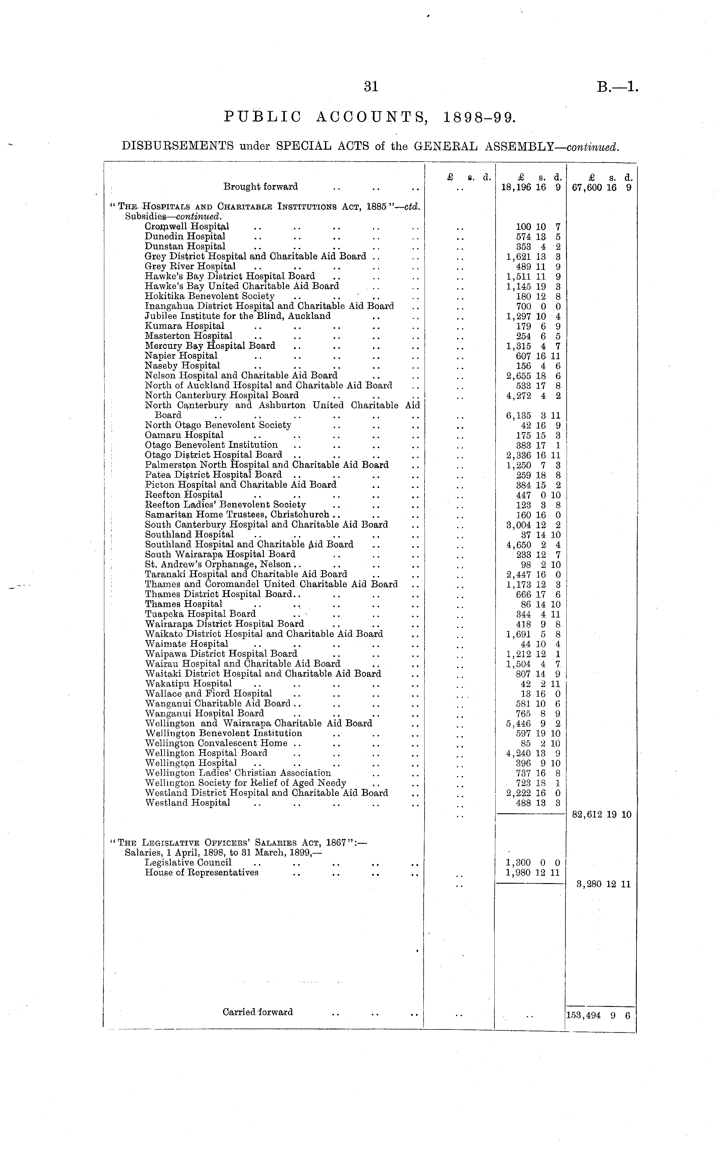 Brought forward ». £ s. d. 18,196 16 9 £ s. d. 67,600 16 9 " The Hospitals and Chaeitablf. Institutions Act, 1885 "—ctd. Subsidies— continued. Crornwell Hospital Dunedin Hospital Dunstan Hospital Grey District Hospital and Charitable Aid Board Grey River Hospital Hawke's Bay District Hospital Board Hawke's Bay United Charitable Aid Board Hokitika Benevolent Society Inangahua District Hospital and Charitable Aid Board Jubilee Institute for the Blind, Auckland Kumara Hospital Masterton Hospital Mercury Bay Hospital Board Napier Hospital Naseby Hospital Nelson Hospital and Charitable Aid Board North of Auckland Hospital and Charitable Aid Board North Canterbury Hospital Board North Canterbury and Ashburton United Charitable Aid Board North Otago Benevolent Society Oamaru Hospital Otago Benevolent Institution Otago District Hospital Board Palmerston North Hospital and Charitable Aid Board Patea District Hospital Board Picton Hospital and Charitable Aid Board Reefton Hospital Reefton Ladies' Benevolent Society Samaritan Home Trustees, Christchurch South Canterbury Hospital and Charitable Aid Board Southland Hospital Southland Hospital and Charitable Aid Board South Wairarapa Hospital Board St. Andrew's Orphanage, Nelson .. .. Taranaki Hospital and Charitable Aid Board Thames and Coromandel United Charitable Aid Board Thames District Hospital Board Thames Hospital .. ., Tuapeka Hospital Board Wairarapa District Hospital Board Waikato District Hospital and Charitable Aid Board Waimate Hospital Waipawa District Hospital Board Wairau Hospital and Charitable Aid Board Waitaki District Hospital and Charitable Aid Board Wakatipu Hospital Wallace and Fiord Hospital Wanganui Charitable Aid Board Wanganui Hospital Board .. Wellington and Wairarapa Charitable Aid Board Wellington Benevolent Institution Wellington Convalescent Home Wellington Hospital Board .. .. Wellington Hospital Wellington Ladies' Christian Association Wellington Society for Relief of Aged Needy Westland District Hospital and Charitable Aid Board Westland Hospital i 100 10 7 574 13 5 353 4 2 1,621 13 3 489 11 9 1,511 11 9 1,145 19 3 180 12 8 700 0 0 1,297 10 4 179 6 9 254 6 5 1,315 4 7 607 16 11 156 4 6 2,655 18 6 533 17 8 4,272 4 2 6,135 3 11 42 16 9 175 15 3 383 17 1 2,336 16 11 1,250 7 3 259 18 8 384 15 2 447 0 10 123 3 8 160 16 0 3,004 12 2 37 14 10 4,650 2 4 233 12 7 98 2 10 2,447 16 0 1,1.73 12 3 666 17 6 86 14 10 344 4 11 418 9 8 1,691 5 8 44 10 4 1,212 12 1 1,504 4 7 807 14 9 42 2 11 13 16 0 581 10 6 765 8 9 5,446 9 2 597 19 10 85 2 10 4,240 13 9 396 9 10 737 16 8 723 18 1 2,222 16 0 488 13 3 "The Legislative Officees' Salaeies Act, 1867": — Salaries, 1 April, 1898, to 31 March, 1899,— Legislative Council House of Representatives 82,612 19 10 1,300 0 0 1,980 12 11 3,280 12 11 Carried forward |153,494 9 6