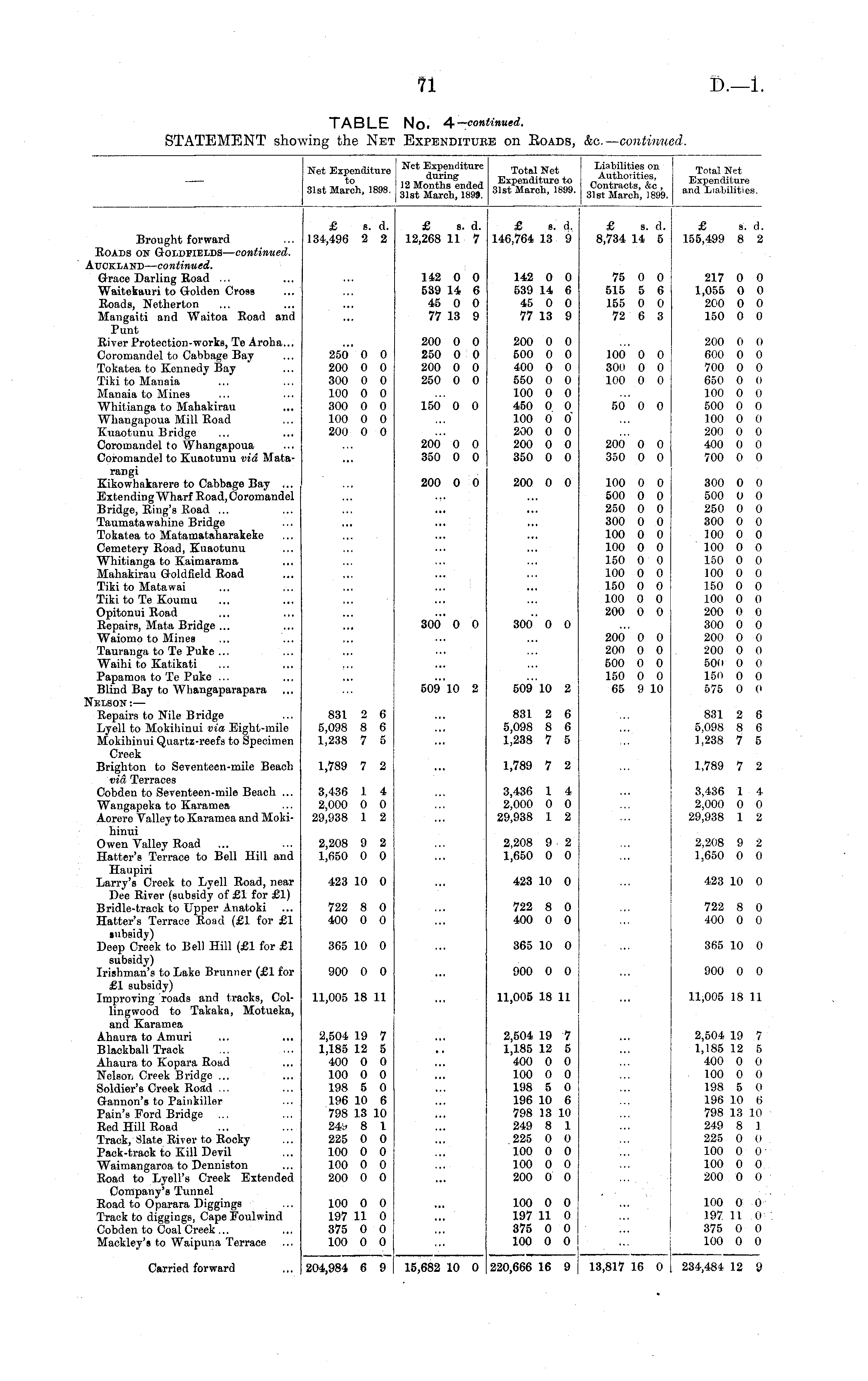 Net Expenditure to 31st March, 1898. Net Expenditure during 12 Months ended 31st March, 1899. Total Net Expenditure to 31st March, 1899. Liabilities on T . , N , 31st March, 1899. and L ' aMlt,es - Brought forward Roads on Goldpieeds— continued. Auckland — continued. Grace Darling Road ... Waitekauri to Golden Crosa Roads, Netherton Mangaiti and Waitoa Road and Punt River Protection-works, Tβ Aroha... Coromandel to Cabbage Bay Tokatea to Kennedy Bay Tiki to Manaia Manaia to Mines Whitianga to Mahakirau Whangapoua Mill Road Kuaotunu Bridge Coromandel to Whangapoua Coromandel to Kuaotunu via Matarangi Kikowhakarere to Cabbage Bay ... Extending Wharf Road, Coromandel Bridge, Ring's Road ... Taumatawahine Bridge Tokatea to Matamataharakeke Cemetery Road, Kuaotunu Whitianga to Kaimarama Mahakirau Goldfield Road Tiki to Matawai Tiki to Te Koumu Opitonui Road Repairs, Mata Bridge ... Waiomo to Mines Tauranga to Te Puke ... Waihi to Katikati Papamoa to Te Puke ... Blind Bay to Whangaparapara Nelson" : — Repairs to Nile Bridge Lyell to Mokiln'nui via Eight-mile Mokihinui Quartz-reefs to Specimen Creek Brighton to Seventeen-mile Beach via Terraces Cobden to Seventeen-mile Beach ... Wangapeka to Karamea Aorere Valley to Karamea and Mokihinui Owen Valley Road Hatter's Terrace to Bell Hill and Haupiri Larry's Creek to Lyell Road, near Dee River (subsidy of £1 for £1) Bridle-track to Upper Anatoki Hatter's Terrace Road (£1 for £1 »ubsidy) Deep Creek to Bell Hill (£1 for £1 subsidy) Irishman's to Lake Brunner (£1 for £1 eubsidy) Improving roads and tracks, Collingwood to Takaka, Motueka, and Karamea Ahaura to Amuri Blackball Track Ahaura to Kopara Road Nelsor; Creek Bridge ... Soldier's Creek Rotfd ... Gannon's to Painkiller Pain's Ford Bridge Red Hill Road Track, Slate River to Rocky Pack-track to Kill Devil Waimangaroa to Denniston Road to Lyell's Creek Extended Company's Tunnel Road to Oparara Diggings Track to diggings, Cape Foulwind Cobden to Coal Creek ... Maekley's to Waipuna Terrace £ s. d. 134,496 2 2 £ s. d. 12,268 11 7 £ s. d. 146,764 13 9 £ s. d. 8,734 14 5 £ s. d. 155,499 8 2 142 0 0 539 14 6 45 0 0 77 13 9 142 0 0 539 14 6 45 0 0 77 13 9 75 0 0 515 5 6 155 0 0 72 6 3 217 0 0 1,055 0 0 200 0 0 150 0 0 250 0 0 200 0 0 300 0 0 100 0 0 300 0 0 100 0 0 200 0 0 200 0 0 250 0 0 200 0 0 250 0 0 150 0 0 200 0 0 500 0 0 400 0 0 550 0 0 100 0 0 450 0 0 100 0 0 200 0 0 200 0 0 350 0 0 100 0 0 300 0 0 100 0 0 50 0 0 200 0 0 600 0 0 700 0 0 650 0 0 100 0 0 500 0 0 100 0 0 200 0 0 400 0 0 700 0 0 200 0 0 350 0 0 200 0 0 350 0 0 200 0 0 200 0 0 100 0 0 500 0 0 250 0 0 300 0 0 100 0 0 100 0 0 150 0 0 100 0 0 150 0 0 100 0 0 200 0 0 300 0 0 500 0 0 250 0 0 300 0 0 100 0 0 100 0 0 150 0 0 100 0 0 150 0 0 100 0 0 200 0 0 300 0 0 200 0 0 200 0 0 500 0 0 150 0 0 575 0 0 300' 0 0 300" 0 0 200 0 0 200 0 0 500 0 0 150 0 0 65 9 10 509" 10 2 509 10 2 831 2 6 5,098 8 6 1,238 7 5 831 2 6 5,098 8 6 1,238 7 5 831 2 6 5,098 8 6 1,238 7 5 1,789 7 2 1,789 7 2 1,789 7 2 3,436 1 4 2,000 0 0 29,938 1 2 3,436 1 4 2,000 0 0 29,938 1 2 3,436 1 4 2,000 0 0 29,938 1 2 2,208 9 2 1,650 0 0 2,208 9 2 1,650 0 0 2,208 9 2 1,650 0 0 423 10 0 423 10 0 423 10 0 722 8 0 400 0 0 722 8 0 400 0 0 722 8 0 400 0 0 365 10 0 365 10 0 365 10 0 900 0 0 900 0 0 900 0 0 11,005 18 11 11,005 18 11 11,005 18 11 2,504 19 7 1,185 12 5 400 0 0 100 0 0 198 5 0 196 10 6 798 13 10 24i> 8 1 225 0 0 100 0 0 100 0 0 200 0 0 2,504 19 7 1,185 12 5 400 0 0 100 0 0 198 5 0 196 10 6 798 13 10 249 8 1 225 0 0 100 0 0 100 0 0 200 0 0 2,504 19 7 1,185 12 5 400 0 0 100 0 0 198 5 0 196 10 6 798 13 10 249 8 1 225 0 0 100 0 0 100 0 0 200 0 0 100 0 0 197 11 0 375 0 0 100 0 0 100 0 0 197 11 0 375 0 0 100 0 0 100 0 0 197 11 0 375 0 0 100 0 0 Carried forward 204.984 6 9 15,682 10 0 220,666 16 9 13,817 16 0 234,484 12 9