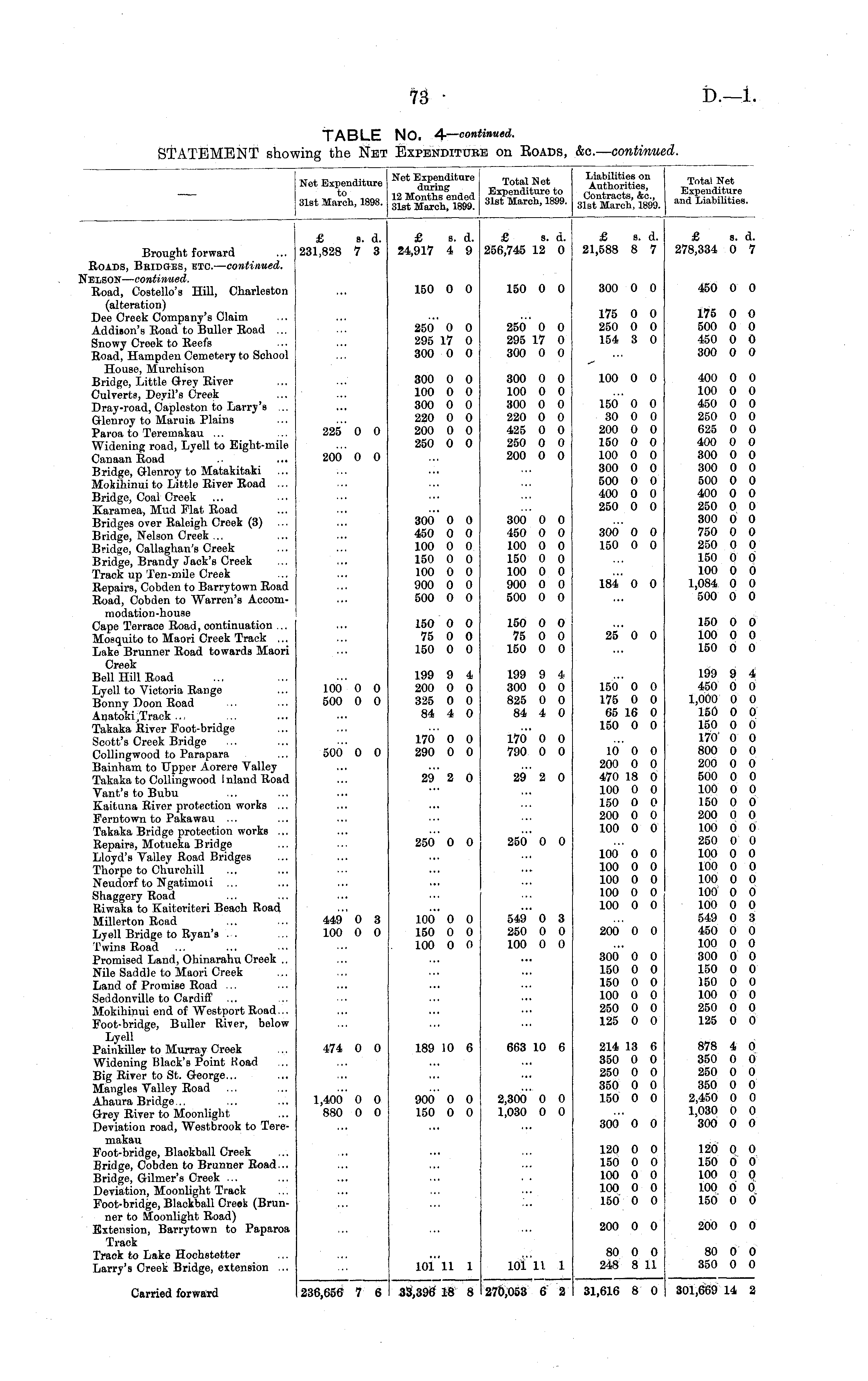Net Expenditure to 31et March, 1898. Net Expenditure during 12 Months ended 31st March, 1899. Total Net Expenditure to 31st March, 1899. Liabilities on Authorities, Contracts, &c, 31st March, 1899. Total Net Expenditure and Liabilities. Brought forward Roads, Bsid&es, etc. — continued. Nelson — continued. Road, Costello's Hill, Charleston (alteration) Dee Creek Company's Claim Addieon'a Road to Buller Road ... Snowy Creek to Reefs Road, Hampden Cemetery to School House, Murchison Bridge, Little Grey River Culverts, Devil's Creek Dray-road, Capleston to Larry's ... Gt-lenroy to Maruia Plains Paroa to Teremakau ... Widening road, Lyell to Bight-mile Canaan Road .. ... Bridge, Glenroy to Matakitaki Mokihinui to Little River Road ... Bridge, Coal Creek Karamea, Mud Plat Road Bridges over Raleigh Creek (3) ... Bridge, Nelson Creek ... Bridge, Callaghan's Creek Bridge, Brandy Jack's Creek Track up Ten-mile Creek Repairs, Cobden to Barrytown Road Road, Cobden to Warren's Accom-modation-house Cape Terrace Road, continuation ... Mosquito to Maori Creek Track .., Lake Brunner Road towards Maori Creek Bell Hill Road Lyell to Victoria Range Bonny Doon Road Anatoki .Track ... Takaka River Foot-bridge Scott's Creek Bridge Collingwood to Parapara Bainham to Upper Aorere Valley Takaka to Collingwood Inland Road Vant's to Bubu Kaituna River protection works ... Ferntown to Pakawau ... Takaka Bridge protection works ... Repairs, Motueka Bridge Lloyd's Valley Road Bridges Thorpe to Churchill Neudorf to Ngatinioii Shaggery Road Riwaka to Kaiteriteri Beach Road Millerton Road Lyell Bridge to Ryan's . . Twins Road Promised Land, Ohinarahu Creek .. Nile Saddle to Maori Creek Land of Promise Road ... Seddonville to Cardiff Mokihinui end of Westport Road... Foot-bridge, Buller River, below Lyell Painkiller to Murray Creek Widening Black's Point Koad Big River to St. George... Mangles Valley Road Ahaura Bridge .. Grey River to Moonlight Deviation road, Westbrook to Teremakau Foot-bridge, Blaokball Creek Bridge, Cobden to Brunner Road... Bridge, Gilmer's Creek ... Deviation, Moonlight Track Foot-bridge, Blackball Creek (Brunner to Moonlight Road) Extension, Barrytown to Paparoa Track Track to Lake Hoehstetter Larry's Creek Bridge, extension ... £ s. d. 231,828 7 3 £ s. d. 24,917 4 9 £ 8. d. 256,745 12 0 £ e. d. 21,588 8 7 £ S. d. 278,334 0 7 150 0 0 150 0 0 300 0 0 450 0 0 250 0 0 295 17 0 300 0 0 250 0 0 295 17 0 300 0 0 175 0 0 250 0 0 154 3 0 175 0 0 500 0 0 450 0 0 300 0 0 300 0 0 100 0 0 300 0 0 220 0 0 200 0 0 250 0 0 300 0 0 100 0 0 300 0 0 220 0 0 425 0 0 250 0 0 200 0 0 100 0 0 150 0 0 30 0 0 200 0 0 150 0 0 100 0 0 300 0 0 500 0 0 400 0 0 250 0 0 400 0 0 100 0 0 450 0 0 250 0 0 625 0 0 400 0 0 300 0 0 300 0 0 500 0 0 400 0 0 250 0 0 300 0 0 750 0 0 250 0 0 150 0 0 100 0 0 1,084 0 0 500 0 0 225 0 0 200 0 0 300 0 0 450 0 0 100 0 0 150 0 0 100 0 0 900 0 0 500 0 0 300 0 0 450 0 0 100 0 0 150 0 0 100 0 0 900 0 0 500 0 0 300 0 0 150 0 0 184" 0 0 150 0 0 75 0 0 150 0 0 150 0 0 75 0 0 150 0 0 25' 0 0 150 0 0 100 0 0 150 0 0 100 0 0 500 0 0 199 9 4 200 0 0 325 0 0 84 4 0 199 9 4 300 0 0 825 0 0 84 4 0 150 0 0 175 0 0 65 16 0 150 0 0 199 9 4 450 0 0 1,000 0 0 150 0 0 150 0 0 170 0 0 800 0 0 200 0 0 500 0 0 100 0 0 150 0 0 200 0 0 100 0 0 250 0 0 100 0 0 100 0 0 100 0 0 100 0 0 100 0 0 549 0 3 450 0 0 100 0 0 300 0 0 150 0 0 150 0 0 100 0 0 250 0 0 125 0 0 500 0 0 170 0 0 290 0 0 170 0 0 790 0 0 10 0 0 200 0 0 470 18 0 100 0 0 150 0 0 200 0 0 100 0 0 29 2 0 29 2 0 250 0 0 250 0 0 100 0 0 100 0 0 100 0 0 100 0 0 100 0 0 449 0 3 100 0 0 100 0 0 150 0 0 100 0 0 549 0 3 250 0 0 100 0 0 200 0 0 300 0 0 150 0 0 150 0 0 100 0 0 250 0 0 125 0 0 474 0 0 189 10 6 663 10 6 214 13 6 350 0 0 250 0 0 350 0 0 150 0 0 878 4 0 350 0 0 250 0 0 350 0 0 2,450 0 0 1,030 0 0 300 0 0 1,400 0 0 880 0 0 900 0 0 150 0 0 2,300 0 0 1,030 0 0 300 0 0 120 0 0 150 0 0 100 0 0 100 0 0 150 0 0 120 0 0 150 0 0 100 0 0 100 0 0 150 0 0 200 0 0 200 0 0 lOl'll 1 101 11 1 80 0 0 248 8 11 80 0 0 350 0 0 Carried forward 236,656 7 6 33,396 18 8 270,053 6 2 31,616 8 0 301,669 14 2