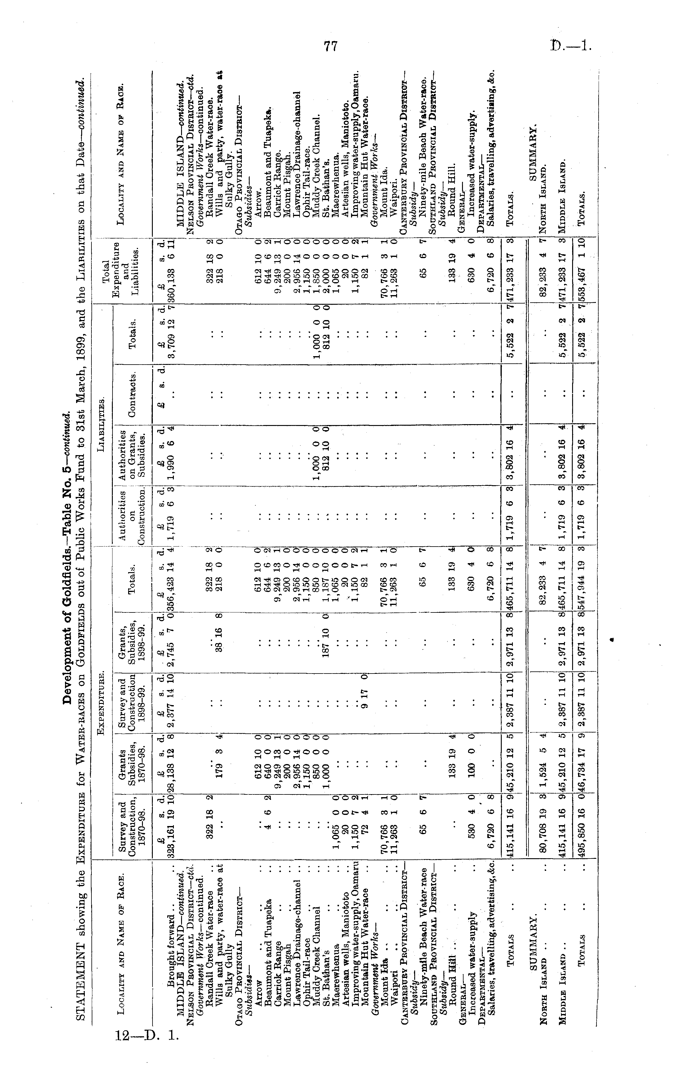 Expenditure. Liabilities. Locality and Name of Race. Survey and Construction, 1870-98. Grants Subsidies, 1870-98. Survey and Construction 1898-99. Grants, Subsidies, 1898-99. Authorities j Authorities on on Grants, :Construction. Subsidies. Total Expenditure and Liabilities. Locality and Name op Race. Totals. Contracts. Totals. £ s. d. 323,161 19 10 £ s. d. 28,138 12 8 £ s. d. 2,377 14 10 . £ s. d. 2,745 7 0 £ s. d. 356,423 14 4 £ s. d. £ a. d. 1,719 6 3 1,990 6 4 £ s. d. £ s. d. 3,709 12 7 £ s. d. 360,133 6 11 Brought forward MIDDLE ISLAND— continued. Nelson Pbovincial District — ctd. Government Works —continued. Randall Creek Water-race Will3 and party, water-race at Sulky Gully Otago Pbovincial District — Subsidies — Arrow Beaumont and Tuapeka Carriok Range Mount Pisgah Lawrence Drainage-channel .. Ophir Tail-race Muddy Greek Channel St. Bathan's Maerewhenua Artesian wells, Maniototo Improving water-supply, Oamaru Mountain Hut Water-race Government Works — Mount Ha .. .. • .. Waipori Canterbuby Provincial District — Subsidy — Ninety-mile Beach Water-race Southland Provincial Disteict — Subsidy — Round Hill General — Increased water-supply Departmental — Salaries, travelling, advertising, &c. 322 18 2 46 2 1,065 0 0 20 0 0 1,150 7 2 72 4 1 179 3 4 612 10 0 640 0 0 9,249 13 1 200 0 0 2,956 14 0 1,150 0 0 850 0 0 1,000 0 0 i - - - 3816 8 - .. 187 10 Oj 322 18 2i 218 0 Oj 612 10 0 644 6 2 9,249 13 1 200 0 0 2,956 14 0 1,150 0 0 850 0 0 1,187 10 0 1,065 0 0 20 0 0 1,150 7 2 82 1 1 .. .. '.'. 1,006' o o 812 10 0 .. 1,000 0 0 812 10 0 322 18 2 218 0 0 612 10 01 644 6 2 9,249 13 1 200 0 Oj 2,956 14 0 1,150 0 0 1,850 0 0 2,000 0 0 1,065 0 0 20 0 0 1,150 7 2 82 1 1 MIDDLE ISLAND— continued. Nelson Provincial Distbict— ctd. Government Works —continued. Randall Creek Water-raoe. Wills and party, water-raoe at Sulky Gully. Otago Provincial District — Subsidies — Arrow. Beaumont and Tuapeka. Carrick Range. Mount Pisgah. Lawrence Drainage-ohannel Ophir Tail-race. Muddy Creek Channel. St. Bathan's. Maerewhenua. Artesian wells, Maniototo. Improving water-supply, Oamaru. Mountain Hut Water-raoe. Government Works — Mount Ida. Waipori. Canterbury Provincial District — Subsidy — Ninety-mile Beaoh Water-race. Southland Provincial District — Subsidy — Round Hill. General— Increased water-supply. Departmental — Salaries, travelling, advertising, &o. .. 917 0 " 70,766 3 1 11,263 1 0 70,766 3 1 11,263 1 0 •• 70.766 3 1 11,263 1 0 65 6 7 I 65 6 7 I I 65 6 7 133 19 4 133 19 4 .. .. 133 19 4 530 4 0 100 0 0 630 4 0 .. .. 630 4 0 6,720 6 8 ■ • 6,720 6 8 I •• - •• 6,720 6 8 471,233 17 3 Totals I 1,719 6 3 3,802 16 4 5,522 2 7 Totals. 415,141 16 9 45,210 12 5 2,387 11 10 2,971 13 8 465,711 14 8 .. SUMMARY. North Island SUMMARY. North Island. 80,708 19 31 I 1,524 5 4j •• 82,233 4 7 •• •• 82,233 4 7 Middle Island 415,141 16 9 45,210 12 5 2,387 11 101 2,971 13 8 465,711 14 8 1,719 6 3 3,802 16 5,522 2 7 471,233 17 3 Middle Island. Totals 495,850 16 0 46,734 17 9 2,971 13 8 547,944 19 3 1,719 6 3 3,802 16 4 Totals. 2,387 11 10 • • 5,522 2 7 .53,467 1 10