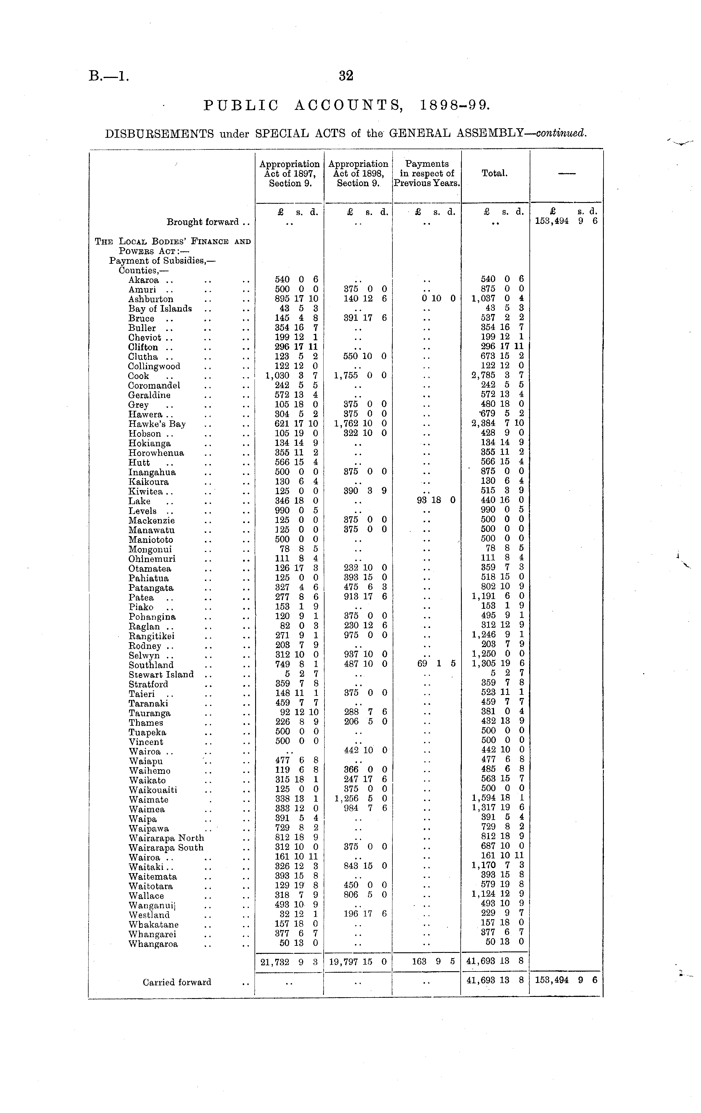 Appropriation Act of 1897, Section 9. Appropriation Act of 1898, Section 9. Payments in respect of Previous Years. Total. Brought forward .. £ s. d. £ s. d. £ s. d. £ s. d. £ s. d. 153,494 9 6 'he Local Bodies' Finance and Powees Act :— Payment of Subsidies, — Counties,— Akaroa Amuri Ashburton Bay of Islands Bruce Buller .. Cheviot Clifton .. Clutha .. CoUingwood Cook Coromandel Geraldine Grey Hawera Hawke's Bay Hobson Hokianga Horowhenua Hutt Inangahua Kaikoura Kiwitea Lake Levels Mackenzie Manawatu Maniototo Mongonui Ohinemuri Otamatea Pahiatua Patangata Patea Piako Pohangina Raglan Rangitikei Rodney Selwyn Southland Stewart Island Stratford Taieri Taranaki Tauranga Thames Tuapeka Vincent Wairoa Waiapu Waihemo Waikato Waikouaiti Waimate Waimea Waipa Waipawa .. ' Wairarapa North Wairarapa South Wairoa Waitaki Waitemata Waitotara Wallace Wanganuij Westland Whakatane Whangarei Whangaroa 540 0 6 500 0 0 895 17 10 43 5 3 145 4 8 354 16 7 199 12 1 296 17 11 123 5 2 122 12 0 1,030 3 7 242 5 5 572 13 4 105 18 0 304 5 2 621 17 10 105 19 0 134 14 9 355 11 2 566 15 4 500 0 0 130 6 4 125 0 0 346 18 0 990 0 5 125 0 0 125 0 0 500 0 0 78 8 5 111 8 4 126 17 3 125 0 0 327 4 6 277 8 6 153 1 9 120 9 1 82 0 3 271 9 1 203 7 9 312 10 0 749 8 1 5 2 7 359 7 8 148 11 1 459 7 7 92 12 10 226 8 9 500 0 0 500 0 0 375' 0 0 140 12 6 391 17 6 550 10 0 1,755 0 0 375 0 0 375 0 0 1,762 10 0 322 10 0 375 0 0 390 3 9 375' 0 0 375 0 0 232 10 0 393 15 0 475 6 3 913 17 6 0 10 0 93~18 0 J 540 0 6 875 0 0 1,037 0 4 43 5 3 537 2 2 354 16 7 199 12 1 296 17 11 673 15 2 122 12 0 2,785 3 7 242 5 5 572 13 4 480 18 0 '679 5 2 2,384 7 10 428 9 0 134 14 9 355 11 2 566 15 4 ' 875 0 0 130 6 4 515 3 9 440 16 0 990 0 5 500 0 0 500 0 0 500 0 0 78 8 5 111 8 4 359 7 3 518 15 0 802 10 9 1,191 6 0 153 1 9 495 9 1 312 12 9 1,246 9 1 203 7 9 1,250 0 0 1,305 19 6 5 2 7 359 7 8 523 11 1 459 7 7 381 0 4 432 13 9 500 0 0 500 0 0 442 10 0 477 6 8 485 6 8 563 15 7 500 0 0 1,594 18 1 1,317 19 6 391 5 4 729 8 2 812 18 9 687 10 0 161 10 11 1,170 7 3 393 15 8 579 19 8 1,124 12 9 493 10 9 229 9 7 157 18 0 377 6 7 50 13 0 375 0 0 230 12 6 975 0 0 937'10 0 487 10 0 69 1 5 375' 0 0 288' 7 6 206 5 0 442'10 0 477 6 8 119 6 8 315 18 1 125 0 0 338 13 1 333 12 0 391 5 4 729 8 2 812 18 9 312 10 0 161 10 11 326 12 3 393 15 8 129 19 8 318 7 9 493 10 9 32 12 1 157 18 0 377 6 7 50 13 0 366 0 0 247 17 6 375 0 0 1,256 5 0 984 7 6 375' 0 0 843 15 0 450 0 0 806 5 0 196 17 6 21,732 9 3 19,797 15 0 163 9 5 41,693 13 8 fla.wlort fr»rw«rri . . 41,693 13 8 153,494 9 6