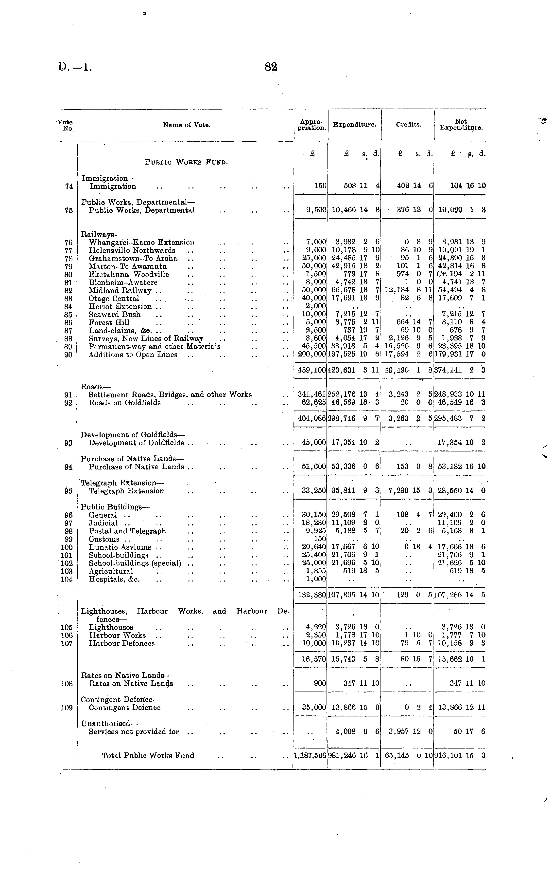 I V No Name of Vote. p^ n . Expenditure. Credits. Expe^ ture . ! J £ £ s. d. £ s. d. £ s. d. Public Works Fund. Immigration— 74 Immigration .. .. .. .. .. 150 508 11 4 403 14 6 104 16 10 Public Works, Departmental— 75 Public Works, Departmental .. .. .. 9,500 10,466 14 3 376 13 0 10,090 1 3 Railways:— 76 Whangarei-Kamo Extension .. .. .. 7,000 3,932 2 6 0 8 9 3,931 13 9 77 Helensville Northwards .. .. .. .. 9,000 10,178 910 86 10 9 10,09119 1 78 Grahamstown-Te Aroha .. .. .. .. 25,000 24,485 17 9 95 1 6 24,390 16 3 79 Marton-Te Awamutu .. .. .. .. 50,000 42,915 18 2 101 1 6 42,814 16 8 80 Eketahuna-Woodville .. .. .. .. 1,500 779 17 8 974 0 7 Cr. 194 2 11 81 Blenheim-Awatere .. .. .. .. 8,000 4,742 13 7 10 0 4,741 13 7 82 Midland Railway .. .. .. .. .. 50,000 66,678 13 7 12,184 811 54,494 4 8 83 Otago Central .. .. .. .. .. 40,000 17,69113 9 82 6 8 17,609 7 1 84 Heriot Extension .. .. .. .. .. 2,000 85 Seaward Bush .. .. .. .. .. 10,000 7,215 12 7 .. 7,215 12 7 86 Forest Hill .. .. ' .. .. .. 5,000 3,775 211 664 14 7 3,110 8 4 87 Land-claims, &c. .. .. .. .. .. 2,500 737 19 7 59 10 0 678 9 7 88 Surveys, New Lines of Railway .. .. .. 3,600 4,054 17 2 2,126 9 5 1,928 7 9 89 Permanent-way and other Materials .. .. 45,500 38,916 5 4 15,520 6 6 23,395 18 10 90 Additions to Open Lines .. .. .. .. 200,000197,525 19 6 17,594 2 6179,93117 0 459,100 423,631 3 11 49,490 1 8 374,141 2 3 Roads— 91 Settlement Roads, Bridges, and other Works .. 341,461252,176 13 4 3,243 2 5 248,933 10 11 92 Roads on Goldfields .. .. .. .. 62,625 46,569 16 3 20 0 0 46,549 16 3 404,086 298,746 9 7 3,263 2 5 295,483 7 2 Development of Goldfields — 93 Development of Goldfields .. .. .. .. 45,000 17,354 10 2 .. 17,354 10 2 Purchase of Native Lands — 94 Purchase of Native Lands .. .. .. .. 51,600 53,336 0 6 153 3 8 53,182 16 10 Telegraph Extension — 95 Telegraph Extension .. .. !.. .. 33,250 35,841 9 3 7,290 15 3 28,550 14 0 Public Buildings— 96 General .. .. .. .. .. .. 30,150 29,508 7 1 108 4 7 29,400 2 6 97 Judicial .. .. .. .. .. .. 18,230 11,109 2 0 .. 11,109 2 0 98 Postal and Telegraph .. .. .. .. 9,925 5,188 5 7 20 2 6 5,168 3 1 99 Customs .. .. .. .. .. .. 150 100 Lunatic Asylums .. .. .. '.. .. 20,640 17,667 610 013 4 17,666 13 6 101 School-buildings .. .. .. .. .. 25,400 21,706 9 1 .. 21,706 9 1 102 School-buildings (special) .. .. .. .. 25,000 21,696 510 .. 21,696 510 103 Agricultural .. .. .. .. .. 1,855 519 18 5 .. 519 18 5 104 Hospitals, &c. .. .. .. .. .. 1,000 132,380107,395 14 10 129 0 5107,266 14 5 Lighthouses, Harbour Works, and Harbour Defences— 105 Lighthouses .. .. .. .. .. 4,220 3,726 13 0 .. 3,726 13 0 106 Harbour Works .. .. .. .. .. 2,350 1,778 17 10 110 0 1,777 710 107 Harbour Defences .. .. .. .. 10,000 10,237 14 10 79 .5 7 10,158 9 3 16,570 15,743 5 8 80 15 7 15,662 10 1 Rates on Native Lands— 108 Rates on Native Lands .. .. .. ~ 900 347 11 10 .. 347 11 10 Contingent Defence — 109 Contingent Defence .. .. .. .. 35,000 13,866 15 3 0 2 4 13,866 12 11 Unauthorised— Services not provided for .. .. .. .. .. 4,008 9 6 3,957 12 0 50 17 6 Total Public Works Fund .. .. .. 1,187,536 981,246 16 1 65,145 0 10 916,10115 3