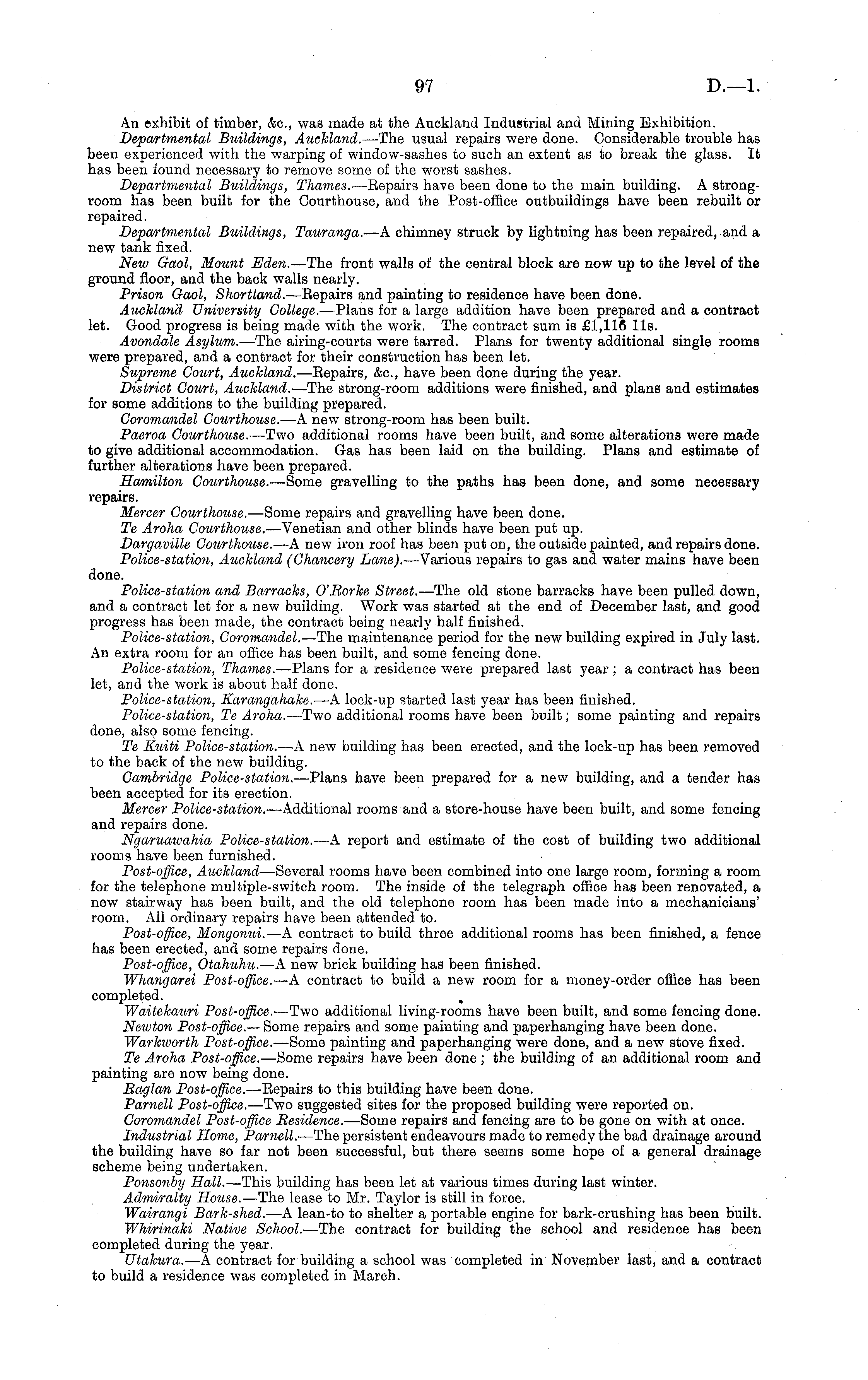An exhibit of timber, &c, was made at the Auckland Industrial and Mining Exhibition. Departmental Buildings, Auckland. —The usual repairs were done. Considerable trouble has been experienced with the warping of window-sashes to such an extent as to break the glass. It has been found necessary to remove some of the worst sashes. Departmental Buildings, Thames. —Eepairs have been done to the main building. A strongroom has been built for the Courthouse, and the Post-office outbuildings have been rebuilt or repaired. Departmental Buildings, Tauranga. —A chimney struck by lightning has been repaired, and a new tank fixed. New Gaol, Mount Eden. —The front walls of the central block are now up to the level of the ground floor, and the back walls nearly. Prison Gaol, Shortland. —Eepairs and painting to residence have been done. Auckland University College. — Plans for a large addition have been prepared and a contract let. Good progress is being made with the work. The contract sum is £1,116 11s. Avondale Asylum. —The airing-courts were tarred. Plans for twenty additional single rooms were prepared, and a contract for their construction has been let. Supreme Court, Auckland. —Eepairs, &c, have been done during the year. District Court, Auckland. —The strong-room additions were finished, and plans and estimates for some additions to the building prepared. Goromandel Courthouse. —A new strong-room has been built. Paeroa Courthouse. —Two additional rooms have been built, and some alterations were made to give additional accommodation. Gas has been laid on the building. Plans and estimate of further alterations have been prepared. Hamilton Courthouse. —Some gravelling to the paths has been done, and some necessary repairs. Mercer Courthouse. —Some repairs and gravelling have been done. Te Aroha Courthouse. —Venetian and other blinds have been put up. Dargaville Courthouse. —A new iron roof has been put on, the outside painted, and repairs done. Police-station, Auckland (Chancery Lane). —Various repairs to gas and water mains have been done. Police-station and Barracks, O'Borke Street. —The old stone barracks have been pulled down, and a contract let for a new building. Work was started at the end of December last, and good progress has been made, the contract being nearly half finished. Police-station, Coromandel.—The maintenance period for the new building expired in July last. An extra room for an office has been built, and some fencing done. Police-station, Thames. —Plans for a residence were prepared last year; a contract has been let, and the work is about half done. Police-station, Karangahake. —A lock-up started last year has been finished. Police-station, Te Aroha. —Two additional rooms have been built; some painting and repairs done, also some fencing. Te Kuiti Police-station. —-A new building has been erected, and the lock-up has been removed to the back of the new building. Cambridge Police-station. —Plans have been prepared for a new building, and a tender has been accepted for its erection. Mercer Police-station. —Additional rooms and a store-house have been built, and some fencing and repairs done. Ngaruawahia Police-station. —A report and estimate of the cost of building two additional rooms have been furnished. Post-office, Auckland —Several rooms have been combined into one large room, forming a room for the telephone multiple-switch room. The inside of the telegraph office has been renovated, a new stairway has been built, and the old telephone room has been made into a mechanicians' room. All ordinary repairs have been attended to. Post-office, Mongonui. —A contract to build three additional rooms has been finished, a fence has been erected, and some repairs done. Post-office, Otahuhu. —A new brick building has been finished. Whangarei Post-office. —A contract to build a new room for a money-order office has been completed. , Waitekauri Post-office. —Two additional living-rooms have been built, and some fencing done. Newton Post-office.— Some repairs and some painting and paperhanging have been done. Warkworth Post-office. —Some painting and paperhanging were done, and a new stove fixed. Te Aroha Post-office. —Some repairs have been done; the building of an additional room and painting are now being done. Raglan Post-office.— Eepairs to this building have been done. Parnell Post-office. —Two suggested sites for the proposed building were reported on. Coromandel Post-office Residence. —Some repairs and fencing are to be gone on with at once. Industrial Home, Parnell. —The persistent endeavours made to remedy the bad drainage around the building have so far not been successful, but there aeems some hope of a general drainage scheme being undertaken. Ponsonby Hall. —This building has been let at various times during last winter. Admiralty House. —The lease to Mr. Taylor is still in force. Wairangi Bark-shed. —A lean-to to shelter a portable engine for bark-crushing has been built. Whirinaki Native School.- —The contract for building the school and residence has been completed during the year. Utakura. —A contract for building a school was completed in November last, and a contract to build a residence was completed in March.