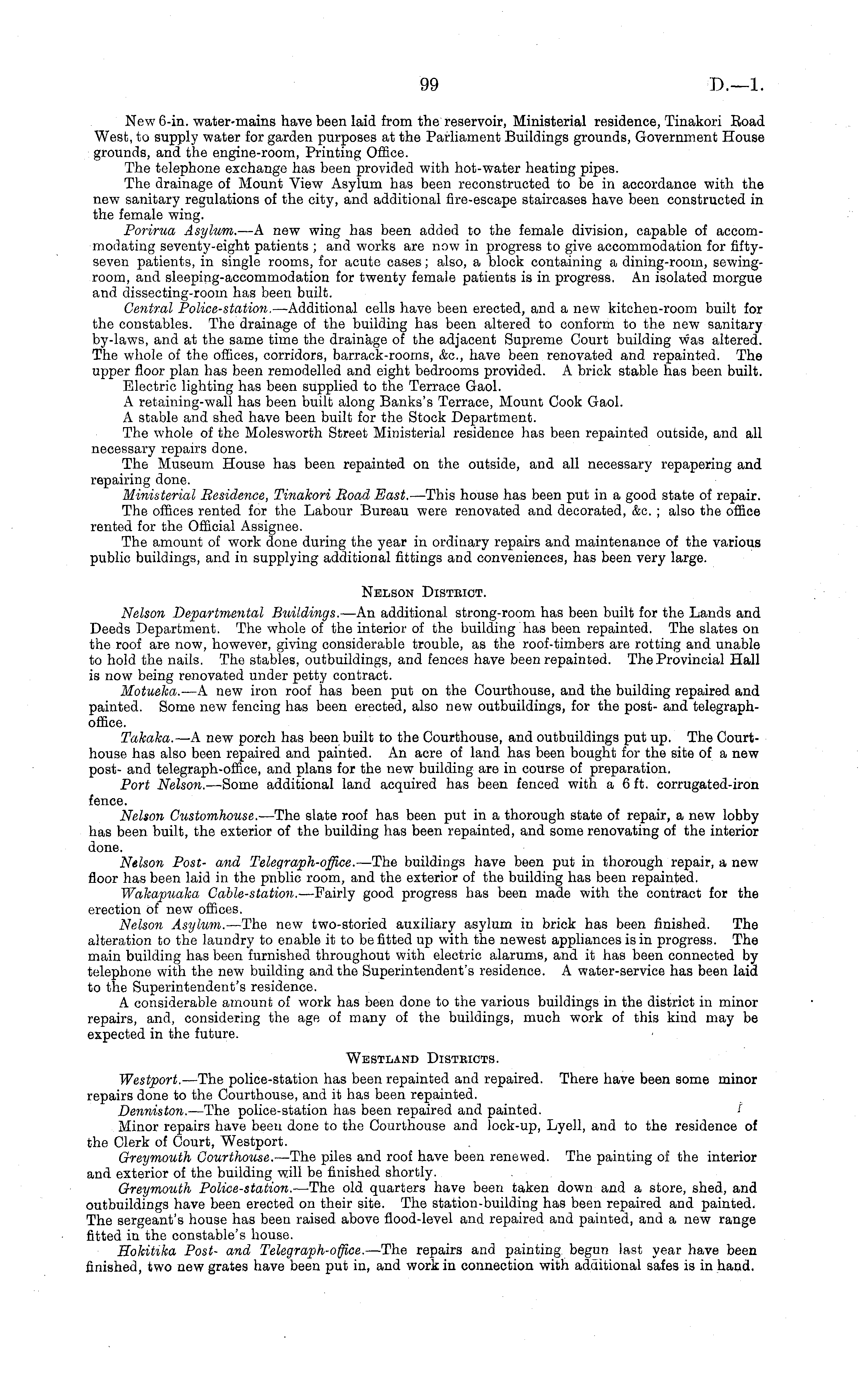 New 6-in. water-mains have been laid from the reservoir, Ministerial residence, Tinakori Eoad West, to supply water for garden purposes at the Parliament Buildings grounds, Government House grounds, and the engine-room, Printing Office. The telephone exchange has been provided with hot-water heating pipes. The drainage of Mount View Asylum has been reconstructed to be in accordance with the new sanitary regulations of the city, and additional fire-escape staircases have been constructed in the female wing. Porirua Asylum. —A new wing has been added to the female division, capable of accommodating seventy-eight patients ; and works are now in progress to give accommodation for fiftyseven patients, in single rooms, for acute cases; also, a block containing a dining-room, sewingroom, and sleeping-accommodation for twenty female patients is in progress. An isolated morgue and dissecting-room has been built. Central Police-station. —Additional cells have been erected, and a new kitchen-room built for the constables. The drainage of the building has been altered to conform to the new sanitary by-laws, and at the same time the drainage of the adjacent Supreme Court building was altered. The whole of the offices, corridors, barrack-rooms, &c, have been renovated and repainted. The upper floor plan has been remodelled and eight bedrooms provided. A brick stable has been built. Electric lighting has been supplied to the Terrace Gaol. A retaining-wall has been built along Banks's Terrace, Mount Cook Gaol. A stable and shed have been built for the Stock Department. The whole of the Molesworth Street Ministerial residence has been repainted outside, and all necessary repairs done. The Museum House has been repainted on the outside, and all necessary repapering and repairing done. Ministerial Residence, Tinakori Road East. —This house has been put in a good state of repair. The offices rented for the Labour Bureau were renovated and decorated, &c. ; also the office rented for the Official Assignee. The amount of work done during the year in ordinary repairs and maintenance of the various public buildings, and in supplying additional fittings and conveniences, has been very large. Nelson District. Nelson Departmental Buildings. —An additional strong-room has been built for the Lands and Deeds Department. The whole of the interior of the building has been repainted. The slates on the roof are now, however, giving considerable trouble, as the roof-timbers are rotting and unable to hold the nails. The stables, outbuildings, and fences have been repainted. The Provincial Hall is now being renovated under petty contract. Motueka. —A new iron roof has been put on the Courthouse, and the building repaired and painted. Some new fencing has been erected, also new outbuildings, for the post- and telegraphoffice. Takaka. —A new porch has been built to the Courthouse, and outbuildings put up. The Courthouse has also been repaired and painted. An acre of land has been bought for the site of a new post- and telegraph-office, and plans for the new building are in course of preparation. Port Nelson. —Some additional land acquired has been fenced with a 6 ft. corrugated-iron fence. Nelson Customhouse. —The slate roof has been put in a thorough state of repair, a new lobby has been built, the exterior of the building has been repainted, and some renovating of the interior done. Nelson Post- and Telegraph-office. —The buildings have been put in thorough repair, a new floor has been laid in the pnblic room, and the exterior of the building has been repainted. Wakapuaka Cable-station.— Fairly good progress has been made with the contract for the erection of new offices. Nelson Asylum. —The new two-storied auxiliary asylum in brick has been finished. The alteration to the laundry to enable it to be fitted up with the newest appliances is in progress. The main building has been furnished throughout with electric alarums, and it has been connected by telephone with the new building and the Superintendent's residence. A water-service has been laid to the Superintendent's residence. A considerable amount of work has been done to the various buildings in the district in minor repairs, and, considering the age of many of the buildings, much work of this kind may be expected in the future. Westland Districts . Westport. —The police-station has been repainted and repaired. There have been some minor repairs done to the Courthouse, and it has been repainted. Denniston. —The police-station has been repaired and painted. * Minor repairs have been done to the Courthouse and lock-up, Lyell, and to the residence of the Clerk of Court, Westport. Greymouth Courthouse. —The piles and roof have been renewed. The painting of the interior and exterior of the building will be finished shortly. Greymouth Police-station. —The old quarters have been taken down and a store, shed, and outbuildings have been erected on their site. The station-building has been repaired and painted. The sergeant's house has been raised above flood-level and repaired and painted, and a new range fitted in the constable's house. Hokitika Post- and Telegraph-office. —The repairs and painting begun last year have been finished, two new grates have been put in, and work in connection with additional safes is in hand.
